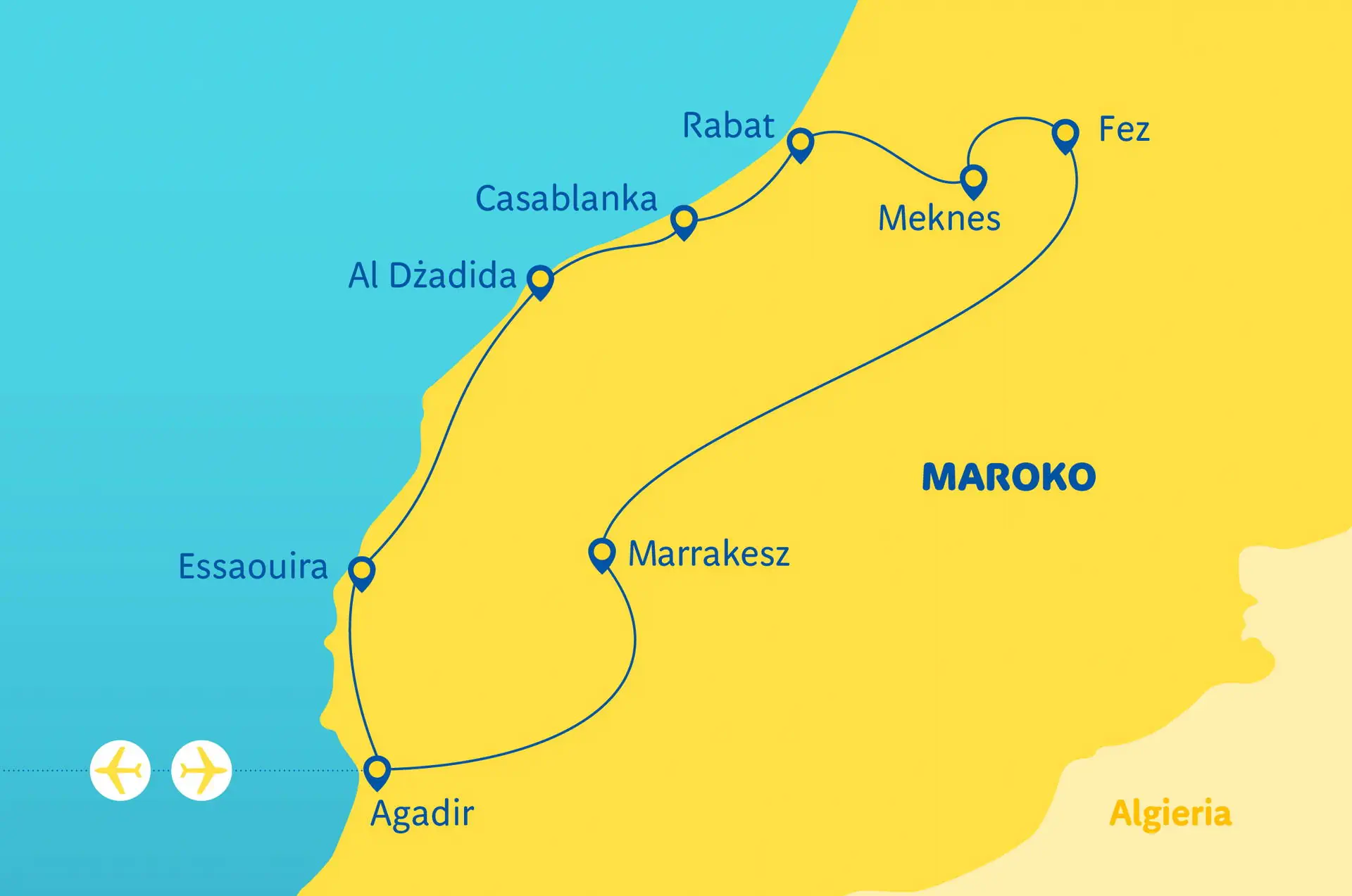 Do dyspozycji gości w hotelach z reguły restauracja, bar, kantor Wyżywienie śniadania i obiadokolacje Kategoria lokalna ****/***** Zakwaterowanie Eksluzywne hotele ****/ ***** - (7 rozpoczętych dób hotelowych). Pokoje: 2-, 3 - osobowe z łazienkami i wc. Uwaga!Dla chętnych za dopłatą istnieje możliwość przedłużenia imprezy o tydzień pobytu w Agadirze lub o drugą wycieczkę objazdową - Maroko Magiczne Południe. Opisy hoteli w dalszej części katalogu. Więcej propozycji w katalogu "Wypoczynek - Maroko" i w systemie rezerwacyjnym.