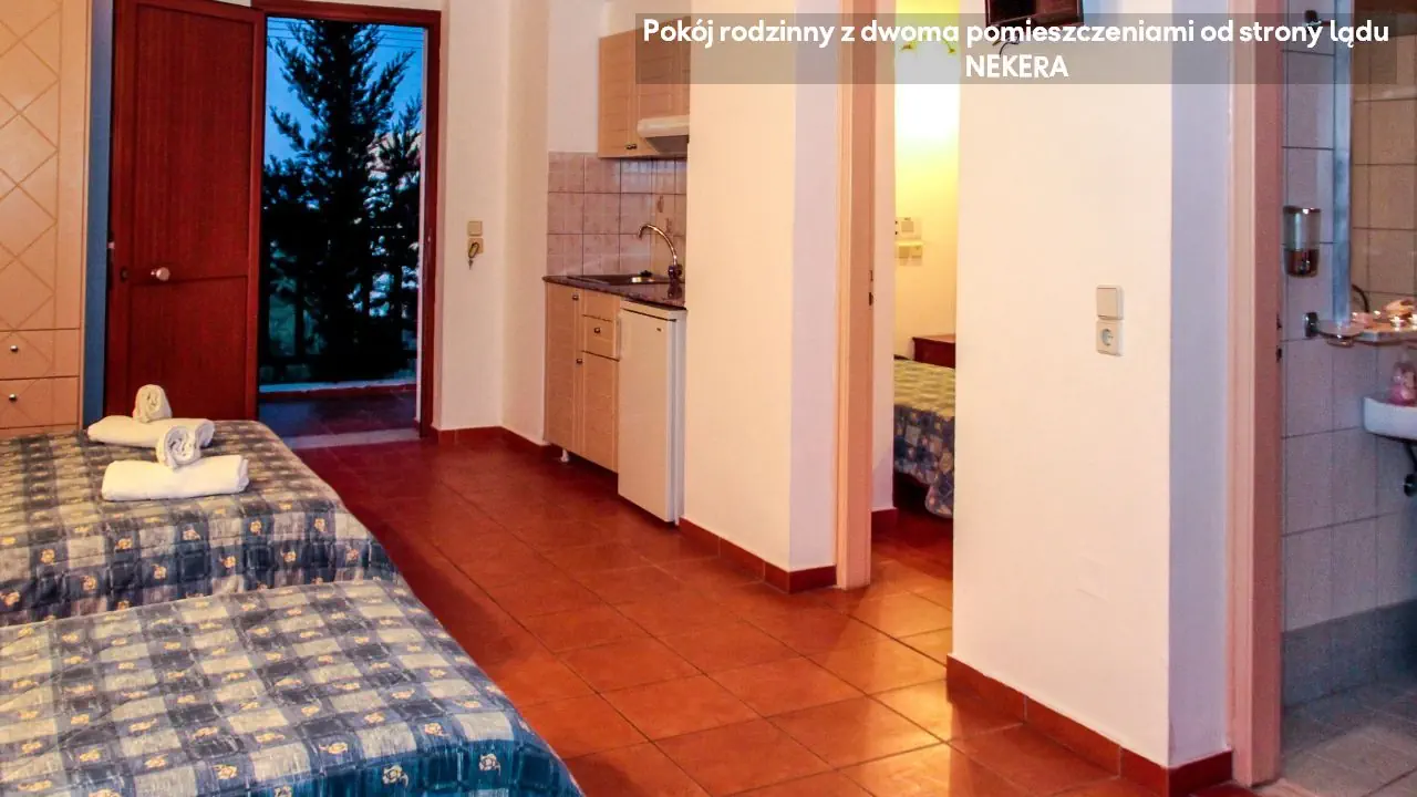 Pokój dwuosobowy Promo DOUBLE ROOM (Promo): ok. 30 m2, mogący zakwaterować do czterech osób; jedno łóżko podwójne/ dwa łóżka pojedyncze/ łóżko piętrowe; klimatyzacja (w cenie), TV, radio, sejf (w cenie), mała lodówka, prywatna łazienka (prysznic/ wanna, toaleta), balkon lub taras z widokiem na basen lub ogród. Pokój dwuosobowy z widokiem na basen/ ogród DOUBLE ROOM POOL/ GARDEN VIEW: ok. 30 m2, mogący zakwaterować do czterech osób; jedno łózko podwójne lub dwa łóżka pojedyncze; balkon lub taras z widokiem na ogród lub basen; poza tym wyposażony jak pokój dwuosobowy Promo DOUBLE ROOM (Promo). Maisonetta rodzinna od strony lądu FAMILY ROOM MAISONTTE STYLE LAND VIEW: ok. 40 m2, mogący zakwaterować do czterech osób; pokój piętrowy – na parterze łazienka i jedna sypialnia na piętrze sypialnia główna i balkon od strony lądu; poza tym wyposażony jak pokój dwuosobowy Promo DOUBLE ROOM (Promo). Pokój rodzinny z dwoma sypialniami z widokiem na ląd lub ogród FAMILY 2 BEDROOM LAND/GARDEN VIEW: ok. 40 m2, mogący zakwaterować do pięciu osób; pokój składa się z dwóch sypialni i balkonu z widokiem na ogród lub ląd; poza tym wyposażony jak pokój dwuosobowy Promo DOUBLE ROOM (Promo).