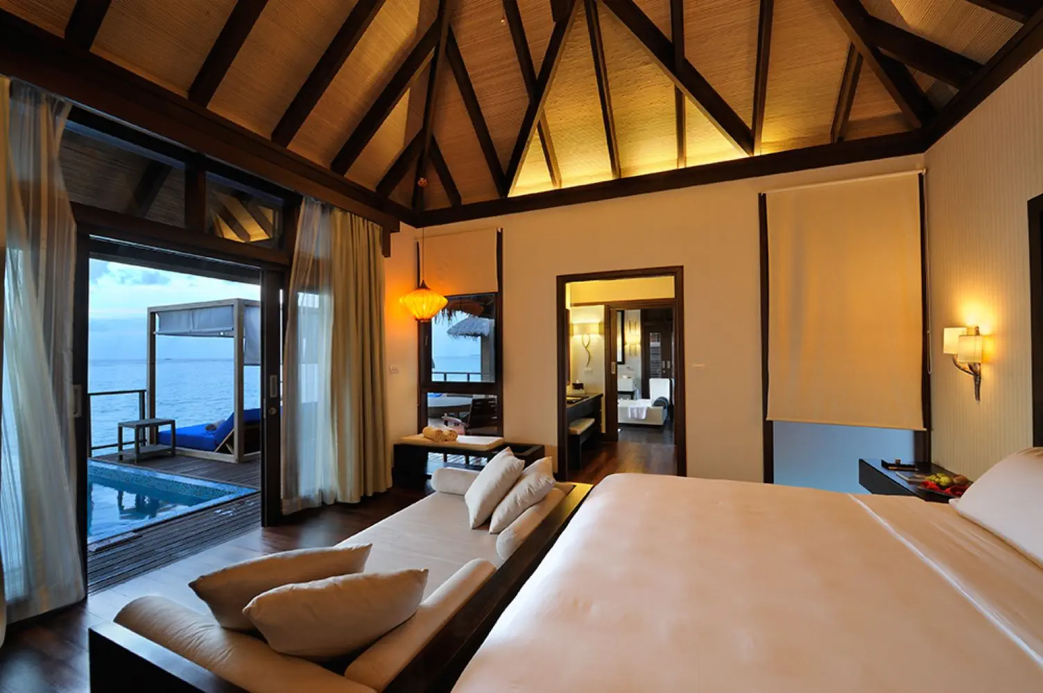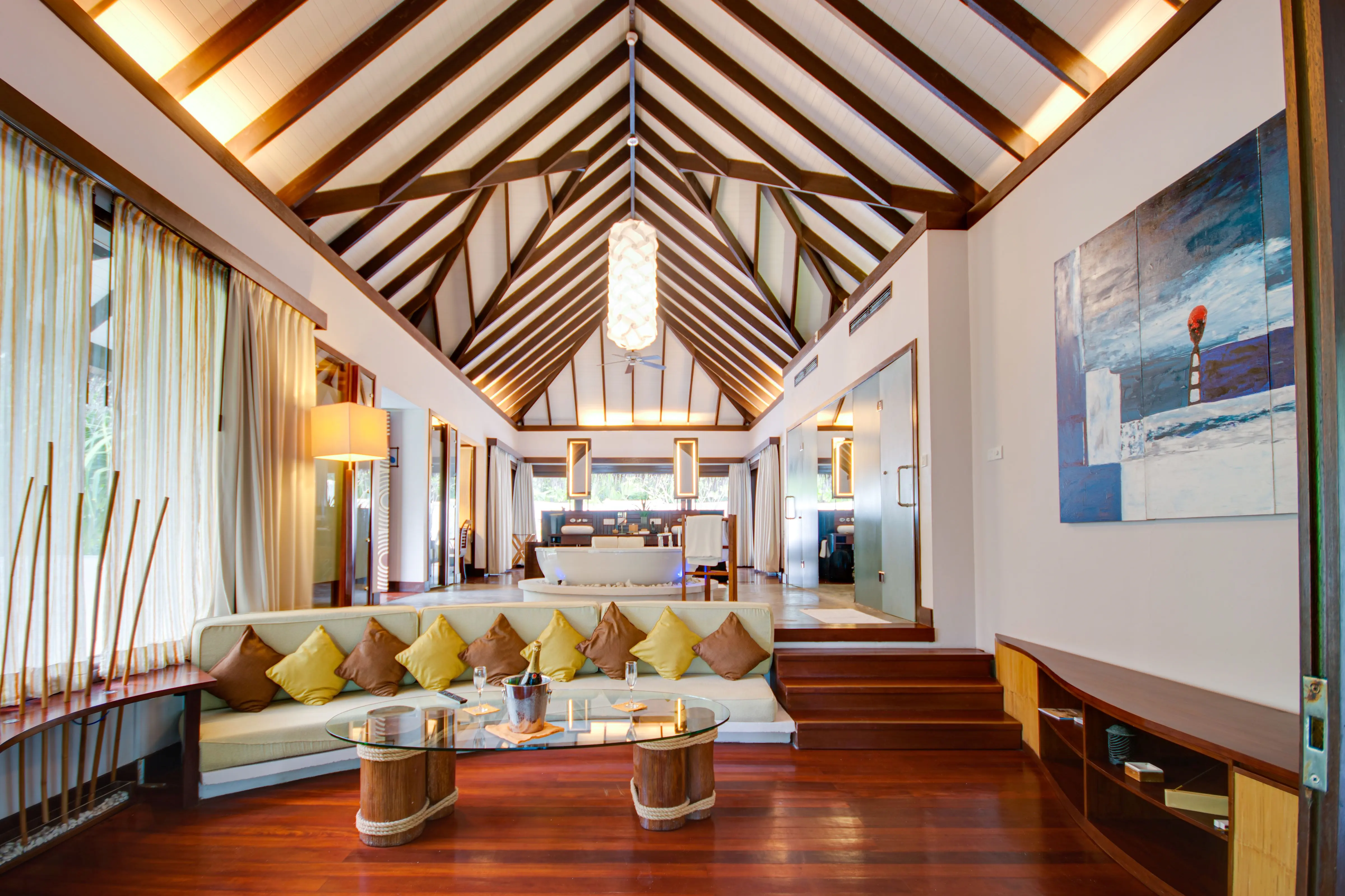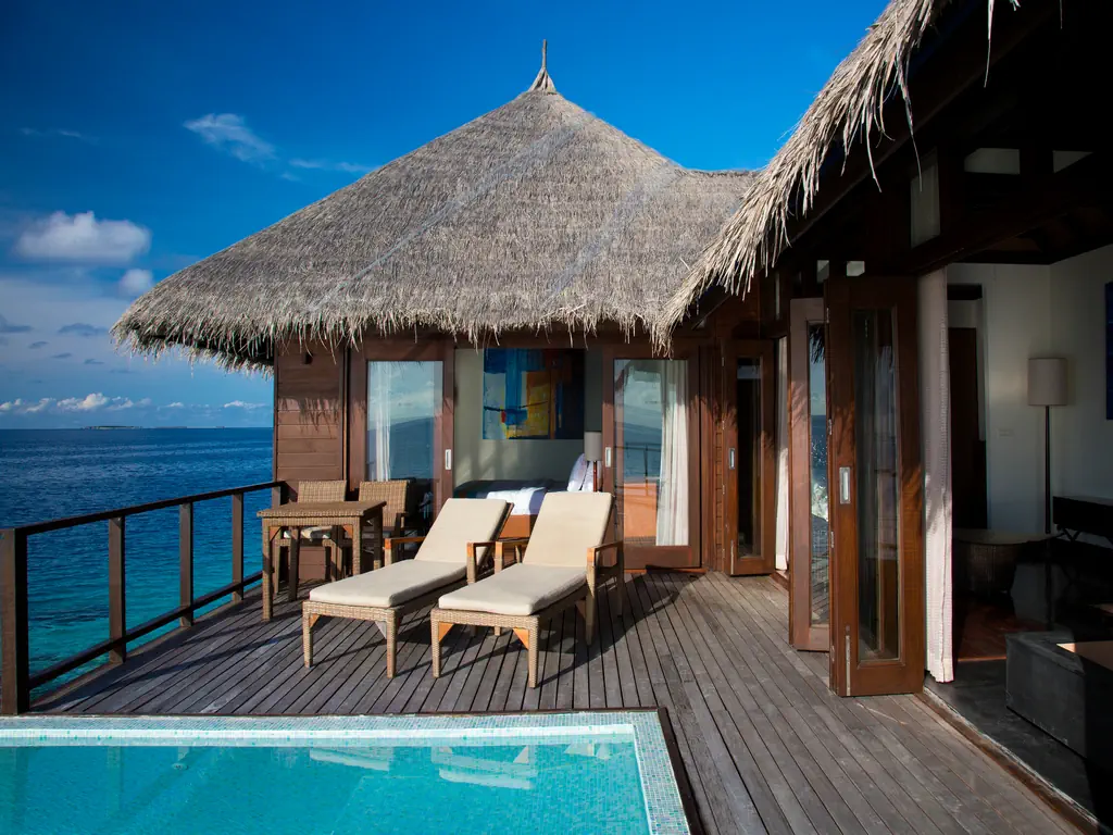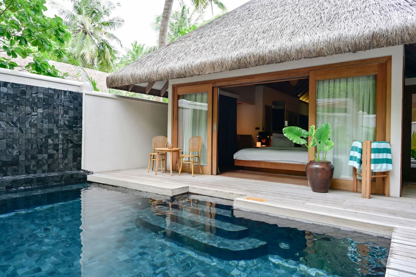 Dla max. 4 osób, Przestrzeń zewnętrzna: Taras, Kanały telewizji: Angielski, Telefon w pokoju, wanna i prysznic , Powierzchnia pokoju: ok. 144 m2, Dostawka: łóżko standardowe, Rodzaj podłogi: drewno, Sprzątanie codziennie, Salon, 1 sypialnia, Drzwi przesuwne, Maksymalna liczba osób dorosłych: 3, Maksymalna liczba dzieci: 2, Widok na lagunę, Prywatny basen, Liczba łazienek: 1, Liczba toalet: 1, Zestaw do parzenia kawy i herbaty, Klimatyzacja: Klimatyzacja indywidualna