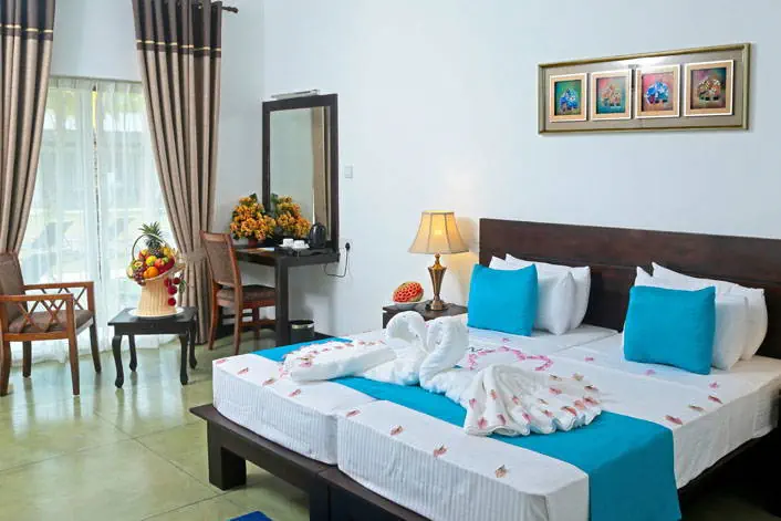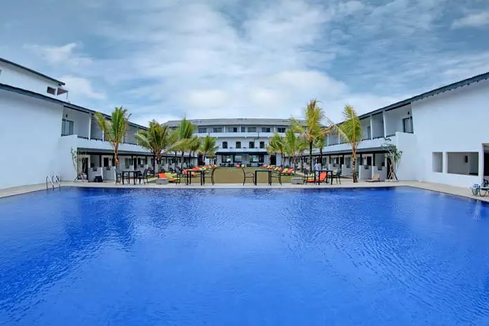 Położenie: Hotel położony jest w miejscowości Kalutara, ok. 4 km od centrum z szerokim wyborem restauracji, knajpek oraz sklepów. Zlokalizowany jest w niewielkim ogrodzie, tuż przy pięknej, złocistej plaży. Do lotniska w Colombo ok. 80 km. Plaża: Obiekt usytuowany bezpośrednio przy szerokiej, piaszczystej plaży. Brak serwisu plażowego. Do dyspozycji gości: Recepcja, kantor, restauracja główna Rasa serwująca posiłki w formie bufetu, restauracja serwująca owoce morza,2 bary serwujące przekąski i napoje. Ponadto: basen, leżaki i parasole przy basenie oraz w ogrodzie dostępne bezpłatnie. Płatne dodatkowo: sklep z pamiątkami, lekarz, centrum SPA. Pokoje: Hotel posiada 69 przyjemnie urządzonych pokoi (w większości z częściowym widokiem na morze). Pokoje standardowe wyposażone są w: łazienkę z prysznicem lub wanną, suszarkę do włosów (na zapytanie), indywidualnie sterowaną klimatyzację, wiatrak sufitowy, TV Sat., telefon, sejf, mini bar (konsumpcja płatna dodatkowo, lodówka uzupełniana jest na życzenie), zestaw do przygotowywania kawy i herbaty, zagospodarowany balkon lub taras. Na zapytanie i potwierdzenie możliwość wstawienia łóżeczka dla dziecka do 2 roku życia. Wyżywienie: Śniadania. Za dopłatą możliwe wyżywienie do obiadokolacji w formie bufetu (napoje do obiadokolacji płatne dodatkowo),dopłata do 3 posiłków:dodatkowo lunche (napoje do lunchy płatne dodatkowo) lub All Inclusive: 3 posiłki w formie bufetu, przekąski w ciągu dnia, lokalne napoje bezalkoholowe i alkohole (10:00-23:00). Restauracja główna serwuje dania kuchni lokalnej i międzynarodowej. Program sportowy i animacyjny: Hotel nie prowadzi animacji. Do syspozycjigości:badminton, rzutki, siłownia. Internet: Internet Wi-Fi dostępny częściach ogólnodostępnych hotelu. Kategoria lokalna: Na Sri Lance nie istnieje oficjalna kategoryzacja hoteli. Strona www: www.cocoroyalbeach.com Naszym zdaniem: Niewielki hotel o miłej i kameralnej atmosferze. Zlokalizowany blisko turystycznej miejscowości, co umożliwia odkrywanie uroków pobliskiego centrum miasta we własnym zakresie. Świetna propozycja dla osób, które mają skromniejszy budżet i wymagania. Opinie klientów: Klienci oceniają ten hotel na 5.5/6. Sprawdź opinie: