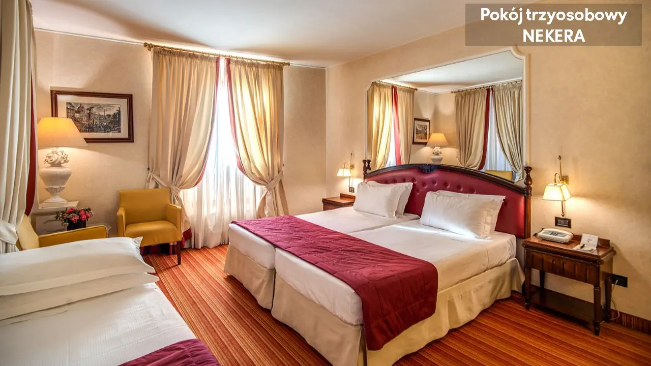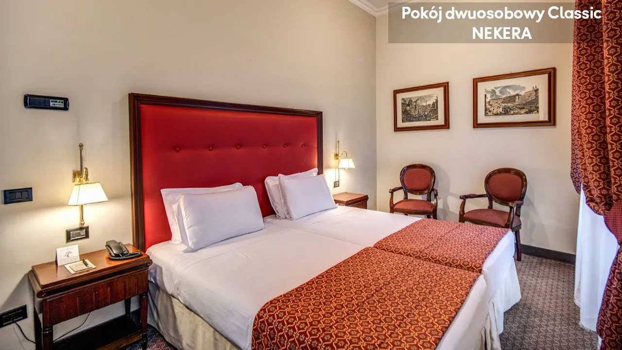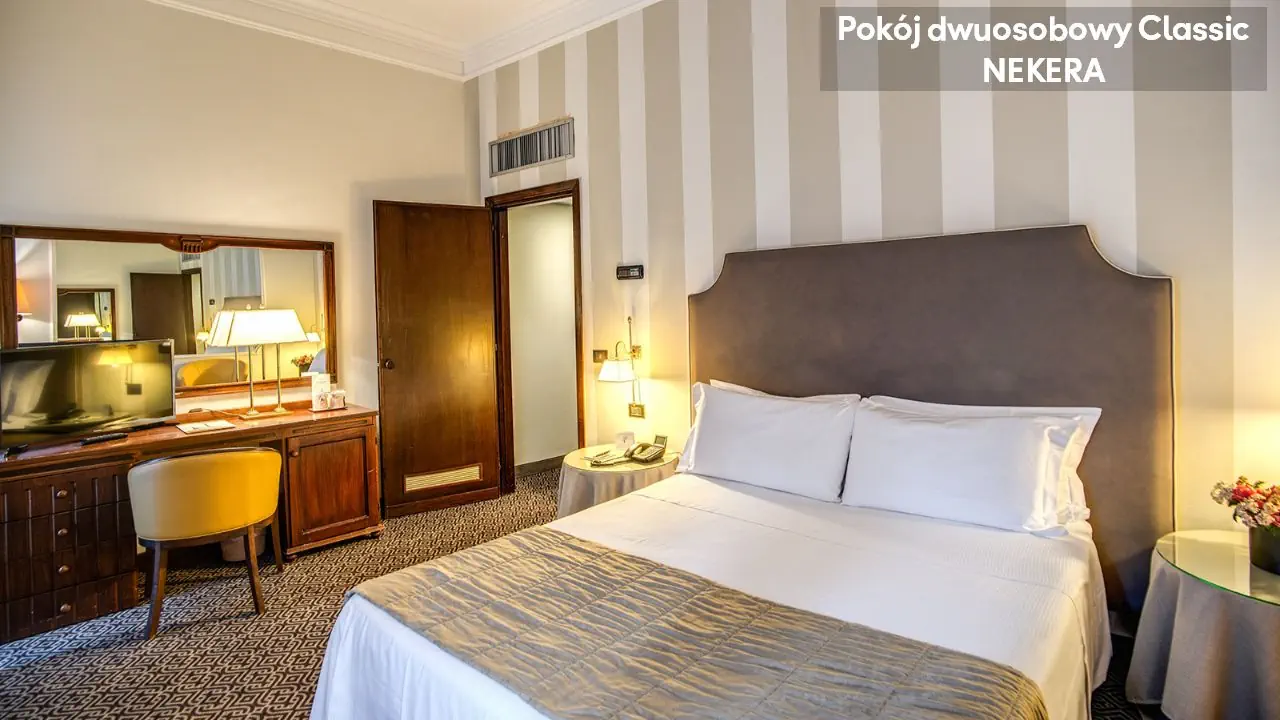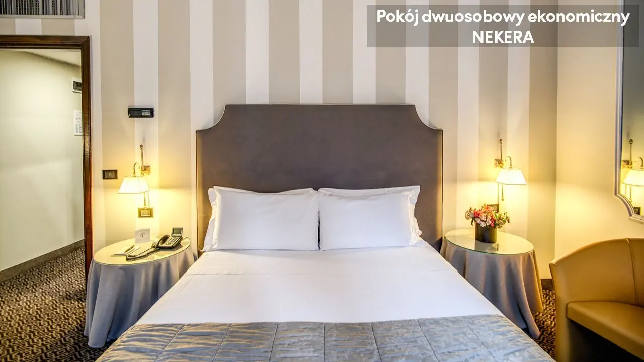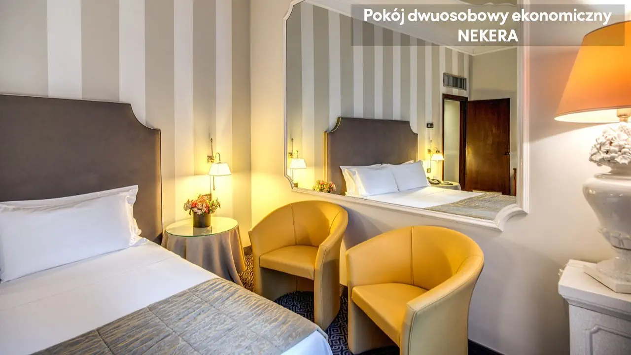 Pokój Dwuosobowy Standard: ok. 15–17 m², dla max 2 osób dorosłych, łóżko podwójne lub 2 łóżka pojedyncze, klimatyzacja, TV-Sat., telefon, minibar (płatny), sejf, prywatna łazienka (wanna lub prysznic, toaleta, suszarka do włosów, zestaw kosmetyków).