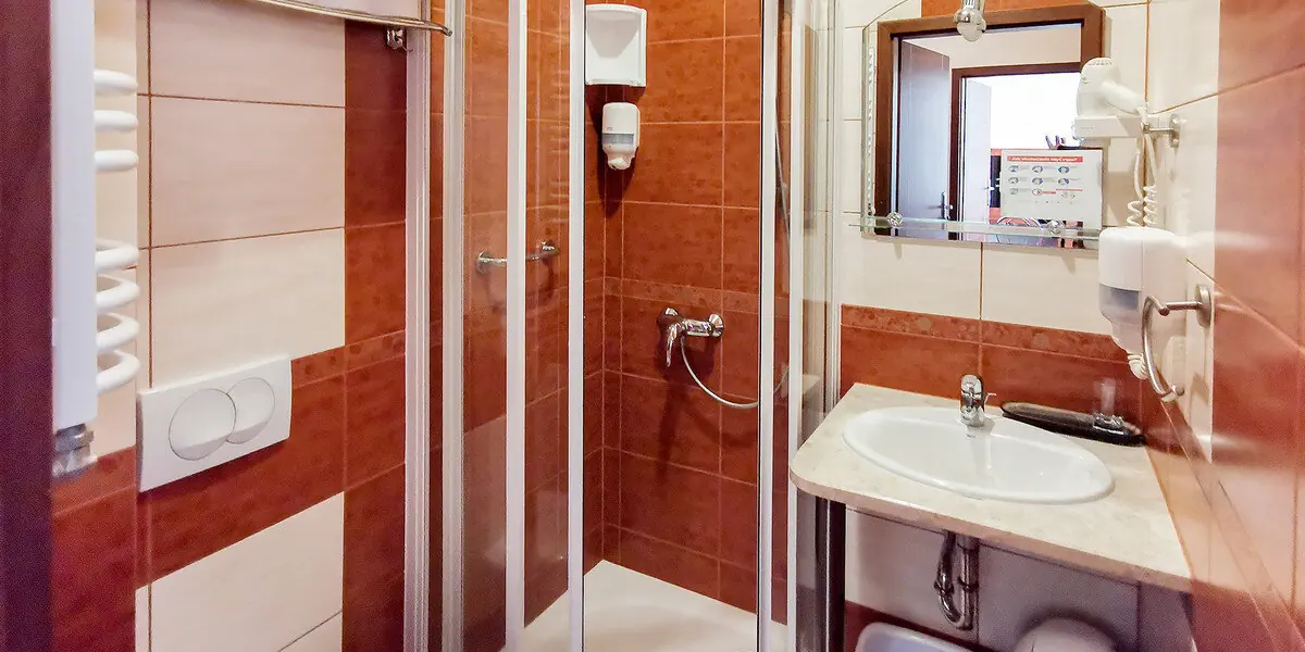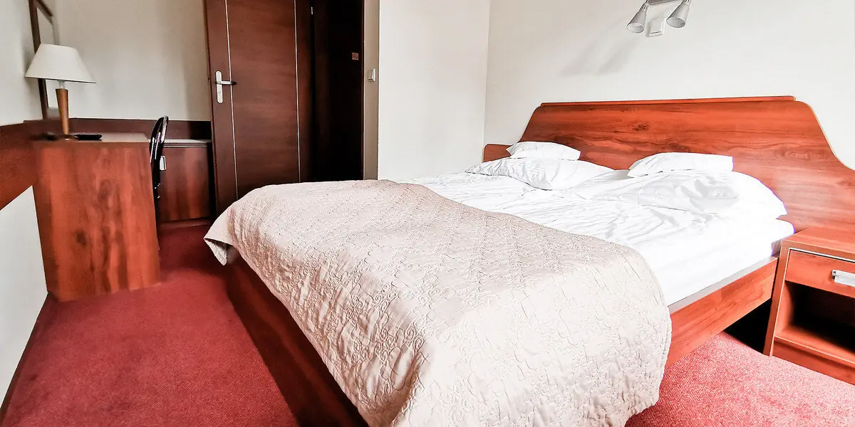 Pokój dwuosobowy ze skosami znajduje się w budynku głównym hotelu na 3 piętrze (winda dojeżdża do 2 p.). Składa się z jednej sypialni oraz łazienki. W pokoju znajdują się ręczniki, zestaw do kawy i herbaty, telewizor LCD, sejf oraz suszarka do włosów.