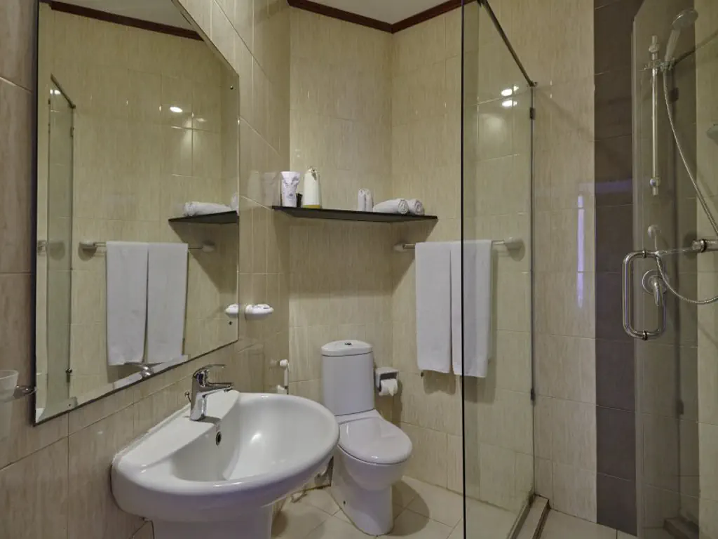 Dla max. 3 osób, Przestrzeń zewnętrzna: Balkon, Kanały telewizji: Angielski, Telefon w pokoju, prysznic, Powierzchnia pokoju: ok. 22 m2, Dostawka: łóżko standardowe, Rodzaj podłogi: płytki, Sprzątanie codziennie, 1 sypialnia, Maksymalna liczba osób dorosłych: 3, Maksymalna liczba dzieci: 0, Widok na morze, Liczba łazienek: 1, Liczba toalet: 1, Klimatyzacja: Klimatyzacja indywidualna