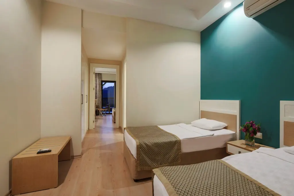 Dla max. 4 osób, Przestrzeń zewnętrzna: Balkon, Kanały telewizji: Angielski, Telefon w pokoju, prysznic, Powierzchnia pokoju: ok. 23 - 26 m2, Dostawka: łóżko piętrowe, Rodzaj podłogi: laminat, Sprzątanie codziennie, 1 sypialnia, Maksymalna liczba osób dorosłych: 2, Maksymalna liczba dzieci: 2, Widok na ogród, Liczba łazienek: 1, Liczba toalet: 1, Klimatyzacja: Klimatyzacja indywidualna