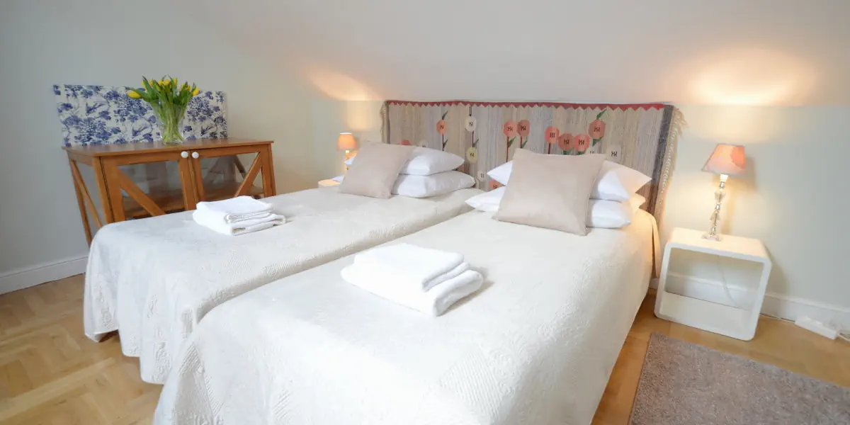 Duży, klimatyzowany apartament na poddaszu dla 5 osób. Sypialnia, część sypialna w salonie (2 łóżka oddzielone zasłoną) i rozkładana sofa. Salon z aneksem kuchennym (pełne wyposażenie), internet, TV, pralka, ręczniki, kosmetyki. Woda, kawa i herbata w cenie.