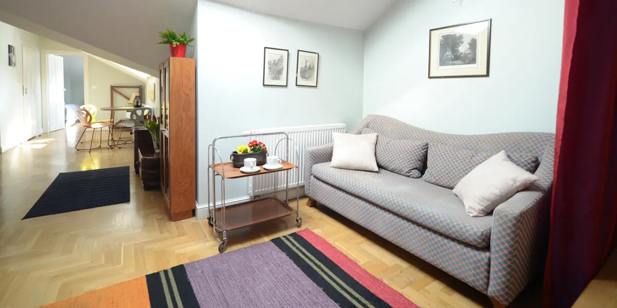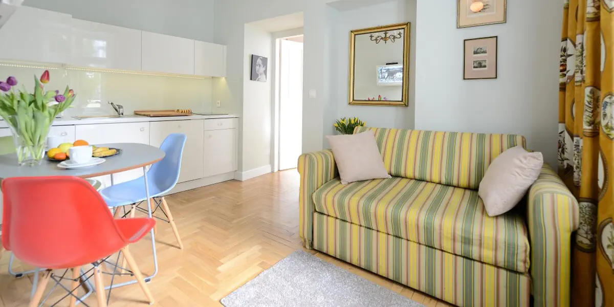 Klimatyzowany apartament dla 3 osób z widokiem na zielone podwórze. Sypialnia (2 łóżka z możliwością połączenia), salon z rozkładaną sofą, aneks kuchenny (pełne wyposażenie), internet, TV, pralka, ręczniki, kosmetyki. Woda, kawa i herbata w cenie.