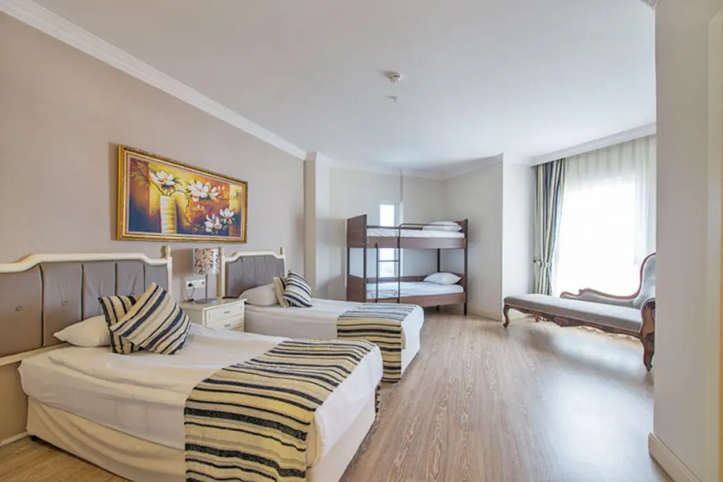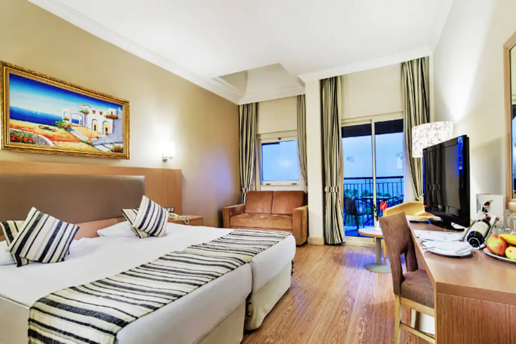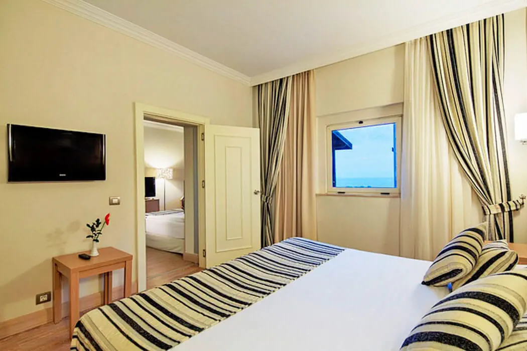Zlokalizowane są w 1 budynku (liczba pięter: 5, liczba wind: 6) Typy pokoi: - STANDARD ROOM dla max. 3 os.: 1 sypialnia, klimatyzacja centralna, sejf (bezpłatny), minibar (bezpłatny, uzupełniany codziennie), TV, telefon, łazienka (prysznic, WC), Balkon - STANDARD ROOM WITH BUNKBED OR SOFA BED dla max. 5 os.: 1 sypialnia, klimatyzacja centralna, sejf (bezpłatny), minibar (bezpłatny, uzupełniany codziennie), TV, telefon, łazienka (prysznic, WC), Balkon - FAMILY ROOM LAND VIEW dla max. 4 os.: 2 sypialnie, drzwi łączące między pokojami, klimatyzacja centralna, sejf (bezpłatny), minibar (bezpłatny, uzupełniany codziennie), TV, telefon, łazienka (prysznic, WC), Balkon - STANDARD ROOM SIDE SEA VIEW dla max. 3 os.: 1 sypialnia, klimatyzacja centralna, sejf (bezpłatny), minibar (bezpłatny, uzupełniany codziennie), TV, telefon, łazienka (prysznic, WC), Balkon