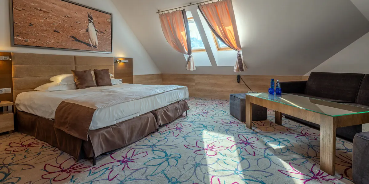 Komfortowy apartament na I piętrze hotelu. Ma dużą część dzienną i wygodną część sypialną. W dodatkowym wyposażeniu minibar, a w łazience wanna i prysznic
