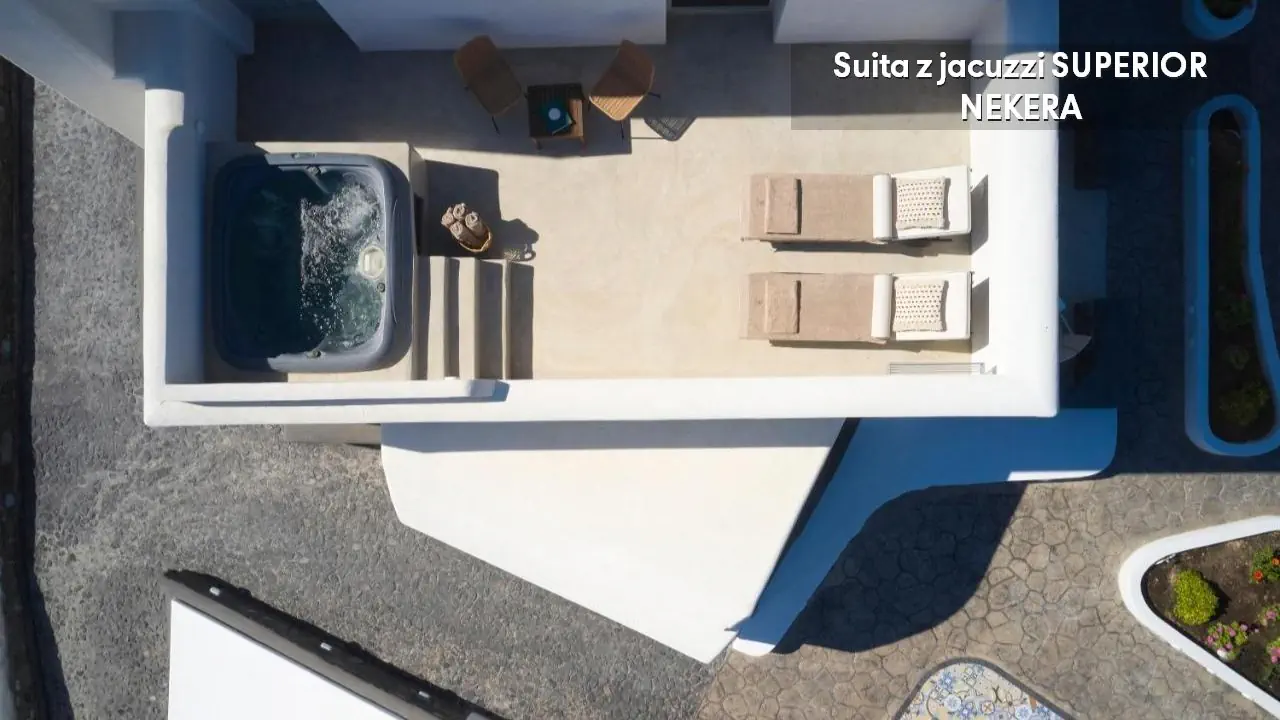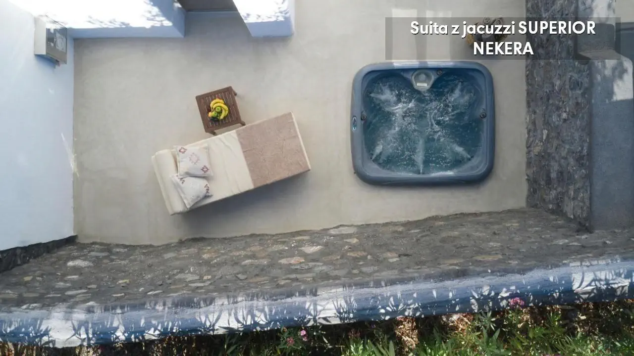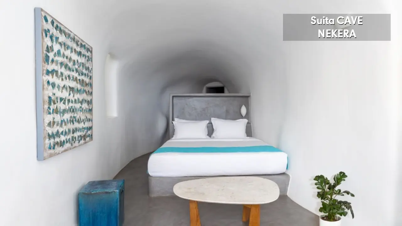 SUITA CAVE • ok. 35-40 m² • maks. 3 osoby dorosłe • łóżko podwójne i sofa • klimatyzacja • TV-Sat. • sejf (rozm. laptopa) • minilodówka • zestaw do parzenia kawy/herbaty • łazienka z prysznicem • suszarka do włosów • minikosmetyki • szlafrok i kapcie • ręcznik basenowy • taras z widokiem na morze w oddali • pokój w stylu groty skalnej • materace na tradycyjnych kamiennych podstawach SUITA DELUXE • ok. 28-30 m² • maks. 2 osoby dorosłe • łóżko podwójne • balkon z widokiem na morze w oddali • poza tym wyposażony jak suita CAVE • pokój na piętrze • materace na tradycyjnych kamiennych podstawach SUITA SUPERIOR z JACUZZI (na zapytanie) • ok. 35-40 m² • maks. 2 osoby dorosłe • łóżko podwójne i sofa • balkon z widokiem na morze w oddali • jacuzzi na balkonie • poza tym wyposażony jak suita CAVE • pokój na piętrze • materace na tradycyjnych kamiennych podstawach WILLA Z BASENEM (na zapytanie) • ok. 40 m² • maks. 2 osoby dorosłe • łóżko podwójne o rozm. king-size • duży prywatny taras z widokiem na morze • prywatny basen (nieregularny kształt) • poza tym wyposażony jak suita CAVE • materac na tradycyjnych kamiennych podstawach • willa wolnostojąca lub wbudowana w grotę skalną