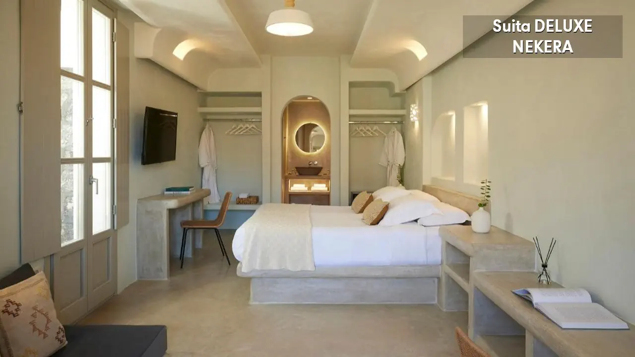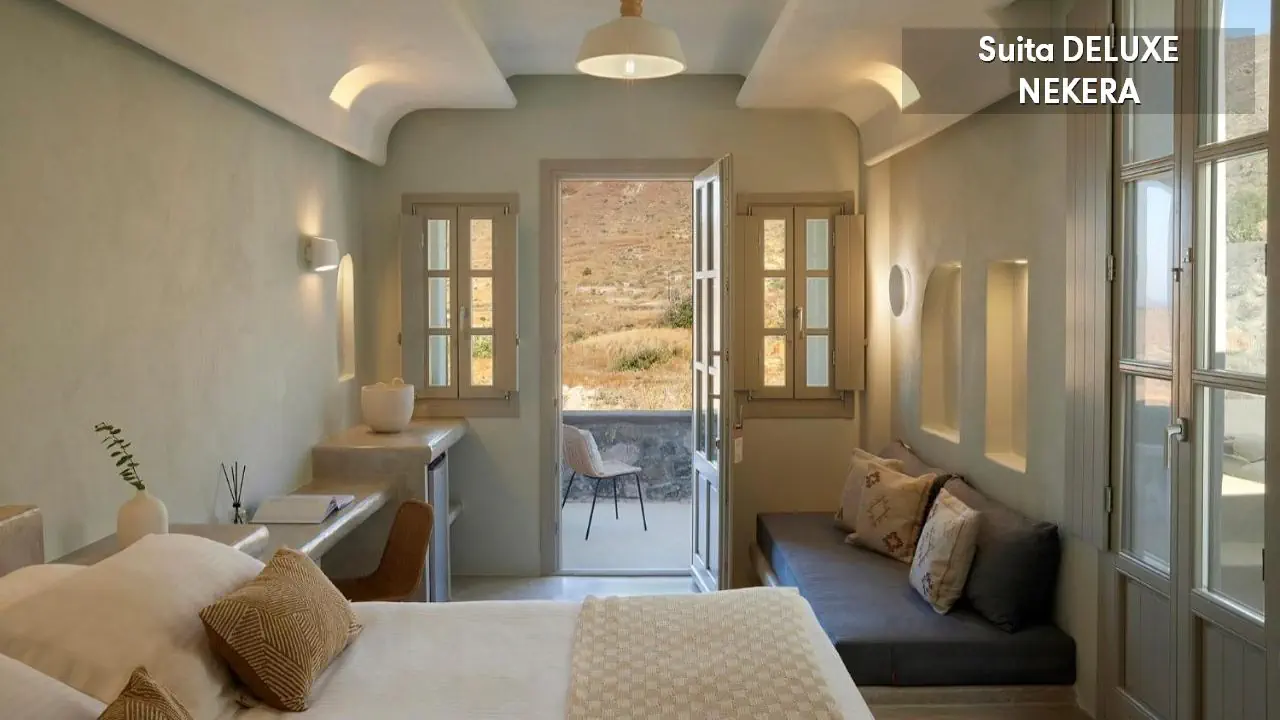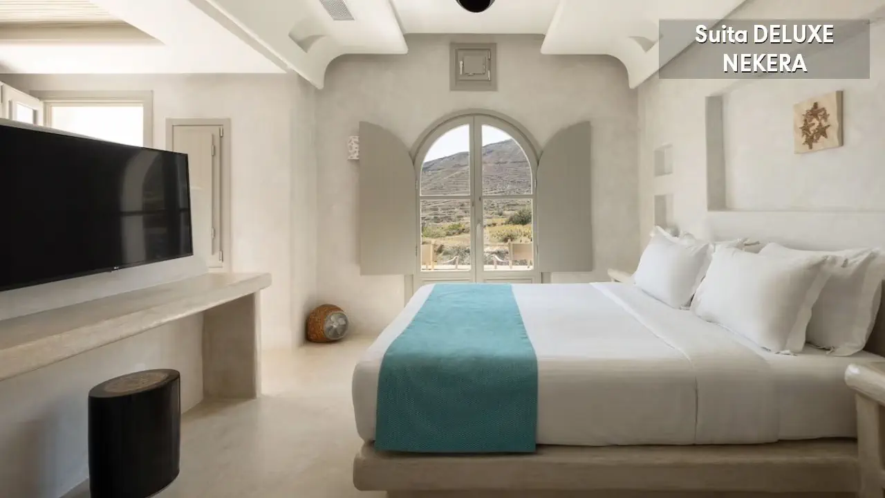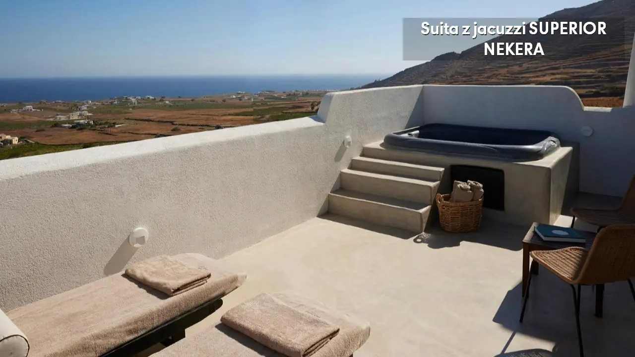 • czterogwiazdkowy, na wzgórzu • otwarty w 2019 r. • 17 suit • 1 budynek (2 piętra) i 3 wille • recepcja • lobby • klimatyzacja • hotel dla wymagających • dla par i nowożeńców • dyskretny serwis hotelowy • w tradycyjnym cykladzkim stylu