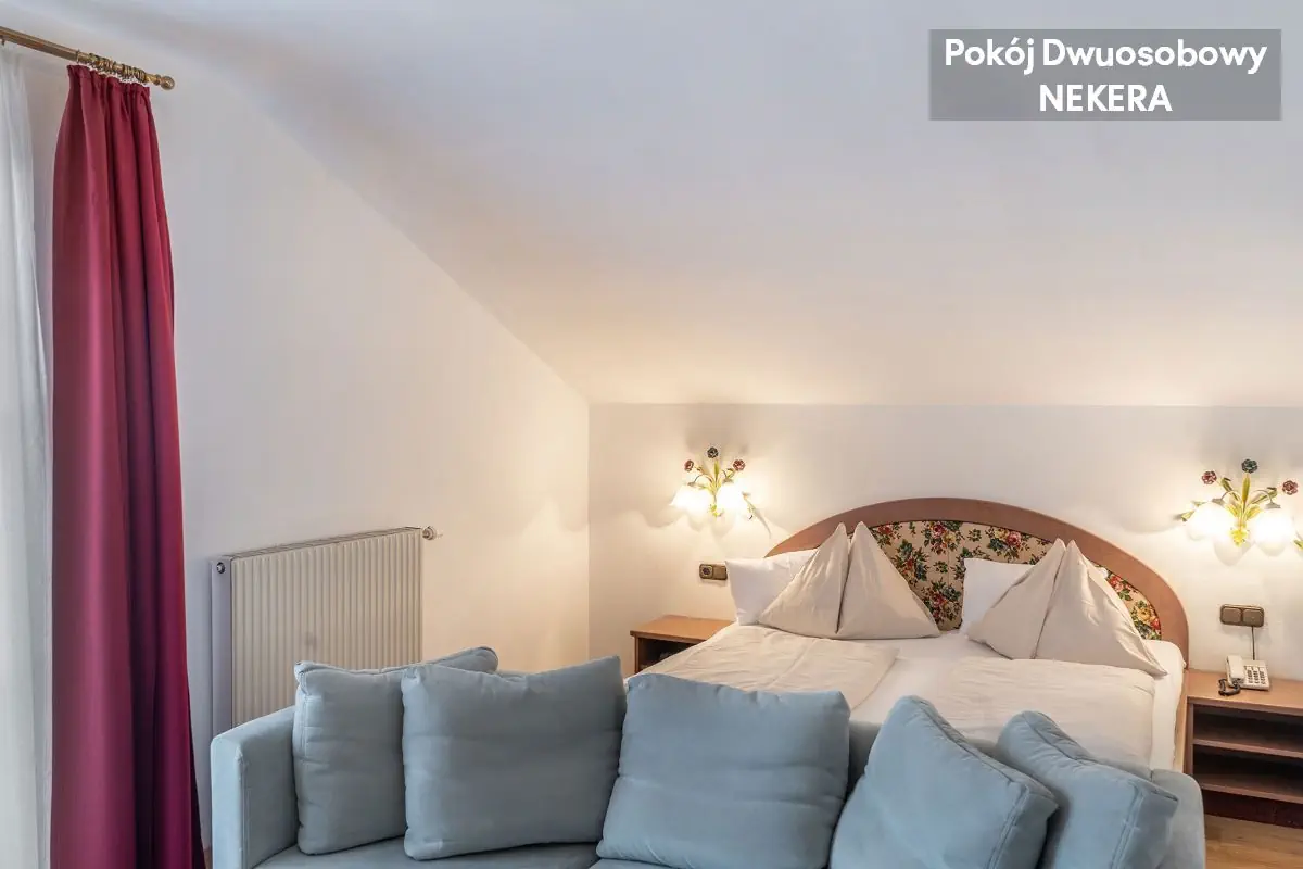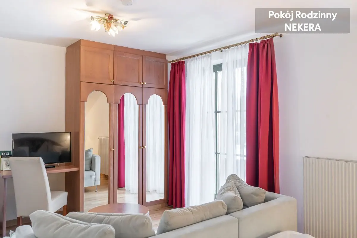 pokoje dwuosobowe: ok. 18 m2; ogrzewanie, TV-Sat., telefon, sejf, wanna lub prysznic, WC, suszarka. Przy maksymalnym obłożeniu nie ma możliwości wstawienia łóżeczka dla infanta. Pokoje rodzinne standard: ok. 25 m2; z łóżkiem małżeńskim i jednoosobową sofą. Wyposażone jak pokoje dwuosobowe. Apartamenty rodzinne standard: ok. 35 m2; pomieszczenie dzienno-sypialne z rozkładaną dwuosobową sofą oraz sypialnia z łóżkiem małżeńskim. Wyposażone jak pokoje dwuosobowe. Apartamenty rodzinne standard Extra: ok. 35 m2; pomieszczenie dzienno-sypialne z rozkładaną dwuosobową sofą i jednoosobową dostawką oraz sypialnia z łóżkiem małżeńskim. Wyposażone jak pokoje dwuosobowe.