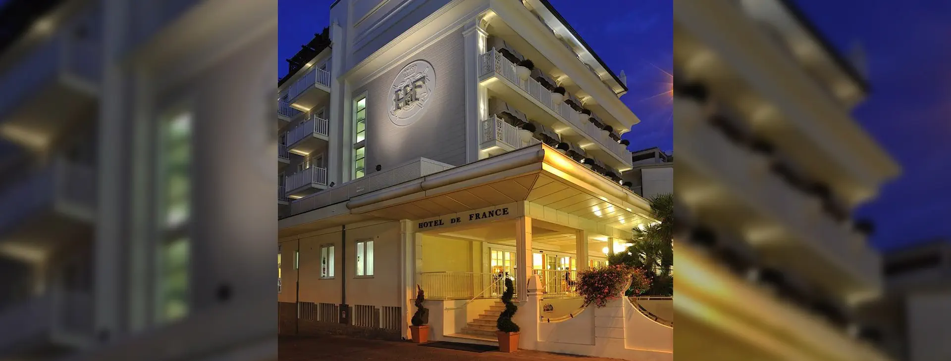 Położenie: Hotel położony w hotelowej dzielnicy Rimini - Rivazzurra di Rimini. W pobliżu szeroki wachlarz atrakcji, sklepów, barów i restauracji. Do centrum Rimini (Marina Centro) ok. 6 km (dojście nadmorskim deptakiem). Ok. 60 km do Rawenny, ok. 25 km do San Marino, ok. 120 km do Bolonii i Ankony. Konieczność uiszczenia obowiązkowej opłaty za podatek turystyczny bezpośrednio w hotelu ok. 2 EUR/os./dzień. Plaża: Hotel położony bezpośrednio przy piaszczystej plaży z łagodnym zejściem do morza z płatnym na miejscu serwisem plażowym. Do dyspozycji gości: Recepcja 24 h, przestronne lobby, winda, restauracja główna z widokiem na morze (dania lokalnej kuchni regionalnej oraz międzynarodowej) i bar w hotelowym lobby. Baseny z bezpłatnymi leżakami i parasolami (w miarę dostępności). Ponadto bezpłatny parking (ilość miejsc ograniczona). Hotel akceptuje małe zwierzęta domowe do 5 kg za dodatkową opłatą na miejscu (na zapytanie i potwierdzenie). Pokoje: Hotel posiada 75 przyjemnych i funkcjonalnie urządzonych pokoi 2-os. typu comfort (z max 2 dostawkami – możliwe łóżko piętrowe) rozlokowanych na 3 piętrach budynku głównego. Pokoje wyposażone w: łazienkę (wanna lub prysznic, WC, suszarka do włosów), indywidualnie sterowaną klimatyzację, TV sat., telefon, bezpłatny sejf, balkon z widokiem na otoczenie hotelu. Część pokoi posiada widok na morze. Łóżeczko dla dziecka do 2 lat bezpłatne (na potwierdzenie i po wcześniejszej rezerwacji). Wyżywienie: Śniadania w formie bogatego bufetu serwowane w restauracji głównej. Za dodatkową na miejscu w hotelu możliwość zakupu lunchy lub obiadokolacji w hotelowej restauracji głównej lub w licznych restauracjach w pobliżu hotelu. Program sportowy i animacyjny: Hotel nie prowadzi programu animacyjnego, ale z nawiązką rekompensuje to położenie w tętniącym turystycznym życiem Rimini i przy jednej z najbardziej rozpoznawalnych plaż tej części włoskiego wybrzeża. Ponadto w hotelu bilard a za dodatkową opłatą: boccia, siatkówka plażowa i sporty wodne na plaży. Internet: Bezpłatny Internet Wi-Fi w hotelowym lobby oraz w pokojach. Kategoria lokalna: *** Strona www: www.hoteldefrance.it Naszym zdaniem: Świetna lokalizacja w Rimini - jednym z najbardziej znanych kurortów środkowego wybrzeża Adriatyku pełnego atrakcji, zabytków, barów, restauracji i dyskotek. Idealne miejsce na włoskie wakacje w gronie znajomych!