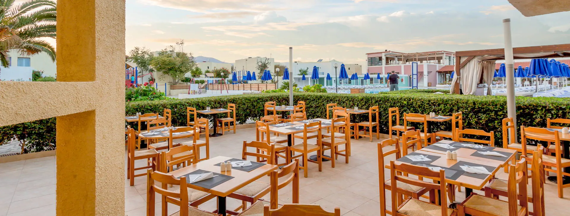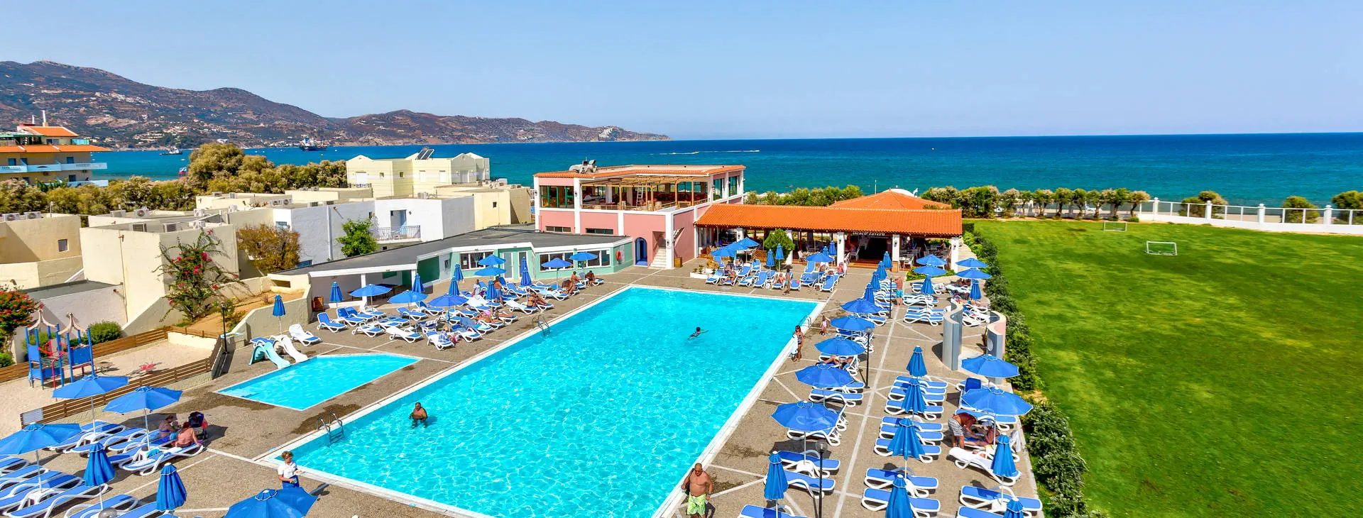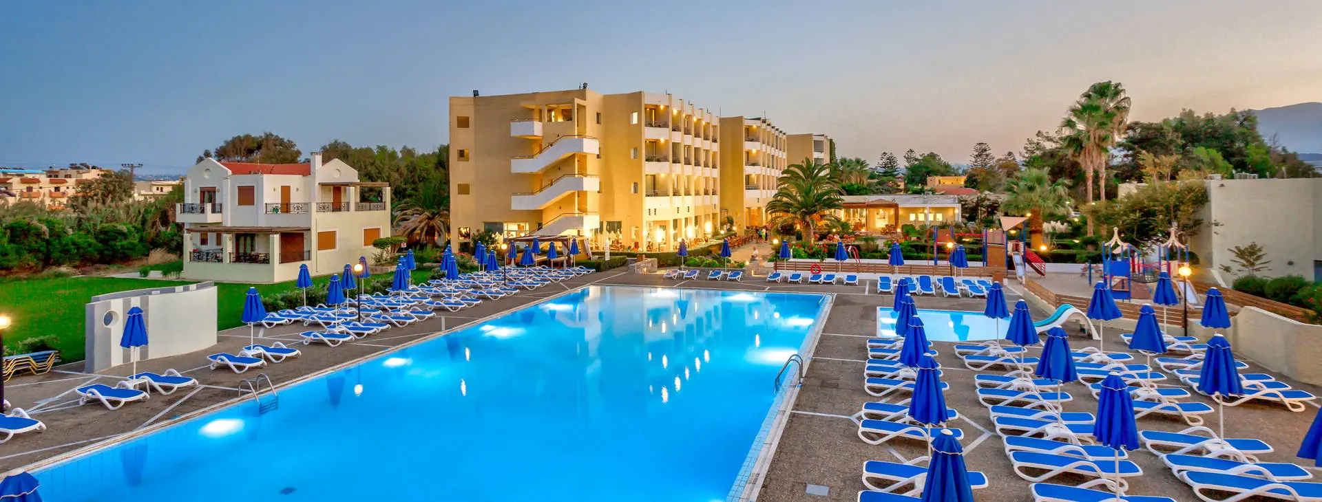 Położenie: Hotel zlokalizowany w spokojnej miejscowości Amoudara, około 8 km od ścisłego centrum Heraklionu. W pobliżu hotelu liczne sklepy, restauracje i bary. Około 600 m od hotelu znajduje się przystanek autobusowy z połączeniem do centrum Heraklionu. Do lotniska w Heraklionie około 12 km. UWAGA! Cena nie obejmuje lokalnego podatku turystycznego w wysokości 3 EUR/pokój/dzień. Podatek jest obligatoryjny i płatny bezpośrednio w recepcji, przed zakwaterowaniem Klientów w hotelu. Plaża: Obiekt położony bezpośrednio przy piaszczystej plaży Ammoudara, oznaczonej błękitną flagą. Jest to jedna z najbardziej malowniczych plaż w regionie. Leżaki i parasole na plaży bezpłatne. Ręczniki plażowe dostępne w recepcji bezpłatnie (depozyt 5 EUR). Do dyspozycji gości: 24-h recepcja, lobby. Restauracja główna Minos, tawerna a’la carte Pasiphae na plaży, bar w lobby Ariadne, bar na plaży i przy basenie. Na terenie obiektu znajdują się 3 baseny, w tym jeden ze zjeżdżalniami. Dodatkowo dostępne są 2 korty tenisowe, boisko do koszykówki, boisko do siatkówki plażowej, bilard (za dodatkową opłatą), stół do tenisa stołowego, piłkarzyki oraz rzutki. Centrum Spa & Wellness oferuje zabiegi na całe ciało, usługi masażysty, saunę, hammam oraz jacuzzi (za dodatkową opłatą). W hotelu działa Mini Klub dla najmłodszych. Pokoje: Hotel posiada łącznie 259 pokoi zlokalizowanych w trzech budynkach. Wszystkie pokoje posiadają balkony lub tarasy oraz łazienki z wanną lub prysznicem oraz suszarką do włosów. We wszystkich pokojach znajduje się mini-bar (woda butelkowana raz na przyjazd), sejf, TV-Sat, zdalnie sterowana klimatyzacja. Pokoje standardowe dwuosobowe (z możliwością dostawki) o powierzchni ok. 24 m2. Posiadają boczny widok na ogród lub morze. Maksymalne obłożenie to 3 osoby dorosłe lub 2 osoby dorosłe + dziecko. Pokoje rodzinnew bungalowach o powierzchni ok. 50 m2. Pokoje te posiadają widok na ogród. Maksymalne obłożenie to 4 osoby dorosłe lub 2 osoby dorosłe + 2 dzieci. Wyżywienie: Wczesne śniadanie (5:00-7:00, wymagana rezerwacja), bufet śniadaniowy (7:00-10:00), późne śniadanie (10:00-11:00), lunch w restauracji głównej (12:30-14:30), kolacja (19:00-21:00). Przekąski dostępne w plażowej Tawernie pomiędzy 11:00 a 16:00. Napoje bezalkoholowe i alkoholowe dostępne w barze na plaży w godzinach 10:00-18:00 (soft drinki, kawa, herbata, soki, piwo, lokalne alkohole) oraz w barze Ariadne w lobby w godzinach 17:00-24:00. Dodatkowo lody w godzinach 15:00-17:00 w barze przy basenie (Katrea) oraz w barze na plaży (Glafkos). Raz na pobyt jedna kolacja w restauracji Pasiphae (wymagana rezerwacja). Program sportowy i animacyjny: Hotel posiada program animacji dla dzieci i dorosłych. Zabawy w basenie, aerobik, wodne polo lub mecze siatkówki plażowej, a także ćwiczenia fitness. Mini Klub prowadzi animacje dla dzieci w wieku od 4 do 12 lat w godzinach 10:00-12:00 i 15:00-17:30. Na terenie obiektu znajduje się plac zabaw (jeden wewnętrzny, drugi zewnętrzny). W okresie od 15 czerwca do 15 września FIGLOKLUB - 6 x w tygodniu zabawy dla dzieci z polskim animatorem. Internet: Na terenie całego hotelu bezpłatne WiFi. Kategoria lokalna: **** Strona www: