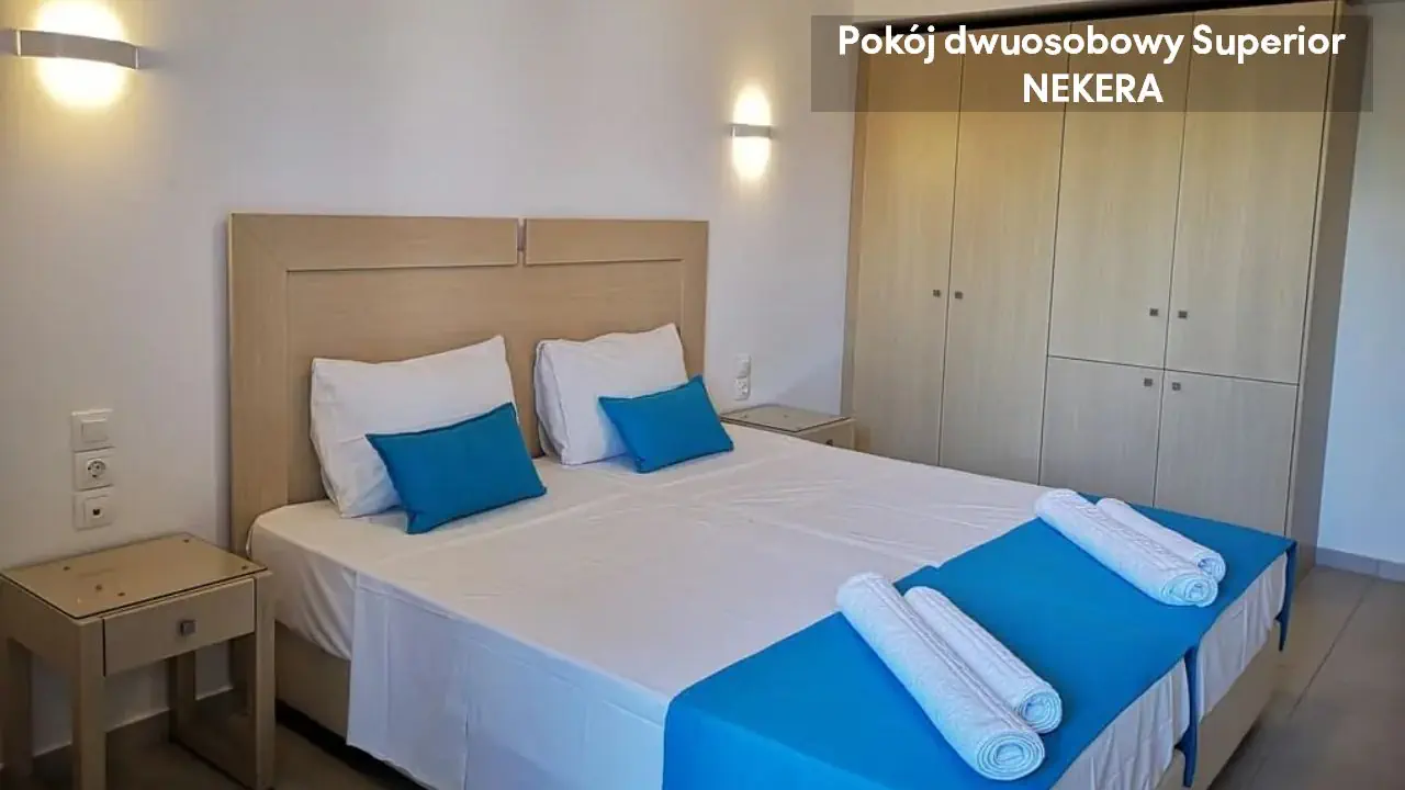 pokój dwuosobowy STANDARD: ok. 25 m2, maks. 2 osoby dorosłe i dziecko, łóżko podwójne lub dwa pojedyncze oraz łóżko rozkładane (dostawka). Wyposażenie: klimatyzacja indywidulanie sterowana (płatna), 24' TV-Sat., minilodówka,telefon (płatny), prywtana łazienka (natrysk, toaleta, umywalka, suszarka do włosów), umeblowany balkon z widokiem na ląd. Pokój trzyosobowy STANDARD: ok. 25 m2, maks. 3 osoby dorosłe, trzy łóżka pojedyncze lub podwojne i pojedyncze. Poza tym wyposażony jak pokój dwuosobowy STANDARD. Pokój dwuosobowy SUPERIOR: ok. 25 m2, maks. 2 osoby dorosłe i dziecko, łóżko podwójne lub dwa pojedyncze oraz łóżko rozkładane (dostawka). Wyposażenie: klimatyzacja indywidulanie sterowana (płatna), 24' TV-Sat., minilodówka,telefon (płatny), prywtana łazienka (natrysk, toaleta, umywalka, suszarka do włosów), umeblowany balkon z widokiem na ląd. Nowoczesne umeblowanie, wyremontowany w 2018 r. Pokój dwuosobowy z częsciowym widokie na morze SUPERIOR: ok. 25 m2, maks. 2 osoby dorosłe i dziecko, łóżko podwójne lub dwa pojedyncze oraz łóżko rozkładane (dostawka). Wyposażenie: klimatyzacja indywidulanie sterowana (płatna), 24' TV-Sat., minilodówka,telefon (płatny), prywtana łazienka (natrysk, toaleta, umywalka, suszarka do włosów), umeblowany balkon z częściowym widokiem na ląd.