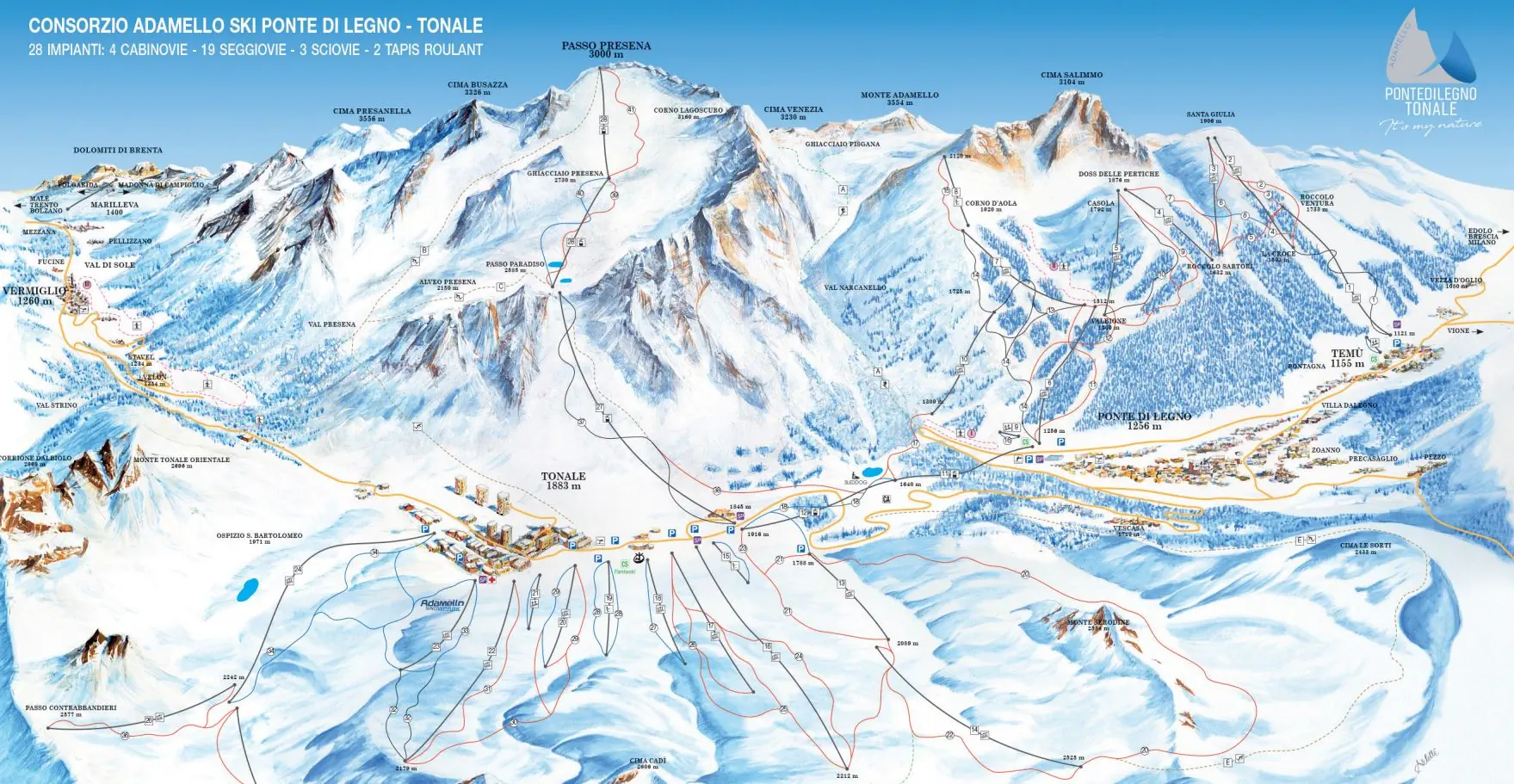 Adamello Ski-Area (Ponte di Legno-Tonale-Temu), wys. 1121-3016 m. n.p.m., 28 nowoczesnych wyciągów narciarskich: 19 wyciągów orczykowych, 4 wyciągi kabinowe, 3 wyciągi orczykowe, 2 magiczne dywany. 42 trasy narciarskie o łącznej długości ok. 100 m: 24 km (10 tras) niebieskich - łatwych; 61 km (25 tras) czerwonych - średnich, 15 km (6 tras) czarnych - trudnych.