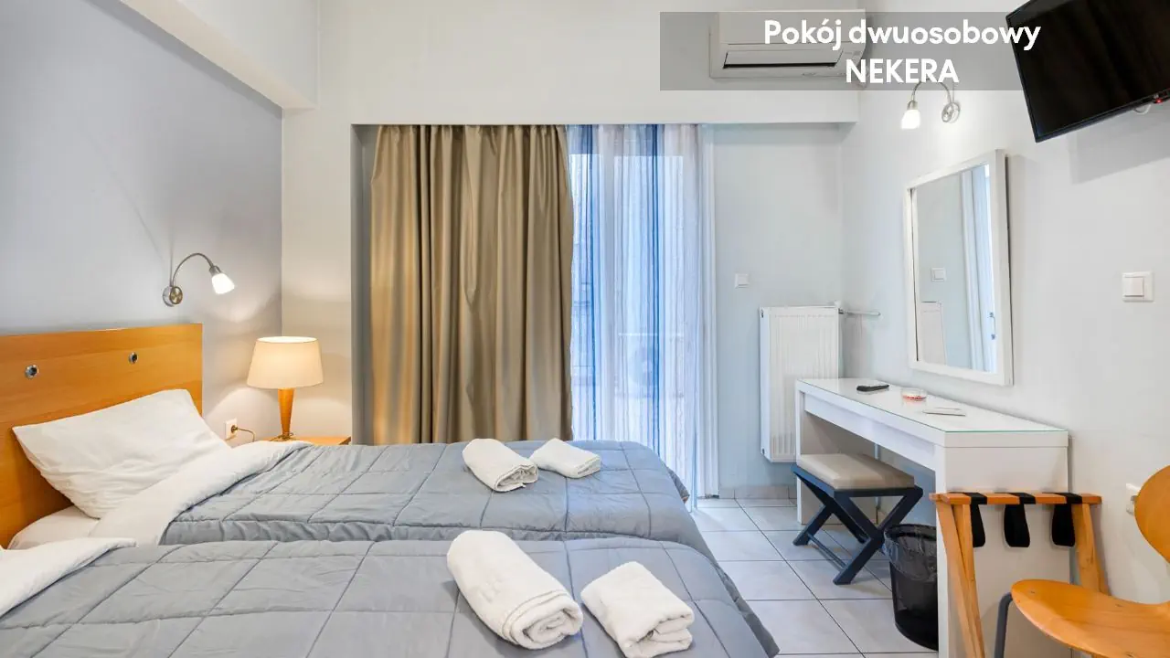pokój z dwoma łóżkami pojedynczymi TWIN ROOM: mogący pomieścić max. 2 osoby; mini lodówka; TV; klimatyzacja/ogrzewanie. Prywatna toaleta: wanna/prysznic, toaleta, umywalka, lustro, ręczniki, suszarka; balkon.