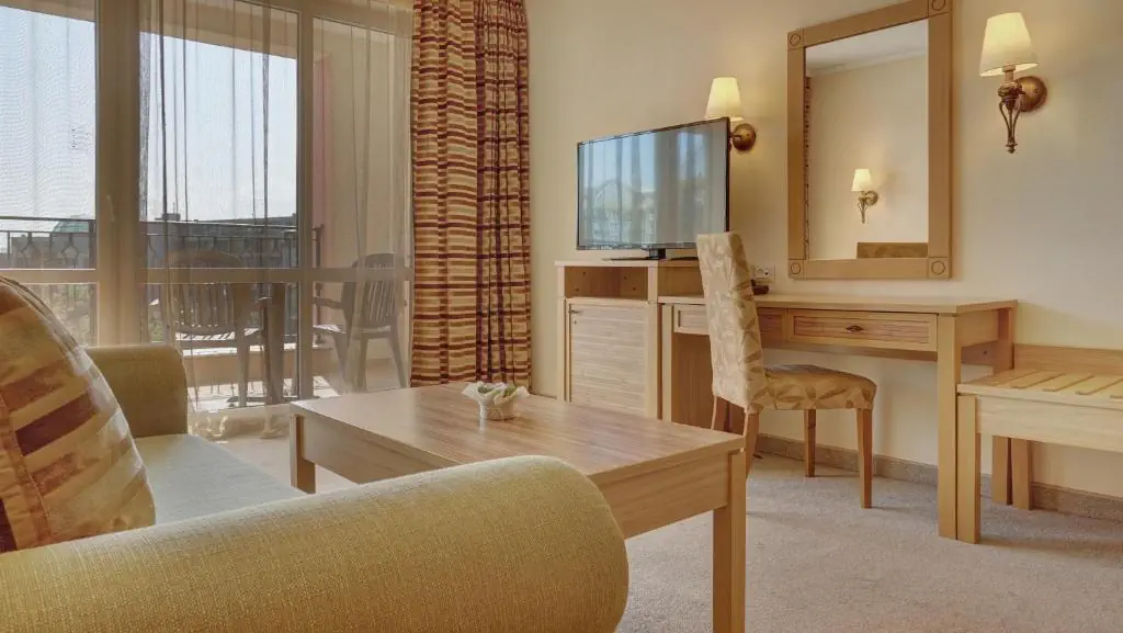 Dla max. 3 osób, Przestrzeń zewnętrzna: Balkon, Kanały telewizji: Angielski, Telefon w pokoju, wanna i prysznic , Powierzchnia pokoju: ok. 23 m2, Dostawka: sofa, Rodzaj podłogi: wykładzina, Sprzątanie codziennie, 1 sypialnia, Maksymalna liczba osób dorosłych: 2, Maksymalna liczba dzieci: 2, Widok na ogród, Liczba łazienek: 1, Liczba toalet: 1, Klimatyzacja: Klimatyzacja centralna