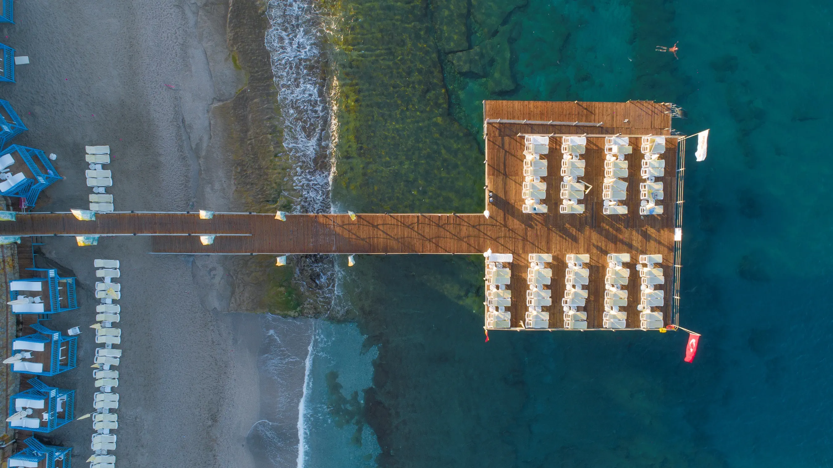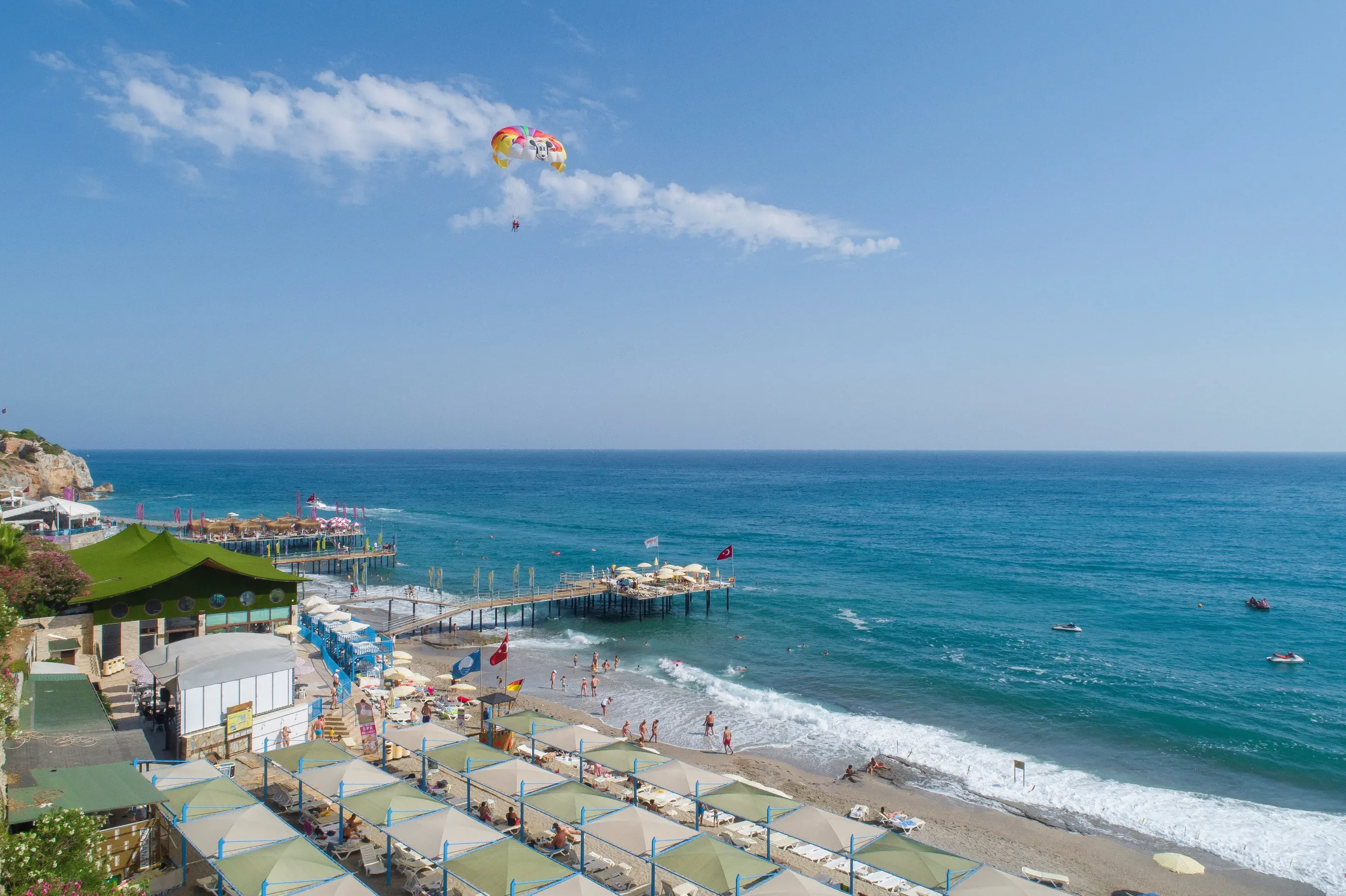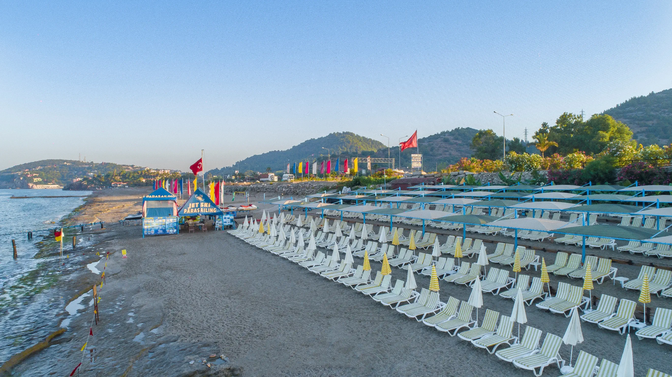 Prywatna, Piaszczysto-żwirowa, Piaszczysto-żwirowe zejście do morza, Dojście do plaży przez ulicę, tunelem itp., odleglość do plaży: 30 m, długość plaży: 200 m, pomost na plaży, Parasole - bezpłatnie, Leżaki - bezpłatnie, Ręczniki - , Pawilony na plaży - płatne, Beach Bar - bezpłatnie, Prysznic