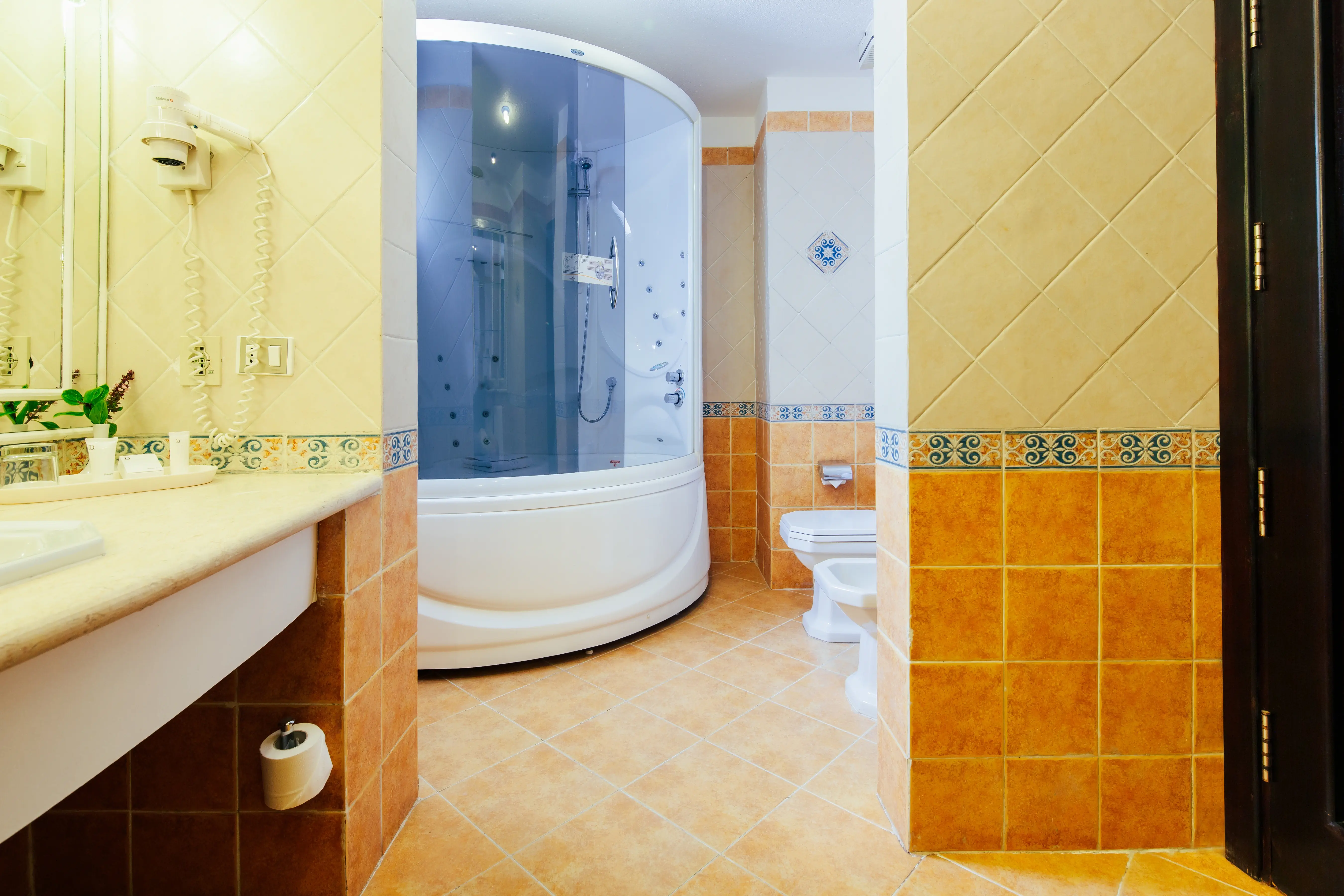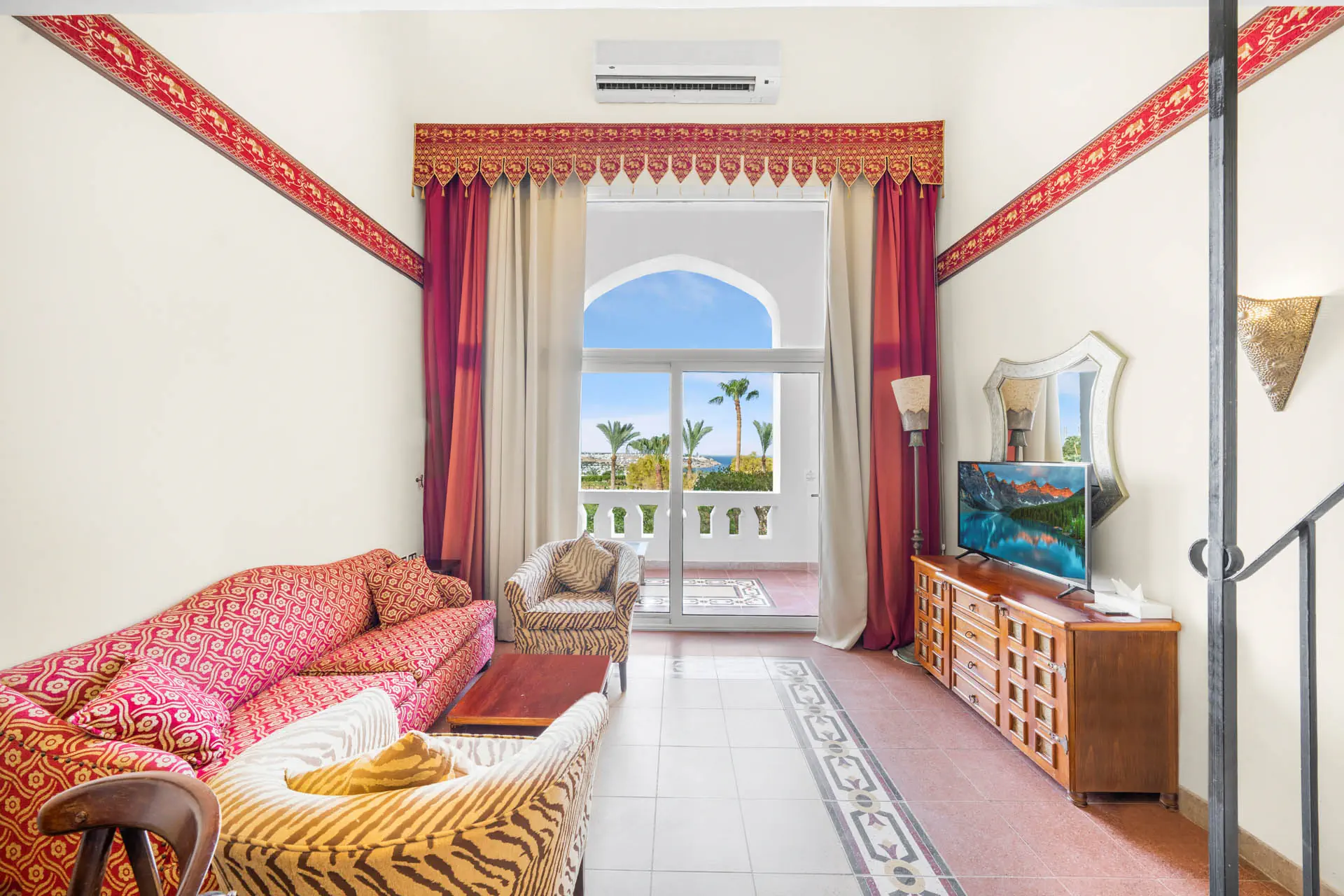 Dla max. 3 osób, Przestrzeń zewnętrzna: Balkon, Kanały telewizji: Angielski, Telefon w pokoju, wanna, prysznic, Powierzchnia pokoju: ok. 47 m2, Dostawka: sofa, Rodzaj podłogi: płytki, Sprzątanie codziennie, 1 sypialnia, Maksymalna liczba osób dorosłych: 2, Maksymalna liczba dzieci: 1, Widok na basen,Widok na morze, Liczba łazienek: 1, Liczba toalet: 1, Zestaw do parzenia kawy i herbaty, Klimatyzacja: Klimatyzacja indywidualna