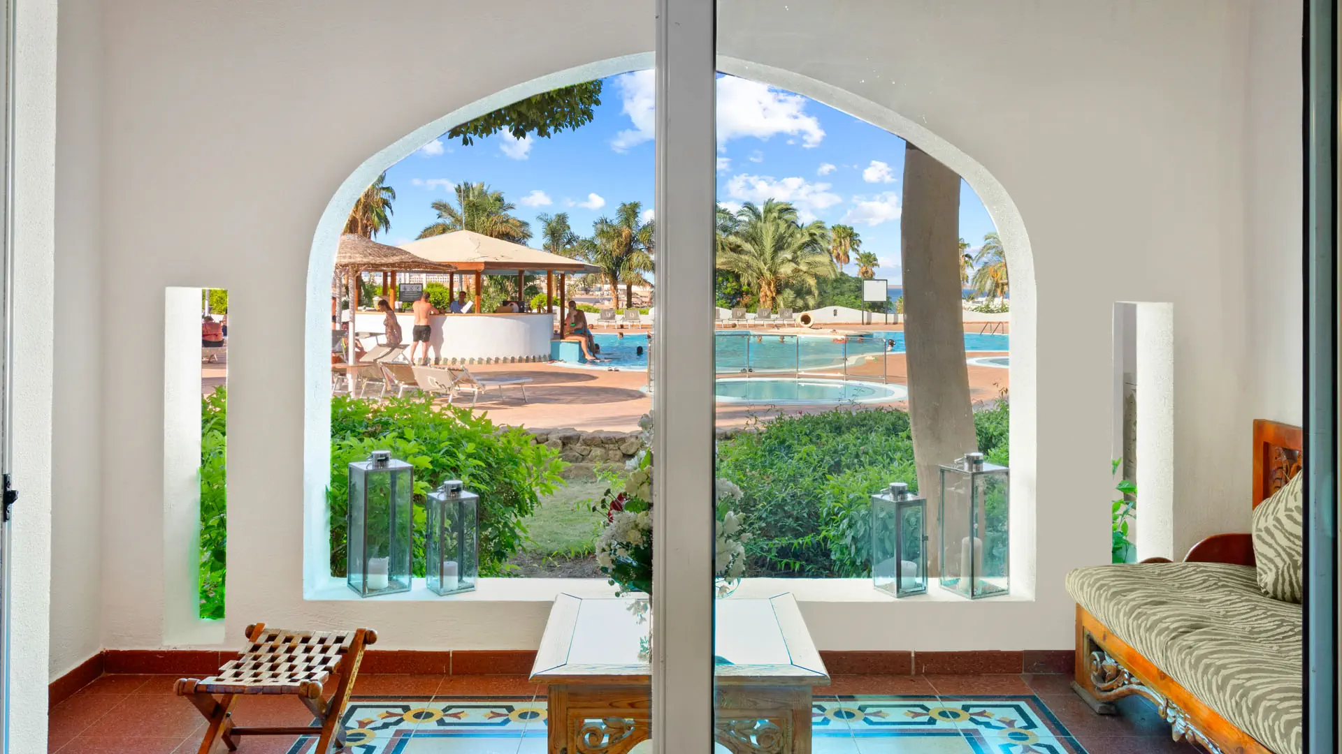Dla max. 4 osób, Przestrzeń zewnętrzna: Balkon, Kanały telewizji: Angielski, Telefon w pokoju, wanna, Powierzchnia pokoju: ok. 47 m2, Dostawka: sofa, Rodzaj podłogi: płytki, Sprzątanie codziennie, 1 sypialnia, Maksymalna liczba osób dorosłych: 2, Maksymalna liczba dzieci: 2, Widok na ogród i basen,Od strony basenu,Frontalny widok na basen, Liczba łazienek: 1, Liczba toalet: 1, Zestaw do parzenia kawy i herbaty, Klimatyzacja: Klimatyzacja indywidualna