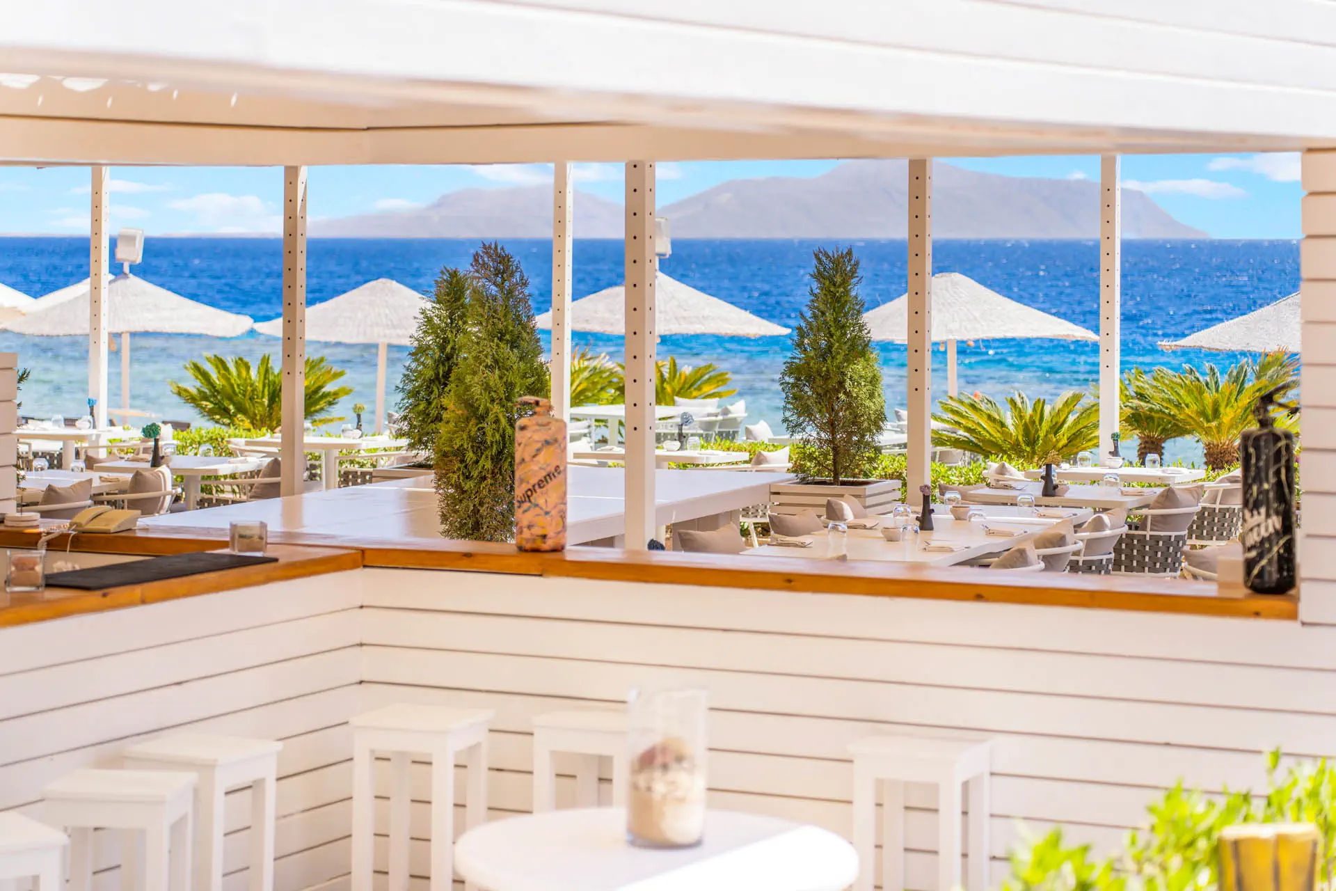 Prywatna, Piaszczysto-żwirowa, Kamieniste zejście do morza, odleglość do plaży: 100 m, długość plaży: 1800 m, pomost na plaży, Parasole - bezpłatnie, Leżaki - bezpłatnie, Ręczniki - bezpłatnie, Pawilony na plaży - płatne, Beach Bar - bezpłatnie, Bus hotelowy do plaży, Prysznic