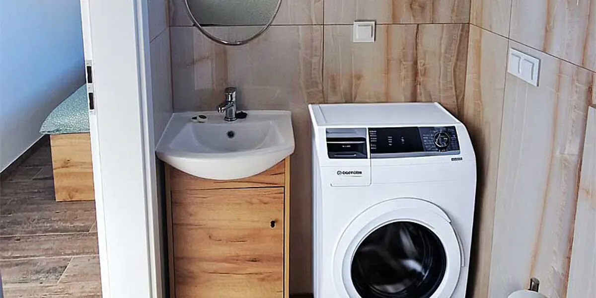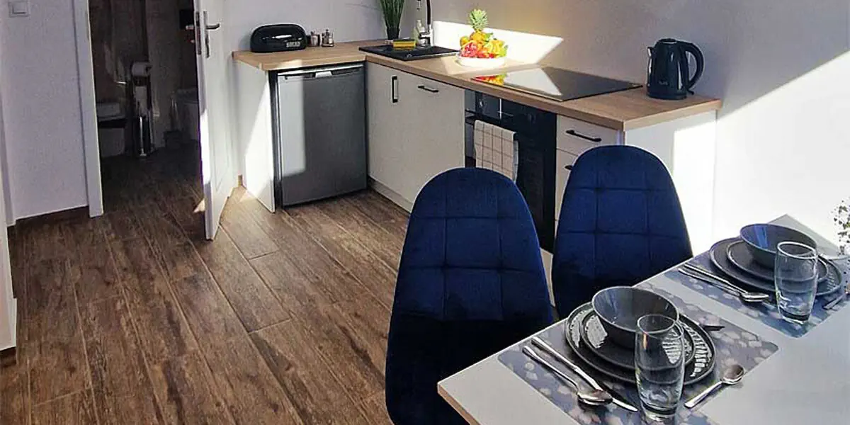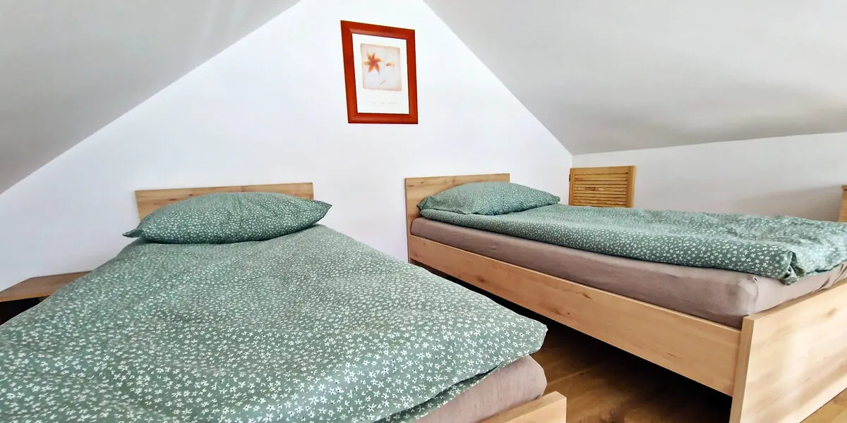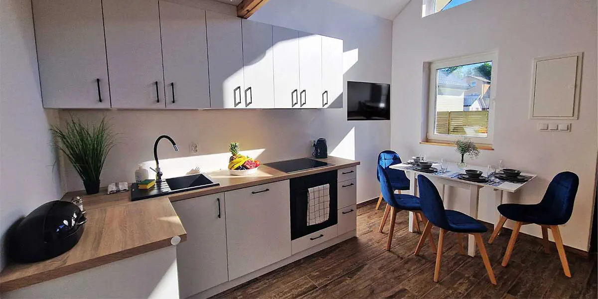 Na parterze znajduje się salon z rozkładaną kanapą i aneksem kuchennym, sypialnia z łożem małżeńskim i łazienka, na piętrze znajduje się antresola z dwoma pojedynczymi łóżkami.