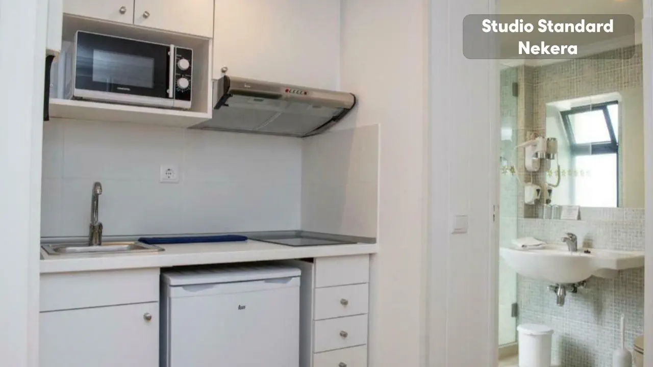Studio Standard - powierzchnia 23m2 - balkon - podwójne łóżko lub dwa pojedyncze łóżka - telewizor - biurko - w pełni wyposażona kuchnia - lodówka - mikrofalówka - łazienka z wanną lub prysznicem Studio Superior z widokiem na morze - powierzchnia 23m2 - balkon z widokiem na morze - podwójne łóżko lub dwa pojedyncze łóżka - telewizor - biurko - w pełni wyposażona kuchnia - lodówka - mikrofalówka - łazienka z wanną lub prysznicem