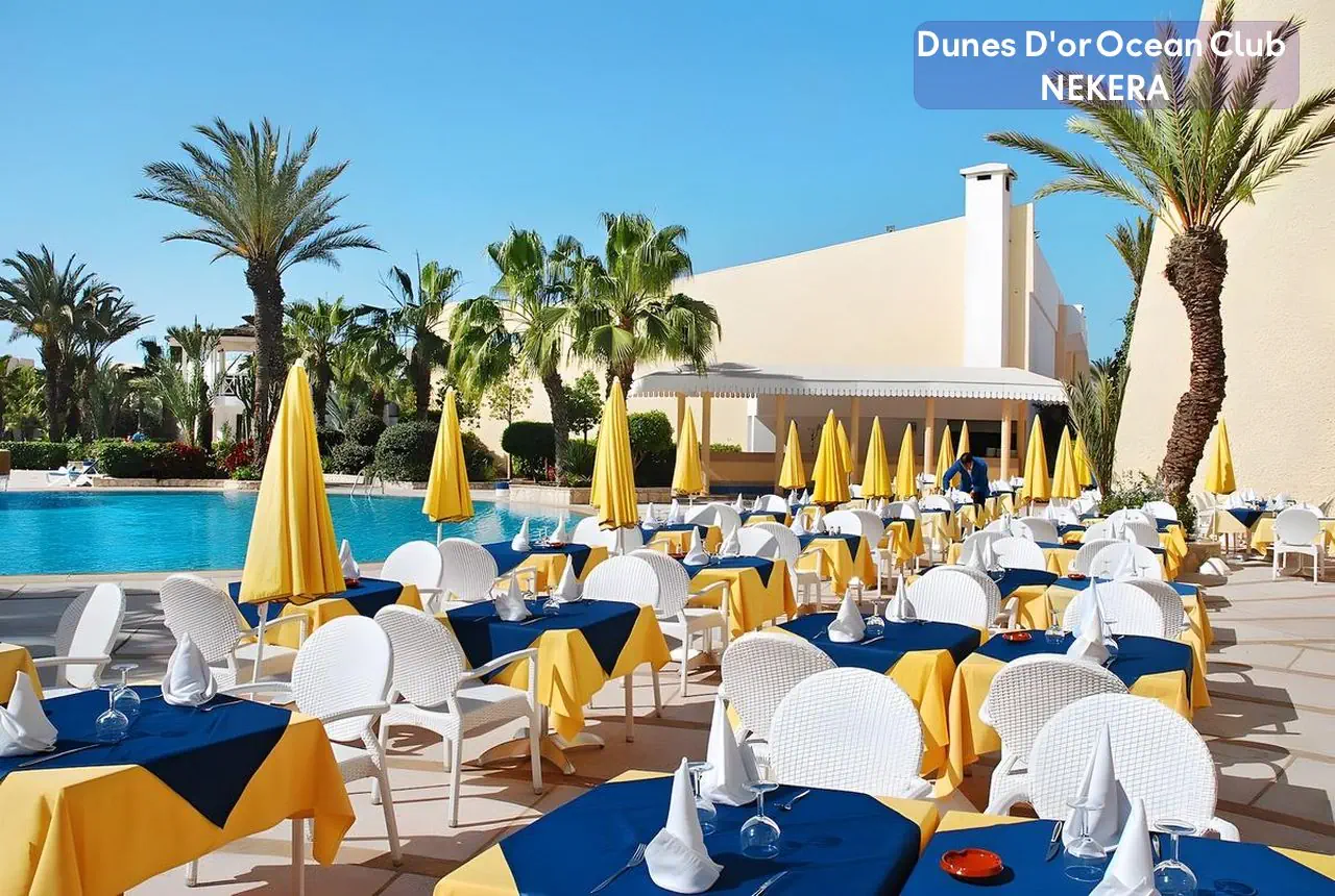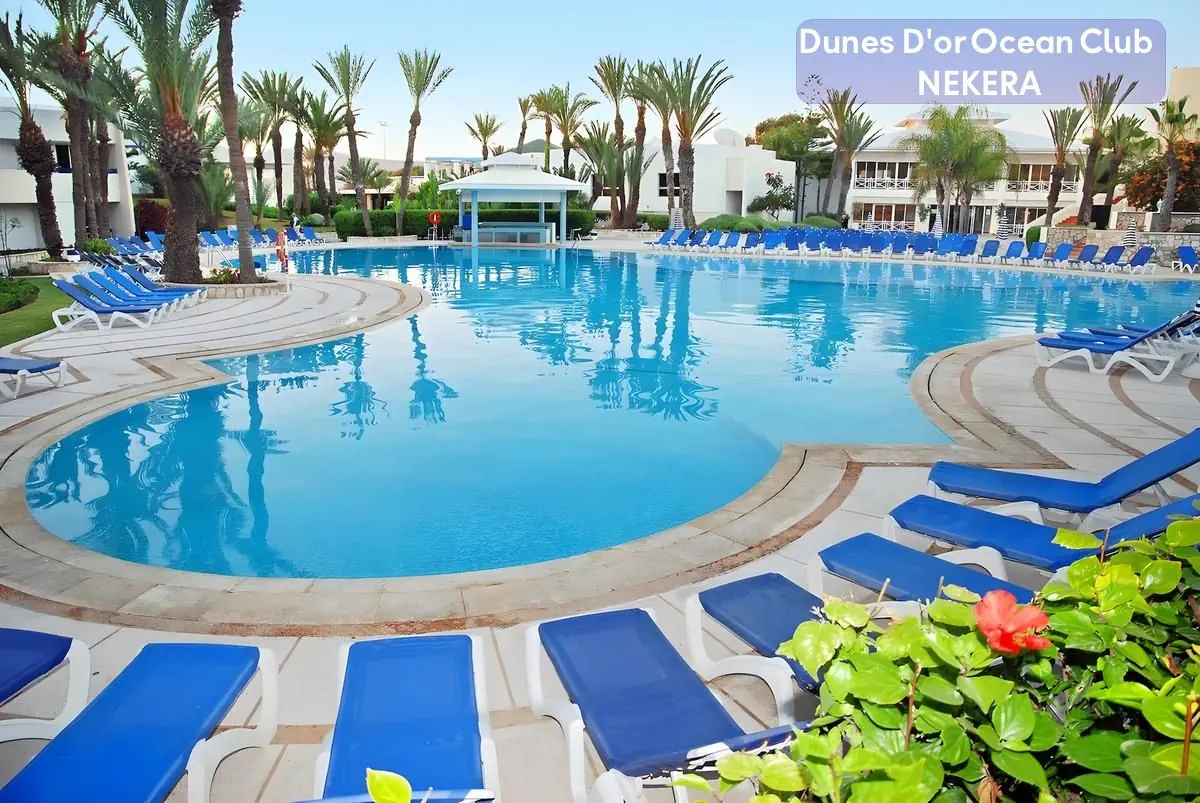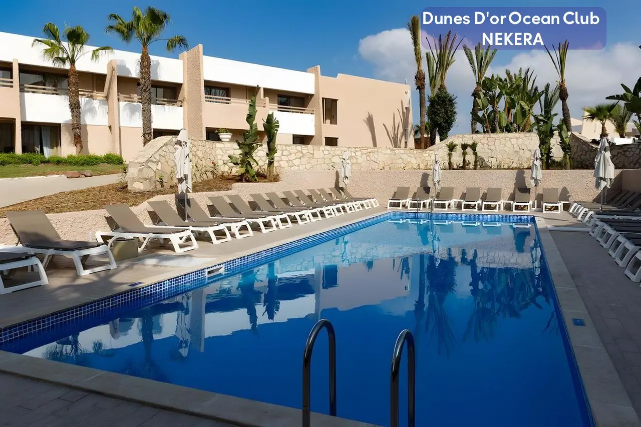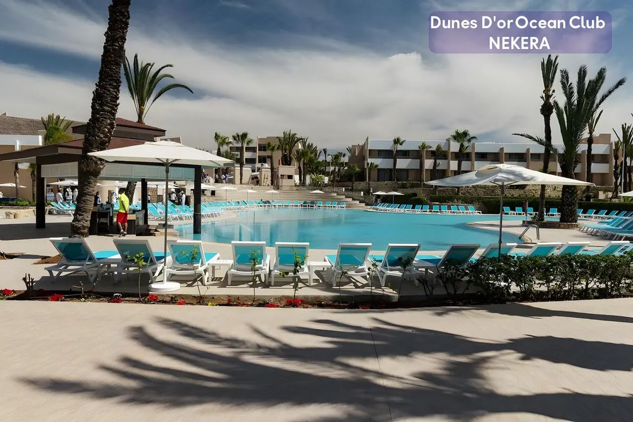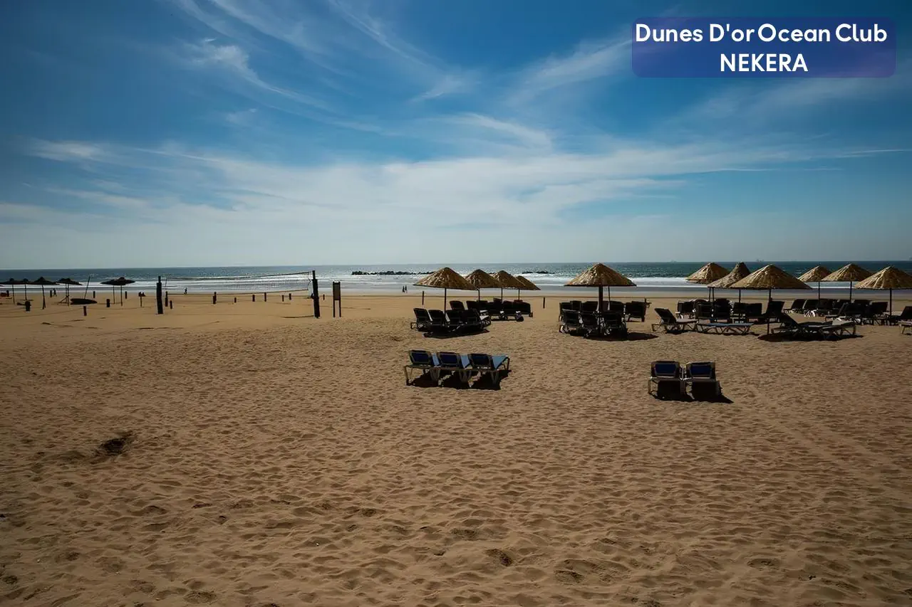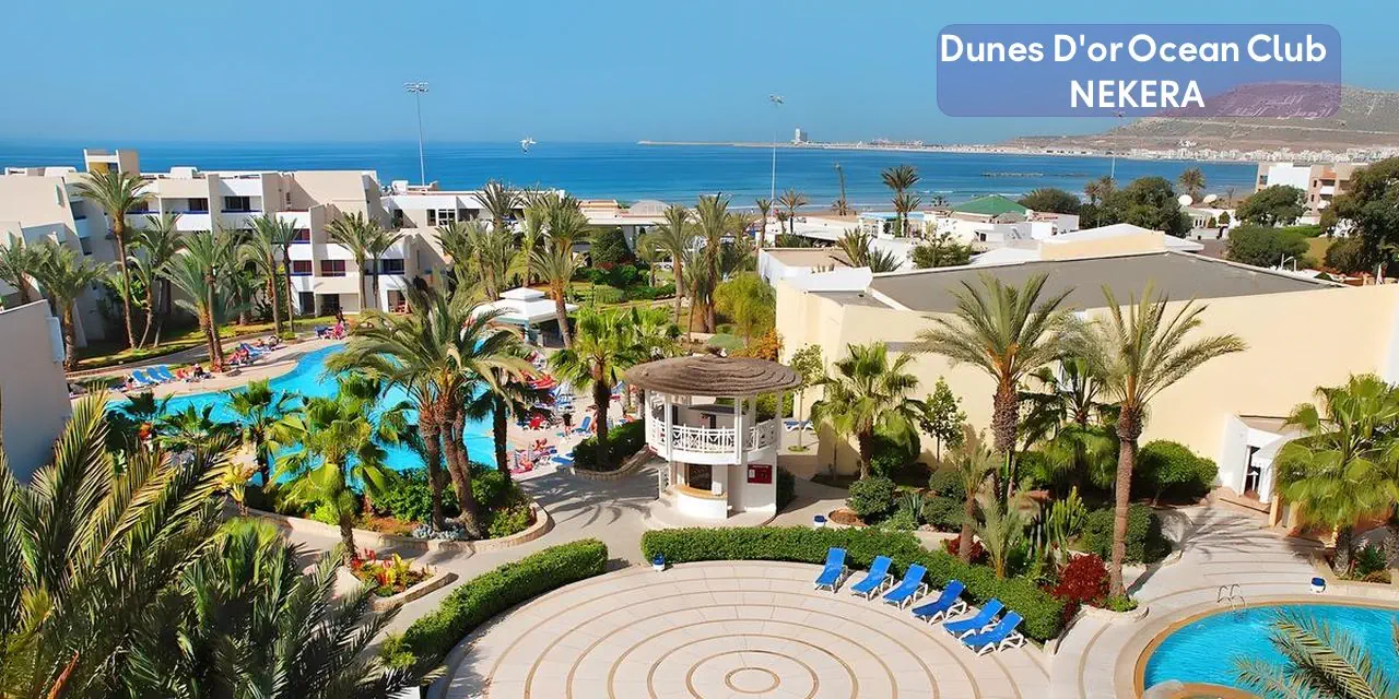 Czterogwiazdkowy, Hotel Dunes D’Or Ocean Club jest położony w malowniczej miejscowości Agadir, w południowym Maroku. Znajduje się bezpośrednio przy szerokiej, piaszczystej plaży, oferując gościom niepowtarzalne widoki na Ocean Atlantycki. Hotel jest otoczony pięknymi ogrodami, które tworzą spokojną i relaksującą atmosferę, idealną do wypoczynku. Ten obiekt to doskonały wybór dla osób poszukujących komfortowego i relaksującego wypoczynku nad Oceanem Atlantyckim. Dzięki swojej wyjątkowej lokalizacji, bogatej ofercie udogodnień oraz szerokiemu wachlarzowi atrakcji, hotel ten jest idealnym miejscem na niezapomniane wakacje w Maroku.