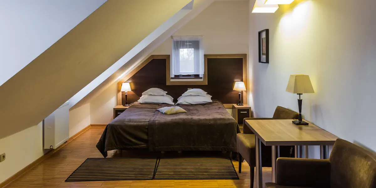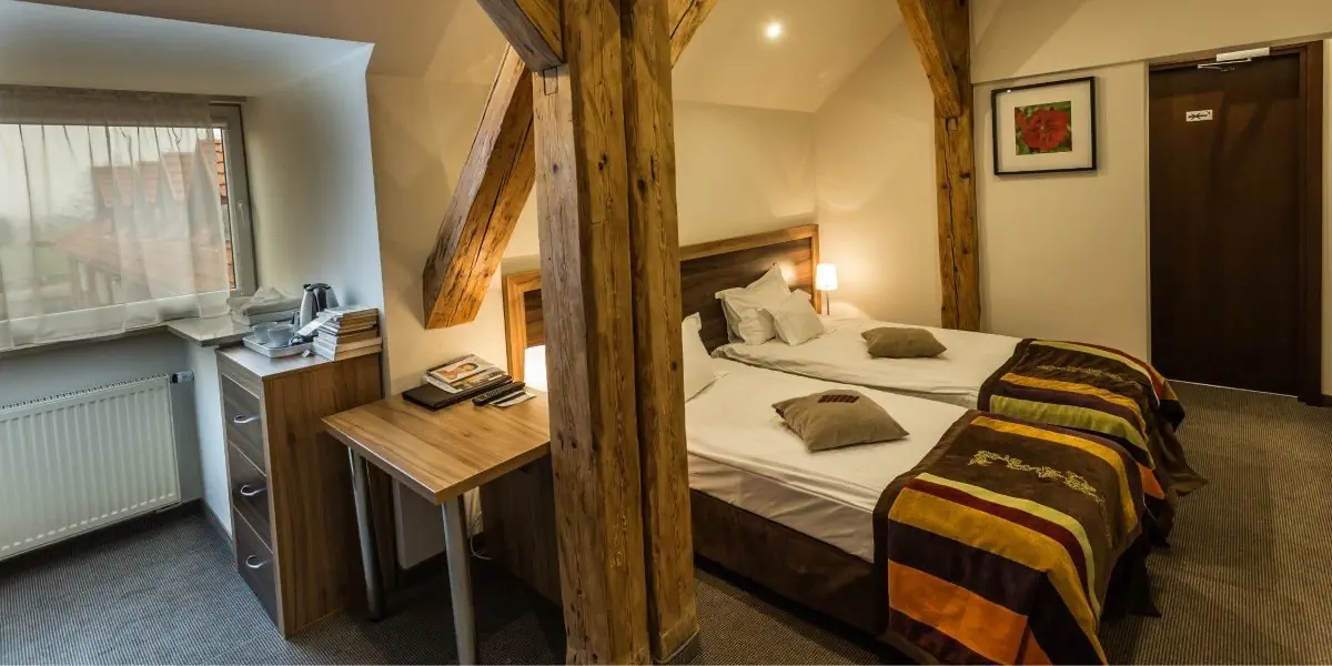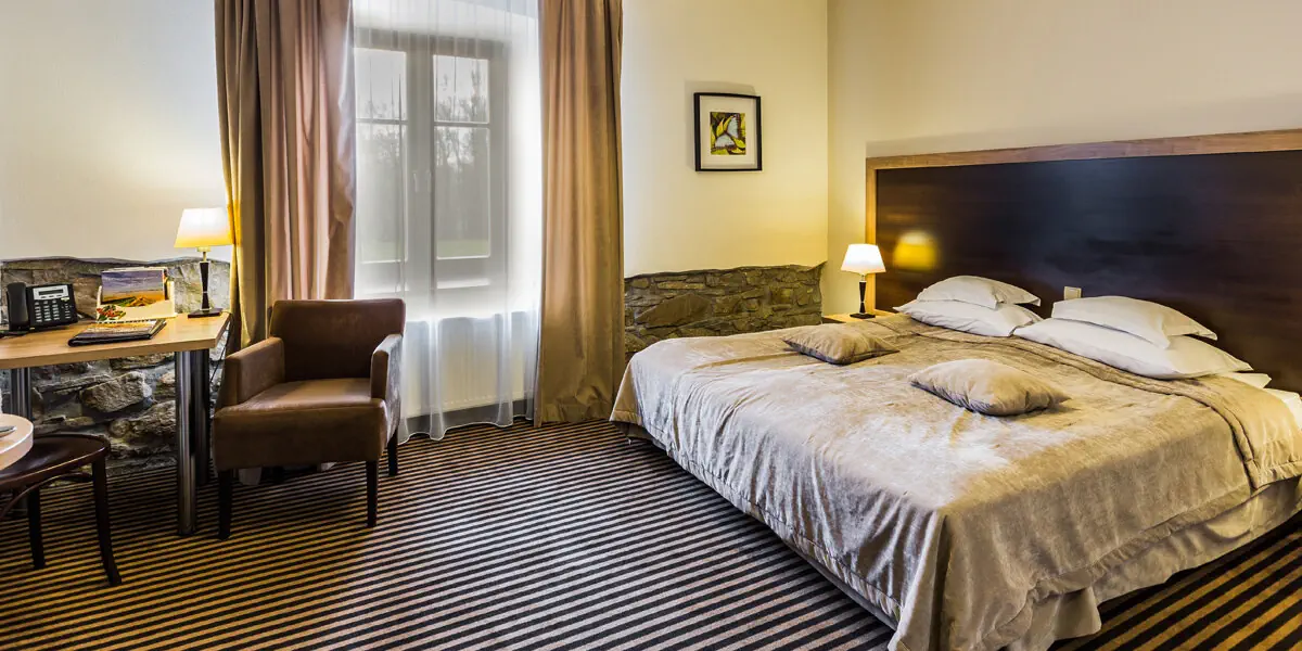 Klimatyczny pokój mieszczący się w dawnej Oficynie Dworskiej. W wyposażeniu: TV, telefon, Wi-Fi, czajnik W łazience znajduje się prysznic suszarka do włosów, zestaw ręczników i kosmetyków.
