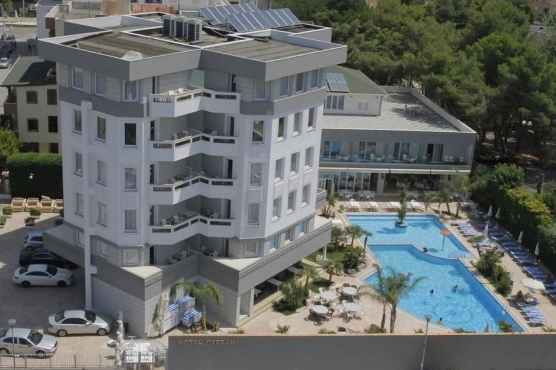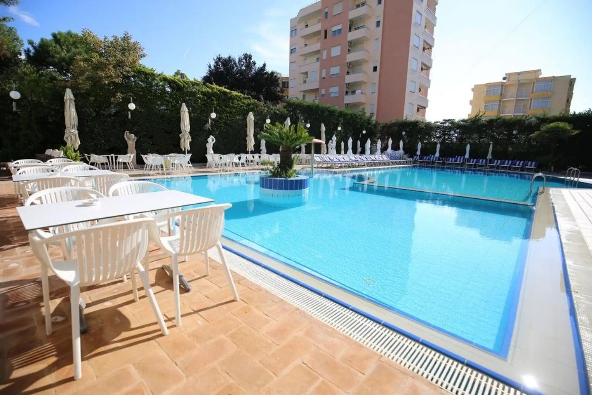 recepcja z sejfami, kantor, winda, bar, restauracja. Na zewnątrz basen.