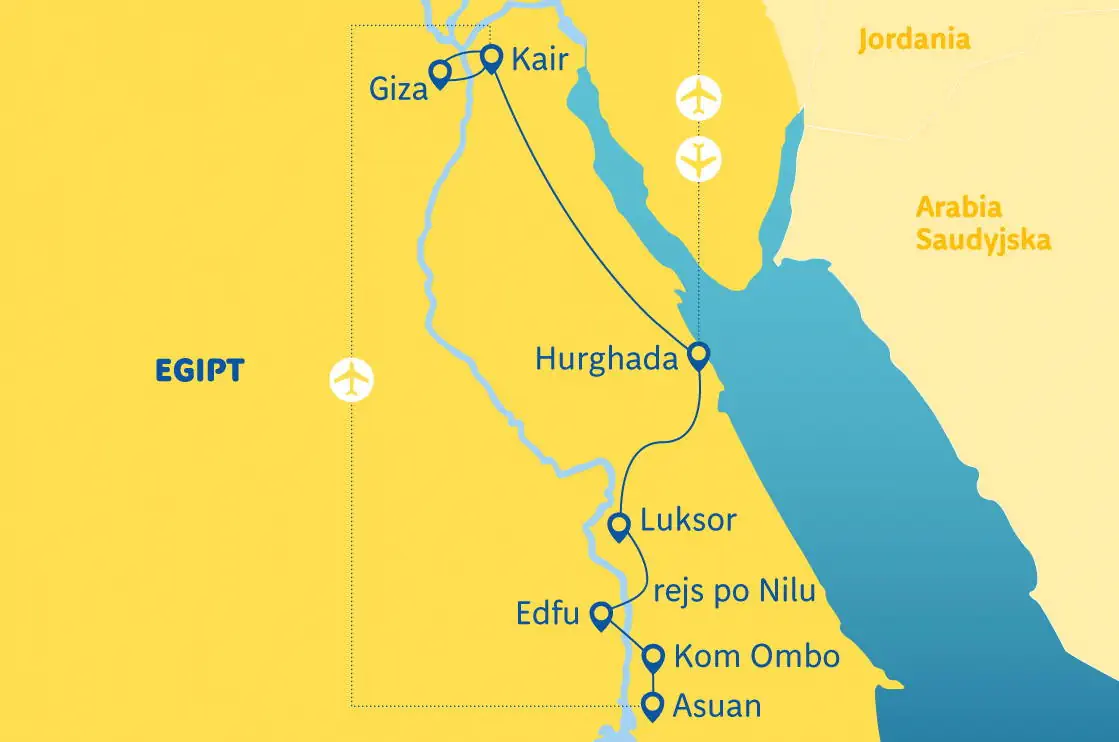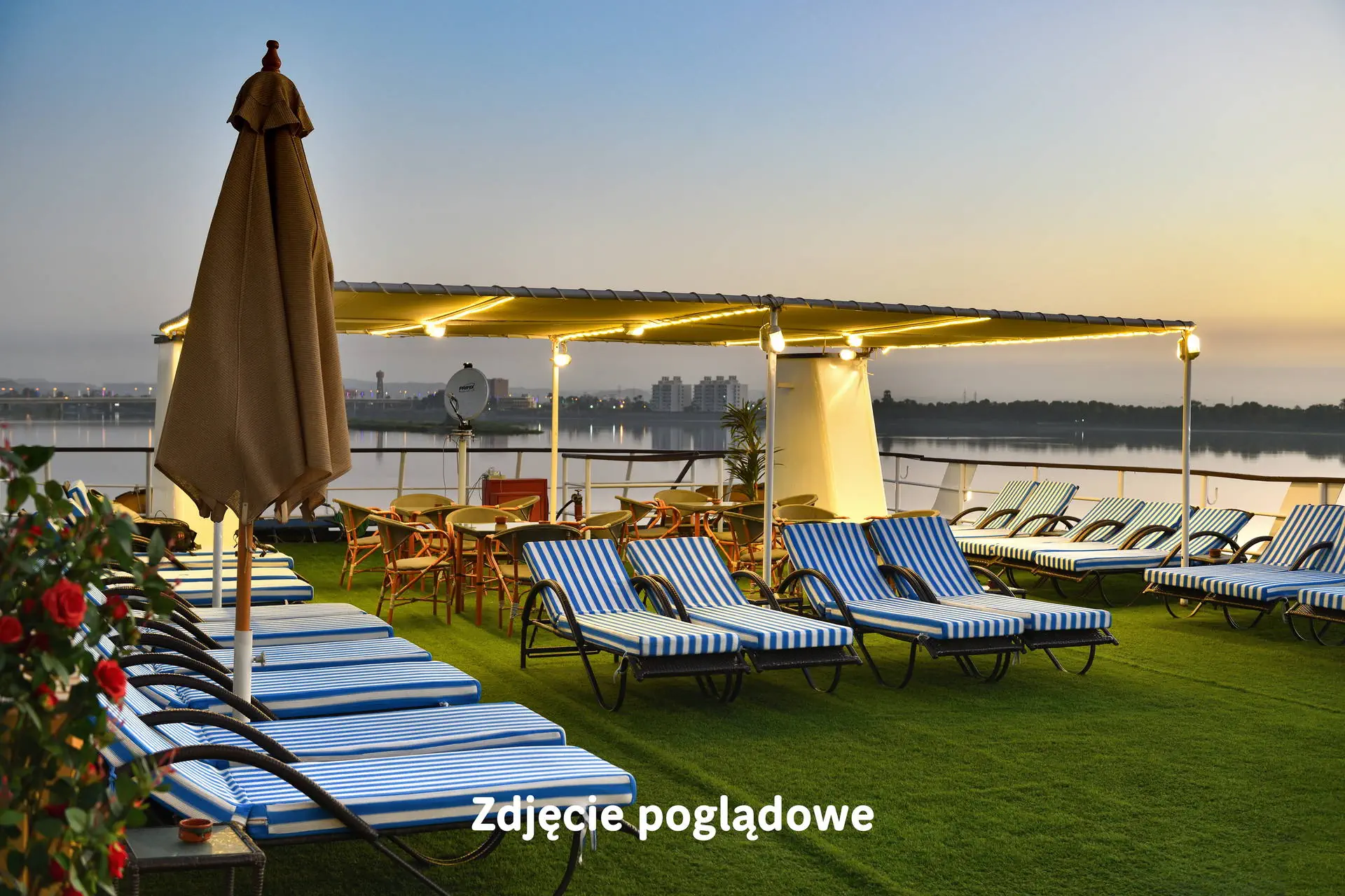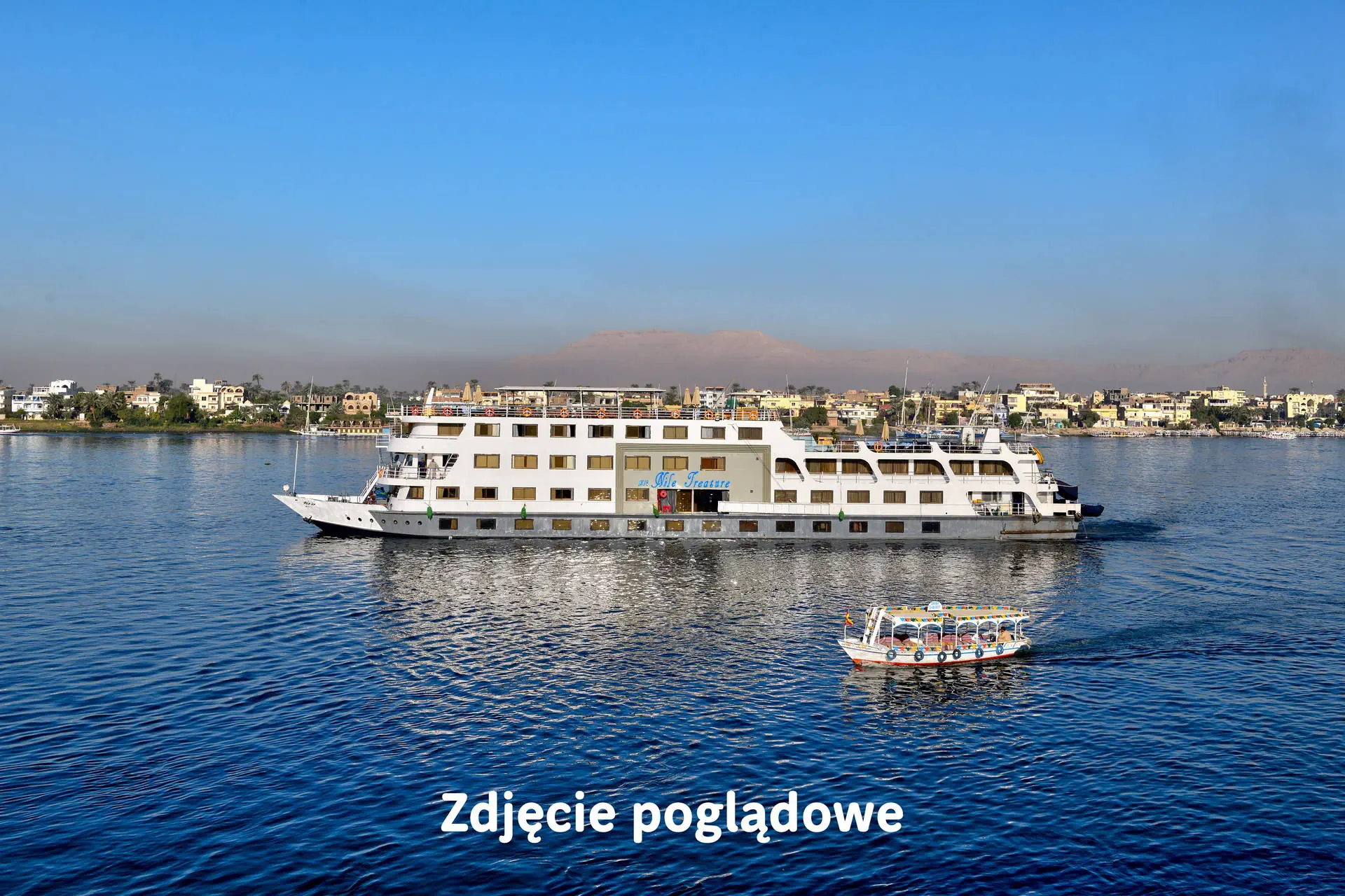 Do dyspozycji gości Część objazdowa: w hotelu restauracja oraz bar. Rejs po Nilu statkiem ****: restauracja, bar, mały basen oraz leżaki. Wyżywienie Część objazdowa: śniadania oraz lunche lub kolacje (wg. opisu w programie). W pociągu kolacja i śniadanie. Rejs po Nilu statkiem: śniadania, lunche i kolacje. Za dopłatą wersja All Inclusive na statku: w tym lokalne napoje alkoholowe (piwo, wino) i bezalkoholowe (soki, woda, napoje gazowane) serwowane w głównym barze, najczęściej od 10.00 - 22.00. Uwaga!!!Napoje ze względów bezpieczeństwa podawane są w plastikowych kubkach. Zakwaterowanie Część objazdowa Hotele *** o średnim standardzie - (5 rozpoczętych dób hotelowych: 2 - w Hurghadzie - w hotelu Empire*** lub podobnym albo za dopłatą 4* Grand Seas Hostmark lub podobny; 3 - w Kairze - w hotelu Mayorca*** lub podobnym). Jedna noc w pociągu sypialnym - przedziały tylko 2 - osobowe. Uwaga!Pociągi w Egipcie różnią się znacznie od tych europejskich, dlatego też należy być przygotowanym na pewne niewygody i nie zawsze najczystsze warunki podróżowania. Pokoje: 2 - osobowe (możliwość dostawki), wszystkie klimatyzowane z łazienkami oraz najczęściej TV-sat. Rejs po Nilu statkiem **** (4 rozpoczęte doby hotelowe). Kabiny: wygodne i klimatyzowane, 2 - osobowe (możliwość dostawki) z łazienką i wc. Część pobytowa Hotele (4 rozpoczęte doby hotelowe) - w Hurghadzie, w wybranym hotelu (świadczenia jak w opisie hotelu) Uwaga!!! Dopłata za wersję All Inclusive w hotelach w trakcie części pobytowej, obowiązuje dopiero po powrocie z objazdu w trakcie ostatnich 4 nocy w Hurghadzie.