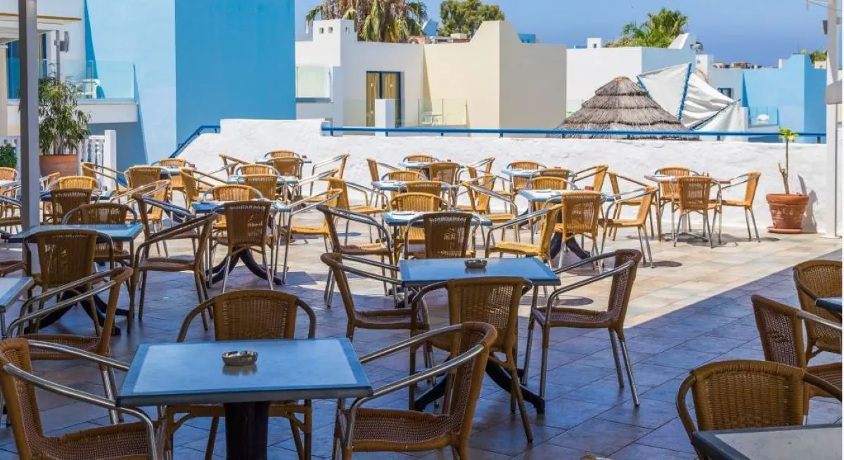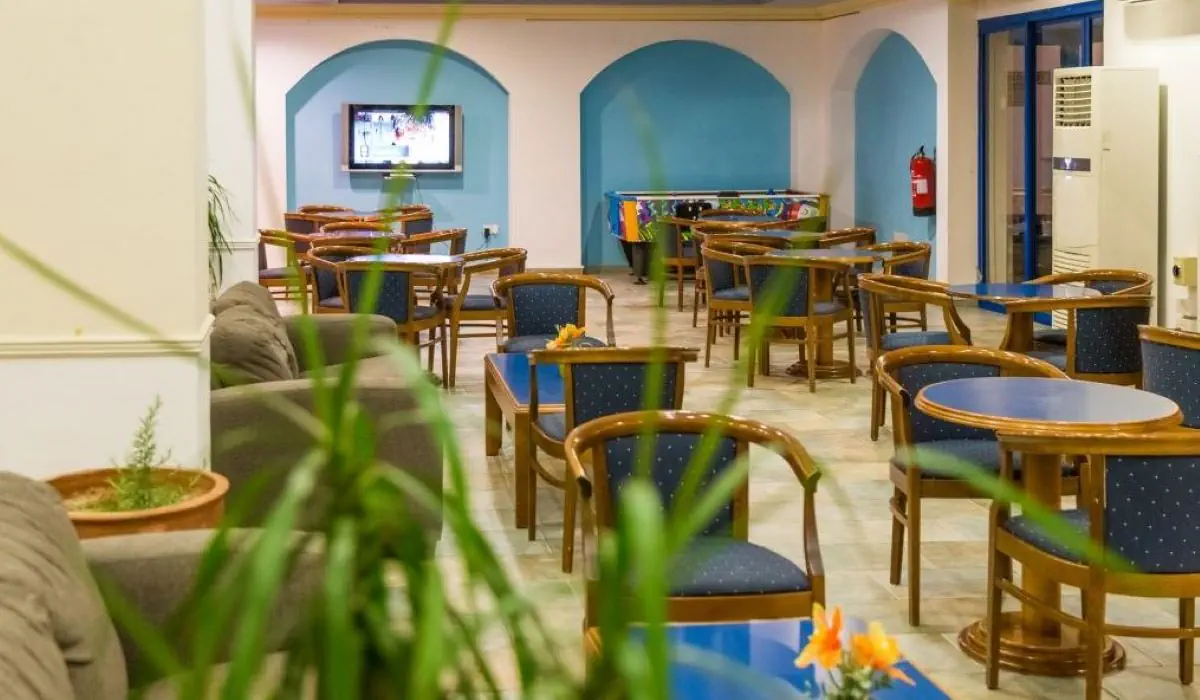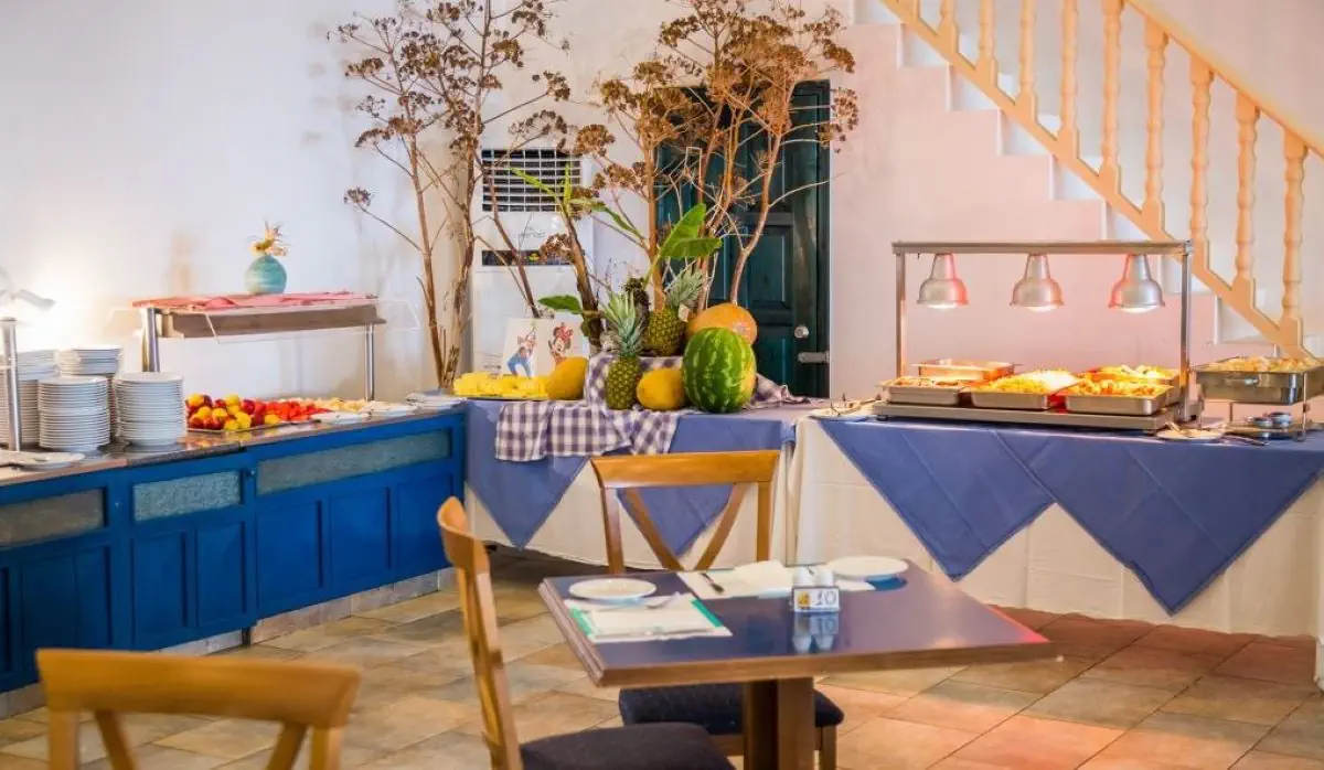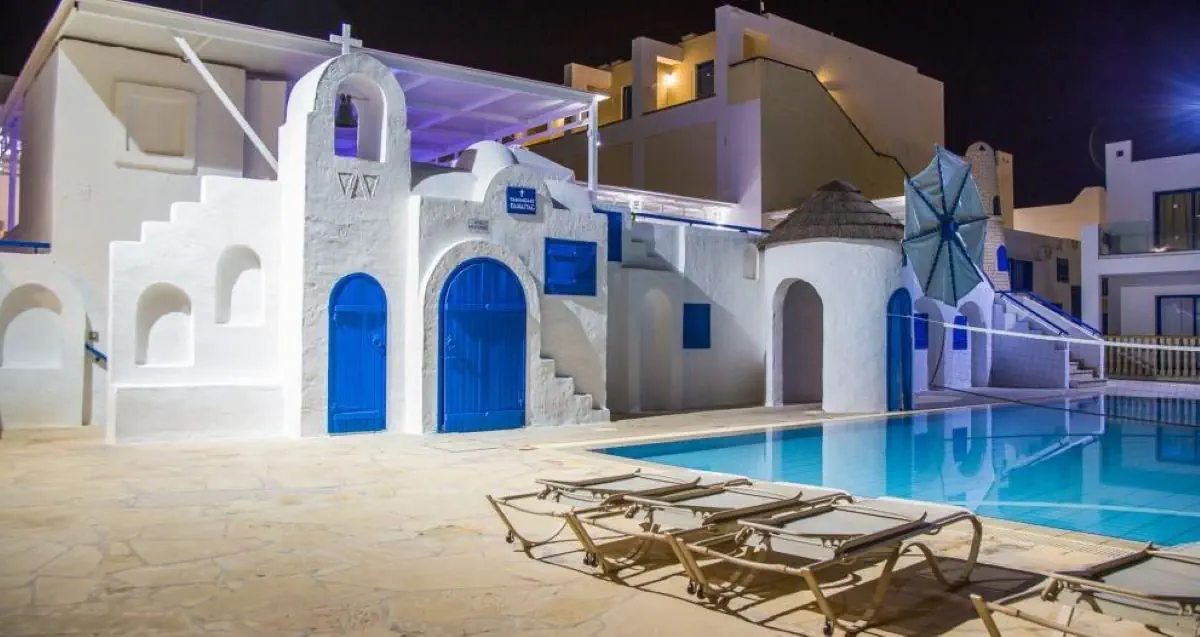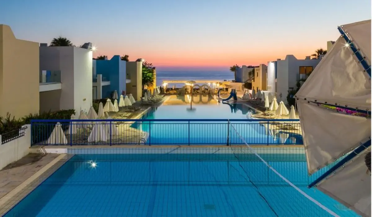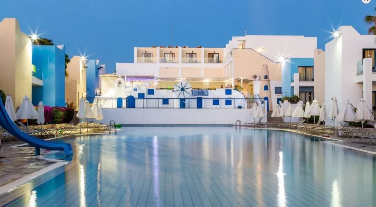 kompleks hotelowy, składający się z budynku głównego i 21 bungalowów i oferuje 141 pokoi. Do dyspozycji Gości: hol powitalny z recepcją, miejsca do wypoczynku, sejfy (za opłatą 13 EUR/tydz.), minimarket, restauracja główna, grecka tawerna, lobby bar. Na zewnątrz znajdują sie dwa baseny, bar z napojami i przekąskami oraz taras słoneczny z bezpłatnymi leżakami i parasolami słonecznymi.
