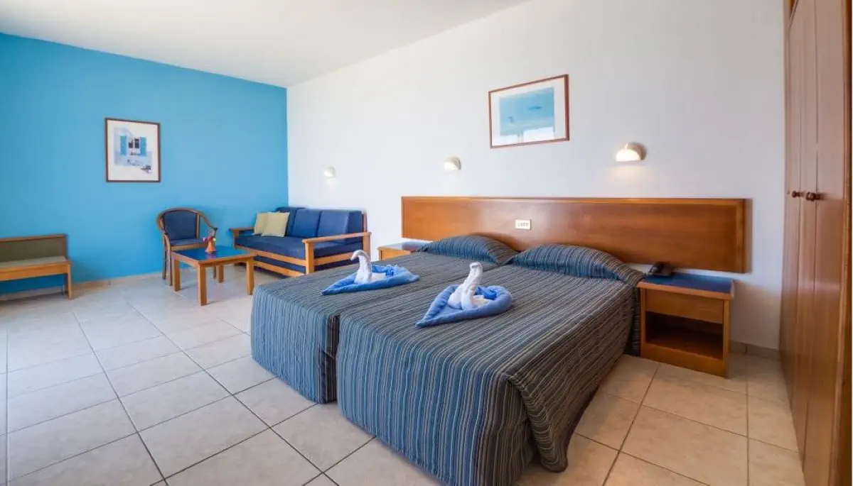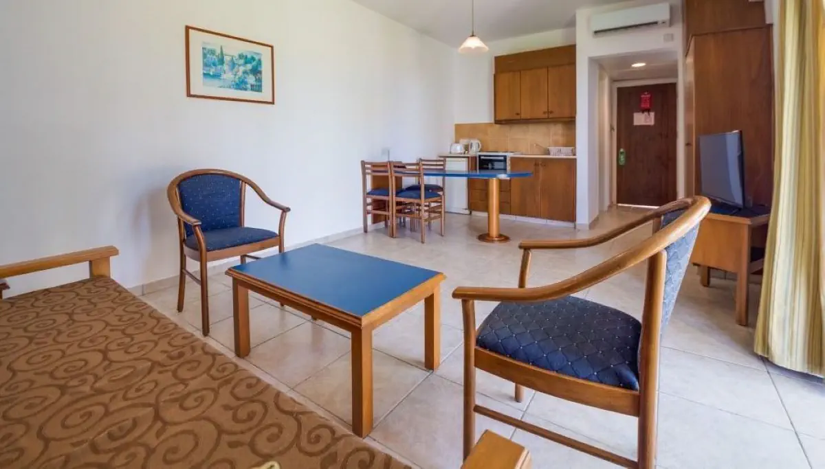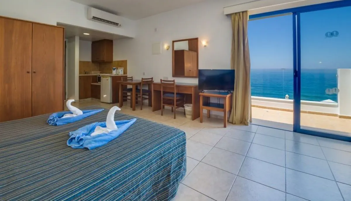 studio dwuosobowe (STUDIO DBL): ok. 35 m2; jedno przestronne pomieszczenie, wnęka kuchenna, czajnik elektryczny, minilodówka, toster, część jadalna, rozkładana sofa, klimatyzacja, sejf, TV-Sat., balkon lub taras, wanna lub prysznic, WC, suszarka. Studio dwuosobowe z bocznym widokiem na morze (STUDIO DBL SSV). Apartamenty (APT ONE BEDROOM LV): ok. 45 m2; pomieszczenie dzienno-sypialne oraz sypialnia. Poza tym wyposażone jak studia dwuosobowe. Apartament z bocznym widokiem na morze (APT ONE BEDROOM SSV).