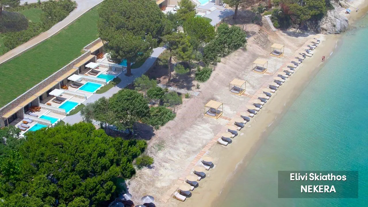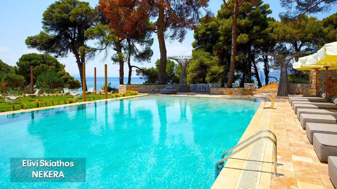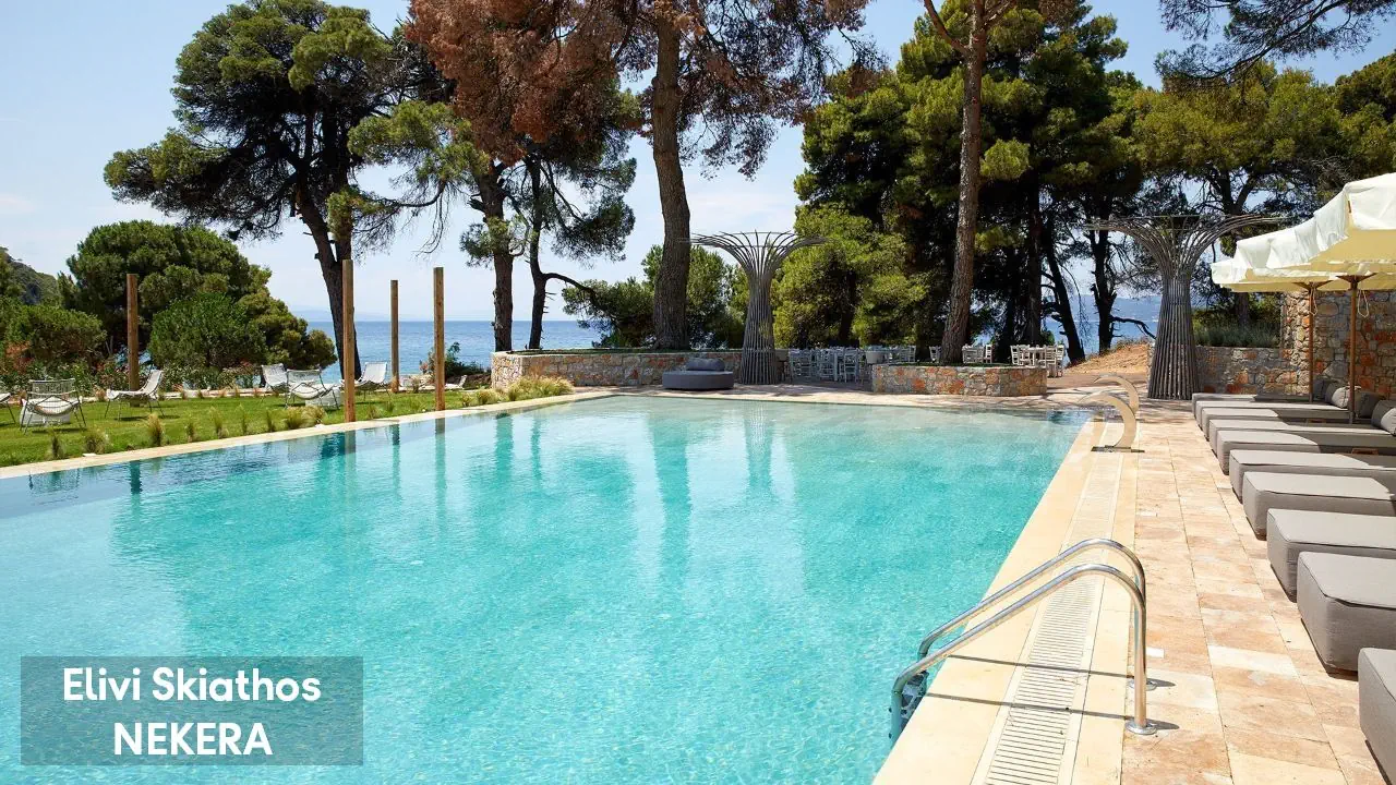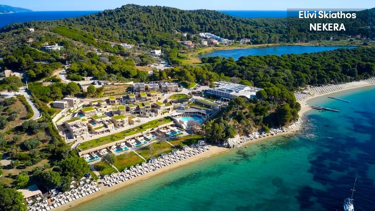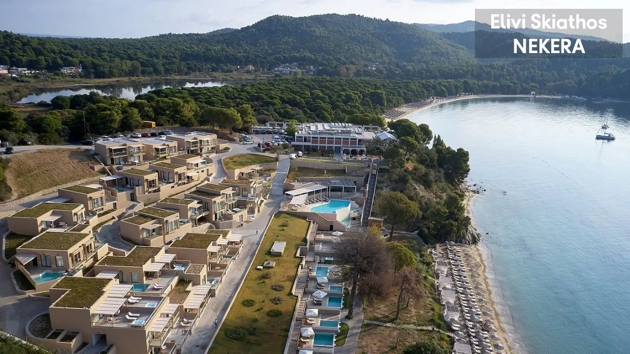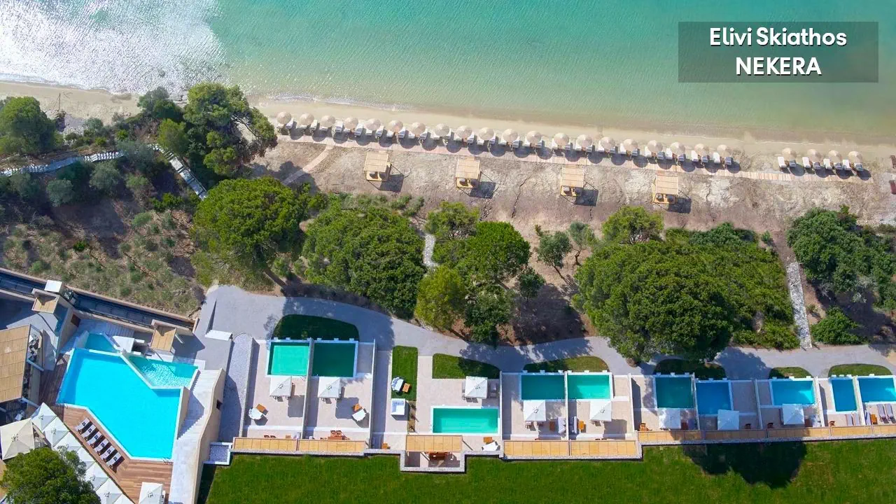 pięciogwiazdkowy hotel resortowy na rozległej przestrzeni 86 ha, usytuowany na półwyspie w lasku piniowym. Hotel z rozległą panoramą na morze, usytuowany w budynku głównym i bunaglowach oferuje zakwaterowanie w 90 pokojach, suitach i willach w czterech częściach: ELIVI Xenia, ELIVI Nest Gorove, ELIVI Nest Infinity, ELIVI Grace. Do dyspozycji Gości: 24h recepcja, klimatyzacja, przestronne lobby, usługi concierge, strefa basenów zewnętrznych: Elvi Nest o pow. 200m2, Elvi Grace o nieregularnej powierzchni 90m2, parasole słoneczne, materace i leżaki, ręczniki plażowe przy basenie, tarasy słoneczne, restauracje śniadaniowe Xenia oraz Nest , 4 restauracji a la carte (dodatkowo płatna: Leda & The Swan - kuchnia śródziemnomorska, Hagoromo – kuchnia japońska, La Trattoria – kuchnia śródziemnomorska, Fresh Fish – z owocami morza), 4 bary (w tym trzy na plaży), przechowalnia bagażu, całodobowa ochrona. Dodatkowo płatne: room serwis 24h, usługi concierge, usługa prania/prasowa, wymiana walut, wypożyczalnia samochodów i skuterów i rowerów, transfer do/z portu Skiathos, fryzjer, sale konferencyjne.