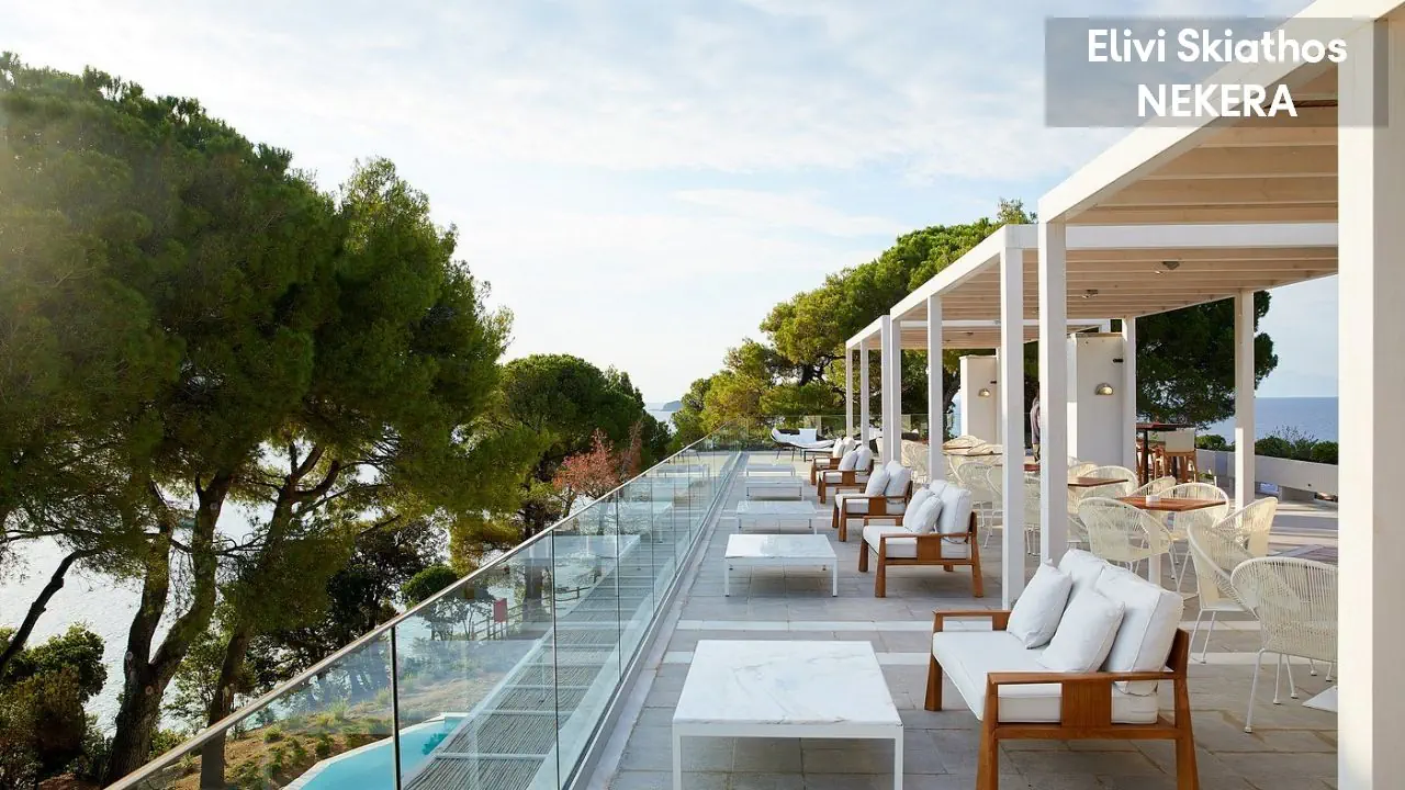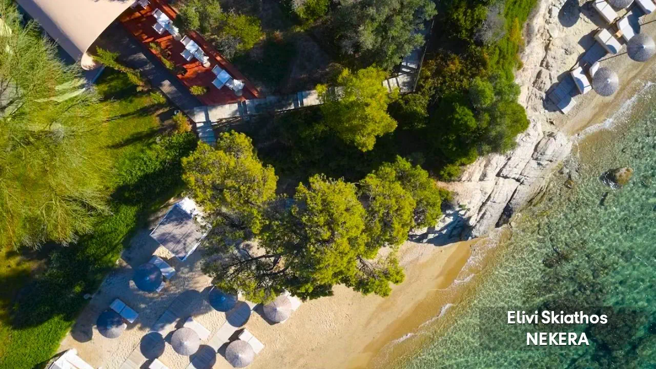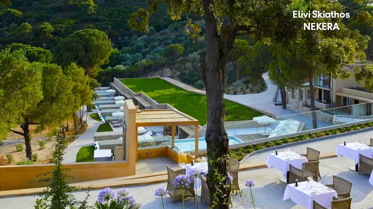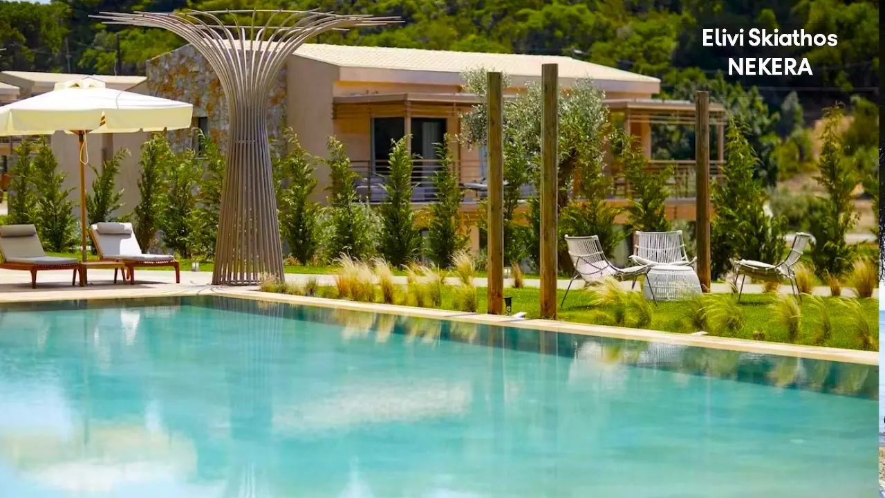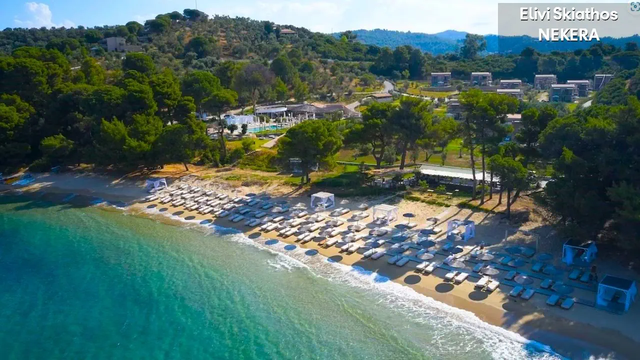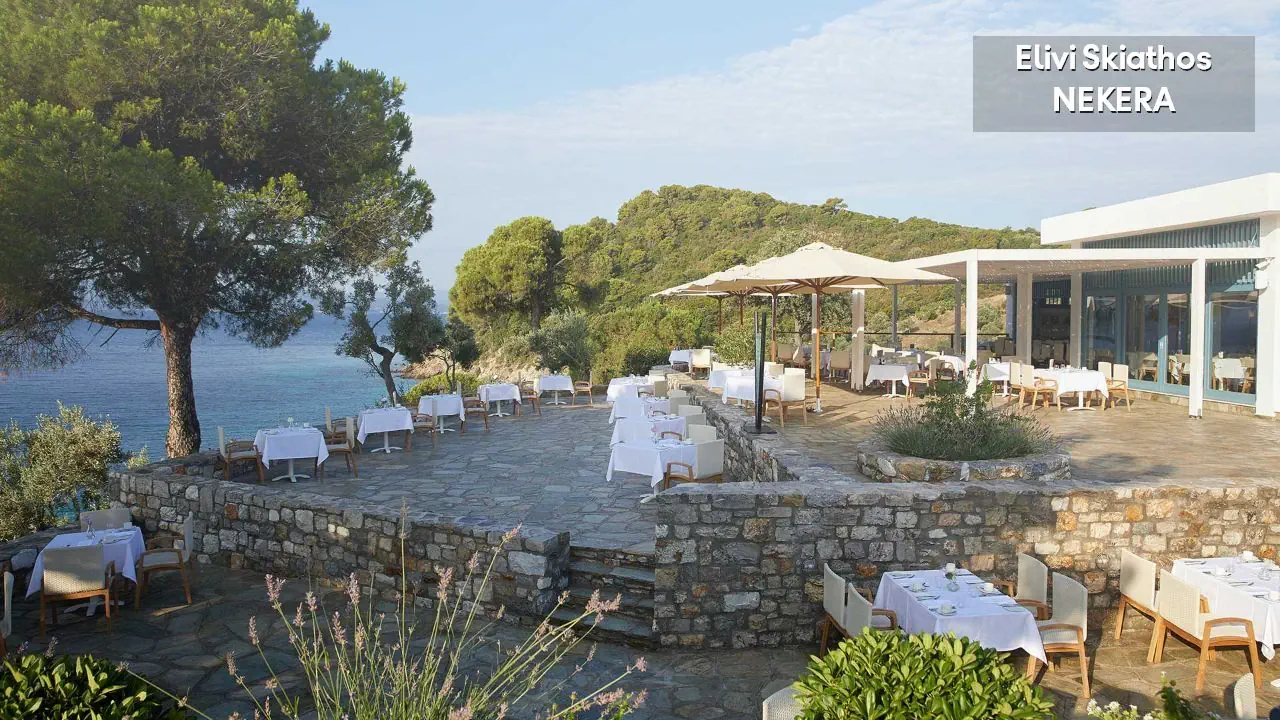 pięciogwiazdkowy hotel resortowy na rozległej przestrzeni 86 ha, usytuowany na półwyspie w lasku piniowym. Hotel z rozległą panoramą na morze, usytuowany w budynku głównym i bunaglowach oferuje zakwaterowanie w 90 pokojach, suitach i willach w czterech częściach: ELIVI Xenia, ELIVI Nest Gorove, ELIVI Nest Infinity, ELIVI Grace. Do dyspozycji Gości: 24h recepcja, klimatyzacja, przestronne lobby, usługi concierge, strefa basenów zewnętrznych: Elvi Nest o pow. 200m2, Elvi Grace o nieregularnej powierzchni 90m2, parasole słoneczne, materace i leżaki, ręczniki plażowe przy basenie, tarasy słoneczne, restauracje śniadaniowe Xenia oraz Nest , 4 restauracji a la carte (dodatkowo płatna: Leda & The Swan - kuchnia śródziemnomorska, Hagoromo – kuchnia japońska, La Trattoria – kuchnia śródziemnomorska, Fresh Fish – z owocami morza), 4 bary (w tym trzy na plaży), przechowalnia bagażu, całodobowa ochrona. Dodatkowo płatne: room serwis 24h, usługi concierge, usługa prania/prasowa, wymiana walut, wypożyczalnia samochodów i skuterów i rowerów, transfer do/z portu Skiathos, fryzjer, sale konferencyjne.