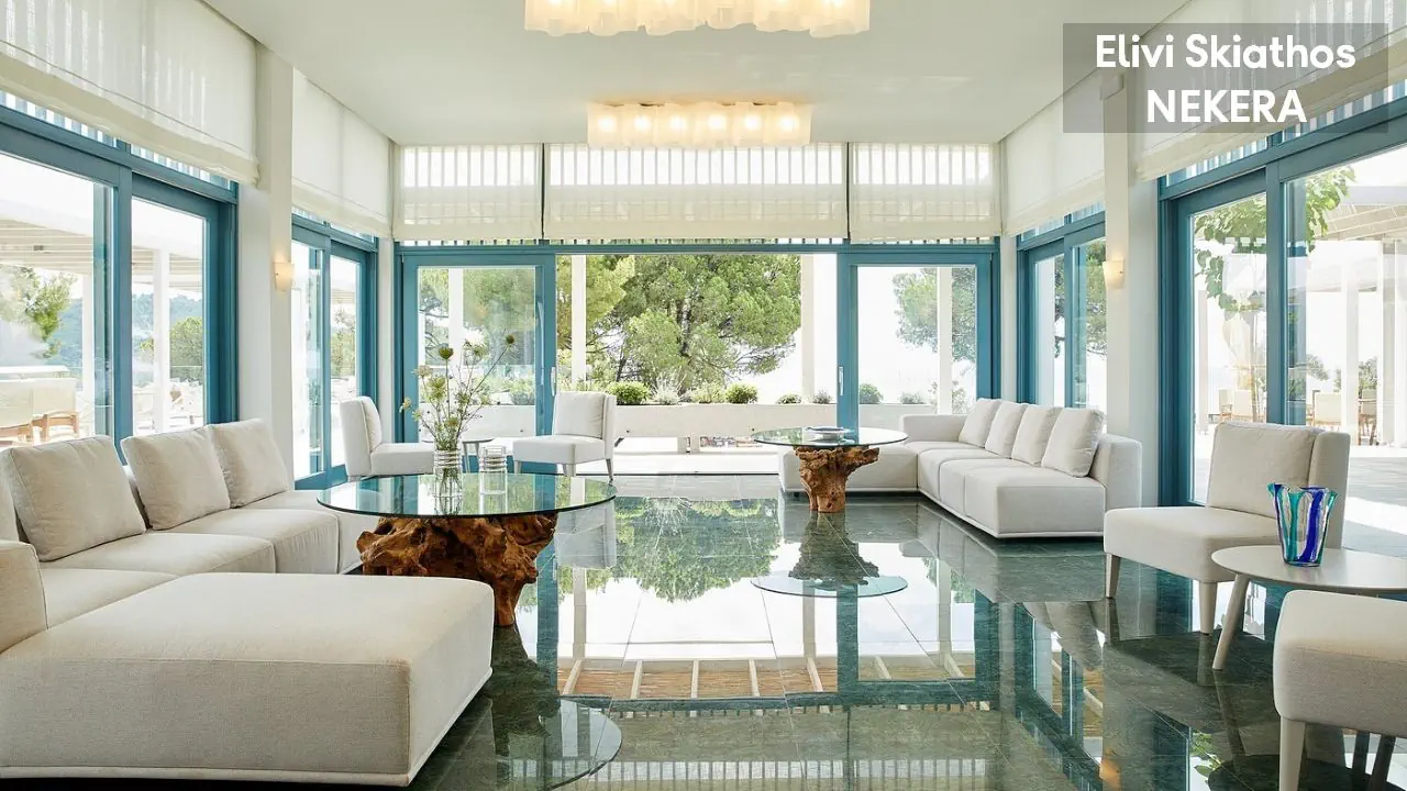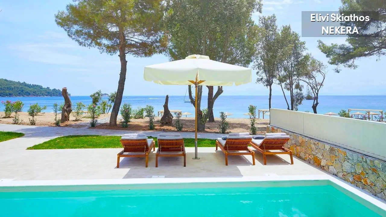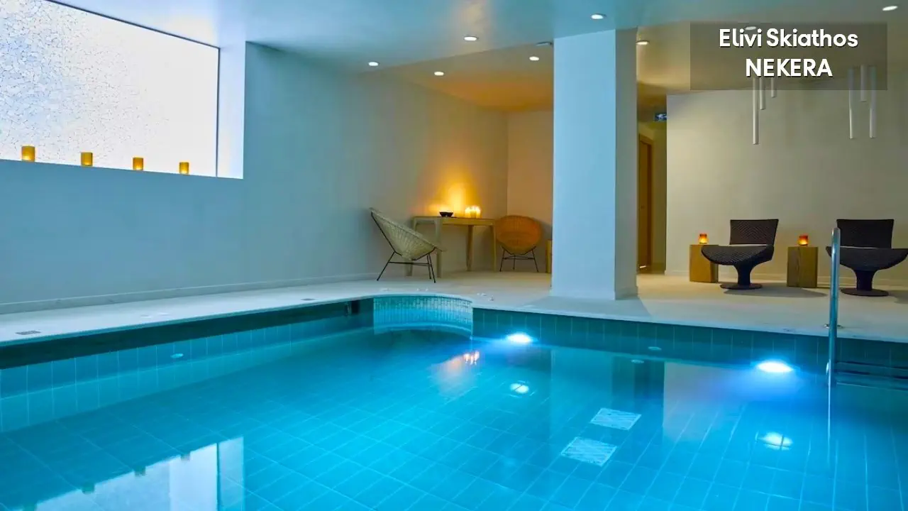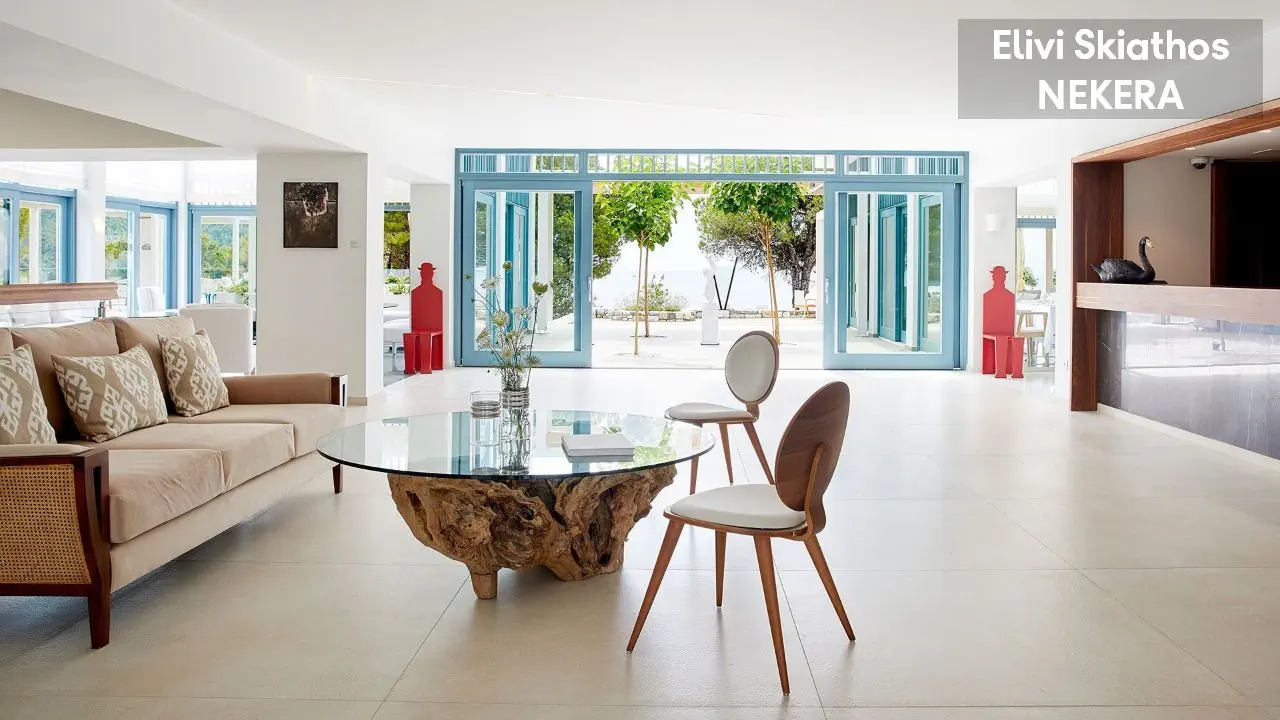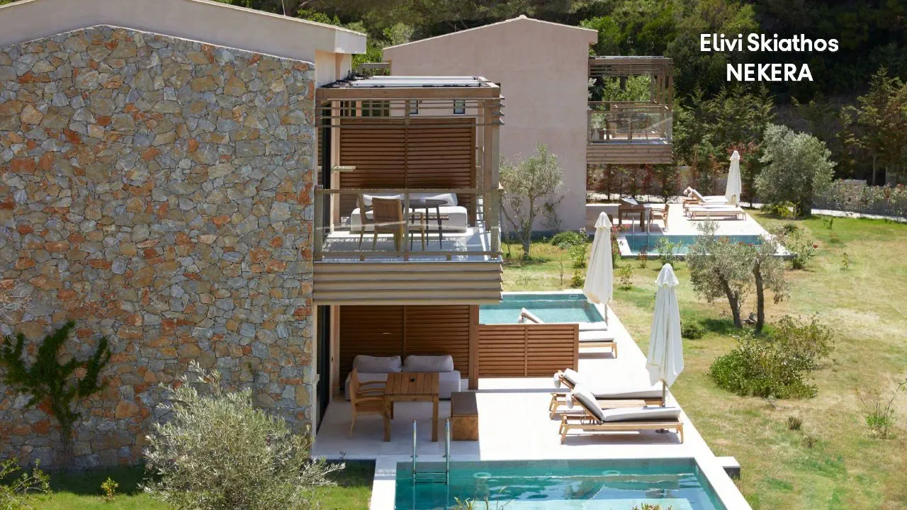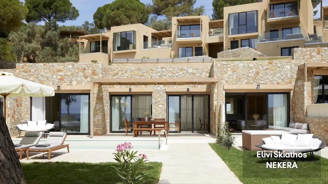 pięciogwiazdkowy hotel resortowy na rozległej przestrzeni 86 ha, usytuowany na półwyspie w lasku piniowym. Hotel z rozległą panoramą na morze, usytuowany w budynku głównym i bunaglowach oferuje zakwaterowanie w 90 pokojach, suitach i willach w czterech częściach: ELIVI Xenia, ELIVI Nest Gorove, ELIVI Nest Infinity, ELIVI Grace. Do dyspozycji Gości: 24h recepcja, klimatyzacja, przestronne lobby, usługi concierge, strefa basenów zewnętrznych: Elvi Nest o pow. 200m2, Elvi Grace o nieregularnej powierzchni 90m2, parasole słoneczne, materace i leżaki, ręczniki plażowe przy basenie, tarasy słoneczne, restauracje śniadaniowe Xenia oraz Nest , 4 restauracji a la carte (dodatkowo płatna: Leda & The Swan - kuchnia śródziemnomorska, Hagoromo – kuchnia japońska, La Trattoria – kuchnia śródziemnomorska, Fresh Fish – z owocami morza), 4 bary (w tym trzy na plaży), przechowalnia bagażu, całodobowa ochrona. Dodatkowo płatne: room serwis 24h, usługi concierge, usługa prania/prasowa, wymiana walut, wypożyczalnia samochodów i skuterów i rowerów, transfer do/z portu Skiathos, fryzjer, sale konferencyjne.