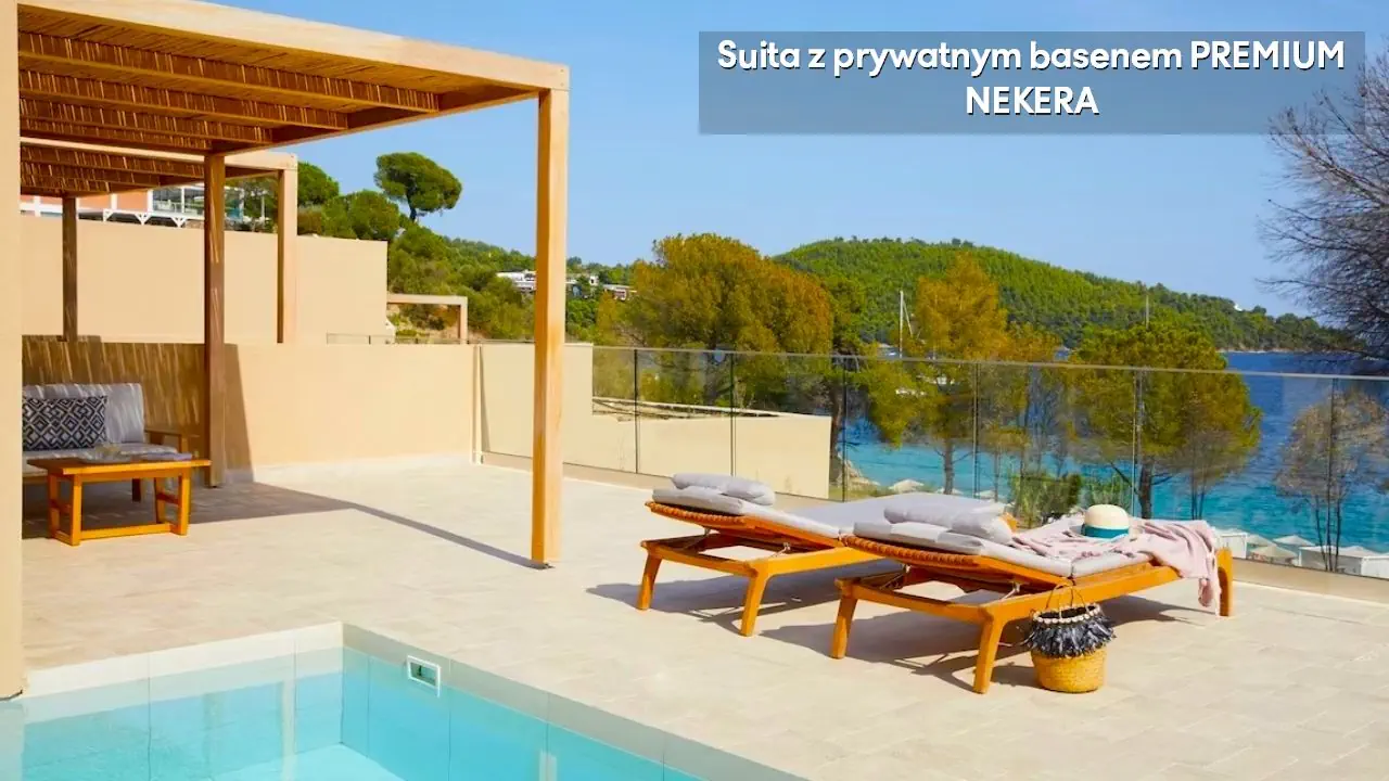 hotelowa, piaszczysta plaża Ambelakia, Big Banana, bezpośrednio przy hotelu. Łagodne zejście do wody, turkusowa woda, złoty piasek. Leżaki, materace i parasole słoneczne(w cenie). Słynna plaża Koukounaries długa na ok.1 km i szeroka na ok. 25 m, o ok. 100 m od hotelu. Łagodne wejście do wody. W sezonie ratownik na plaży. Leżaki i parasole słoneczne: dodatkowa opłata. Obydwie plaże posiadają certyfikat Błękitnej Flagi, nadawany najpiękniejszym i najczystszym plażom na świecie.