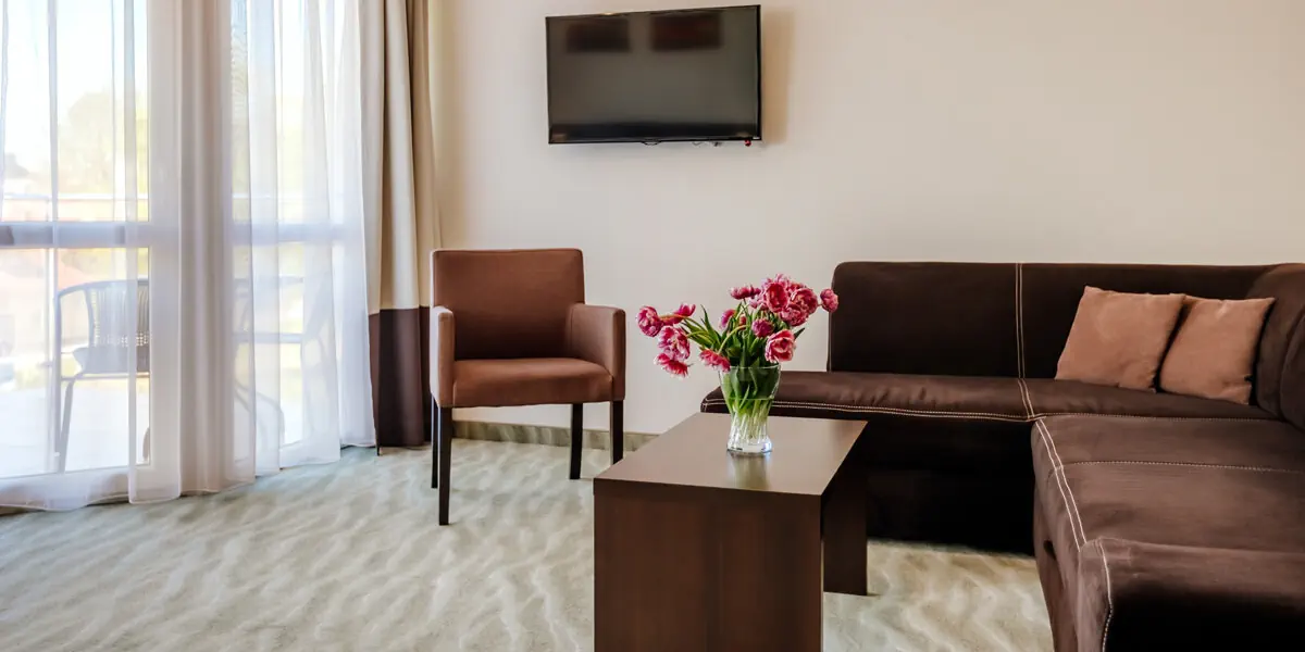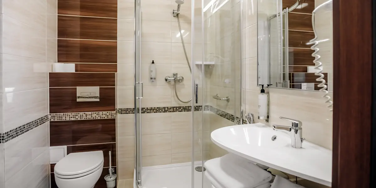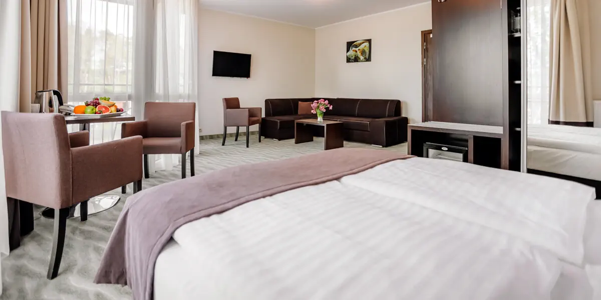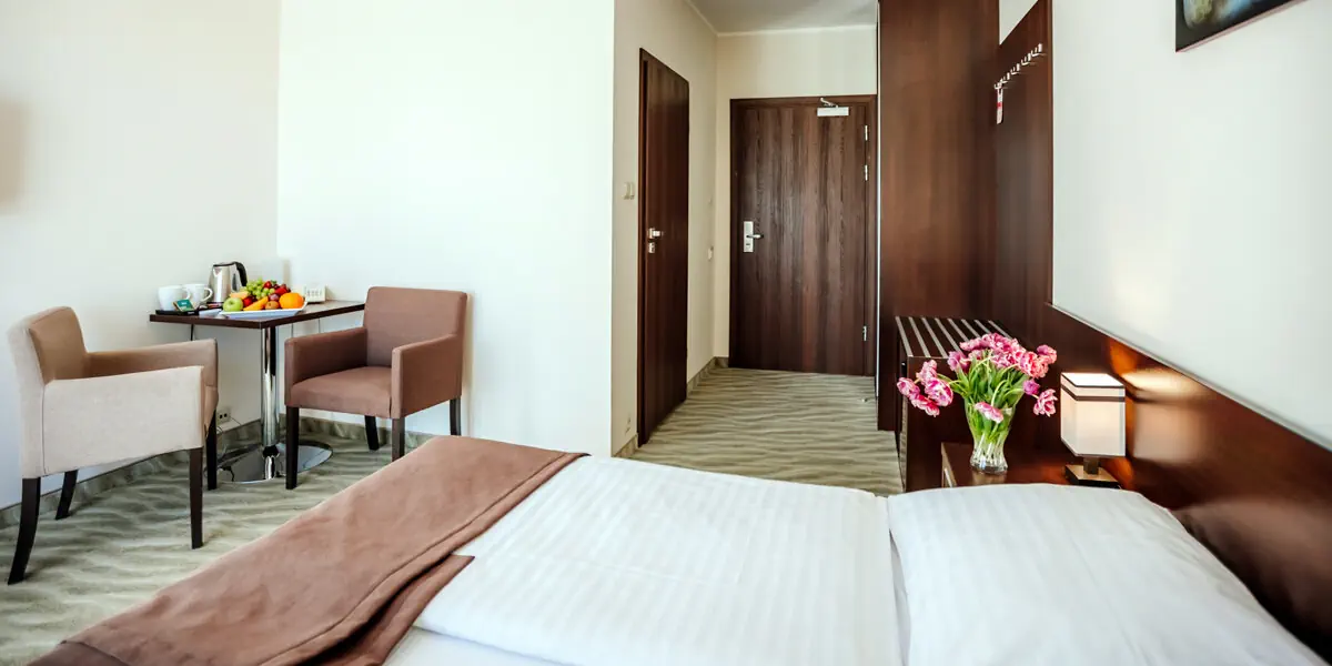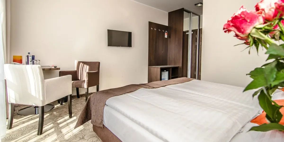 Komfortowy pokój wyposażony w dostęp do Wi-Fi, telewizor, sejf, lodówkę oraz nowoczesną łazienkę z prysznicem i suszarką oraz komplet kosmetyków.