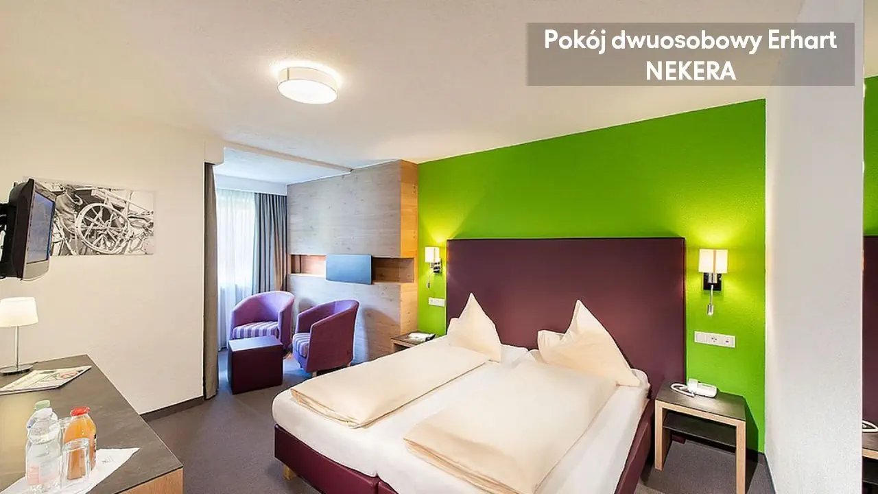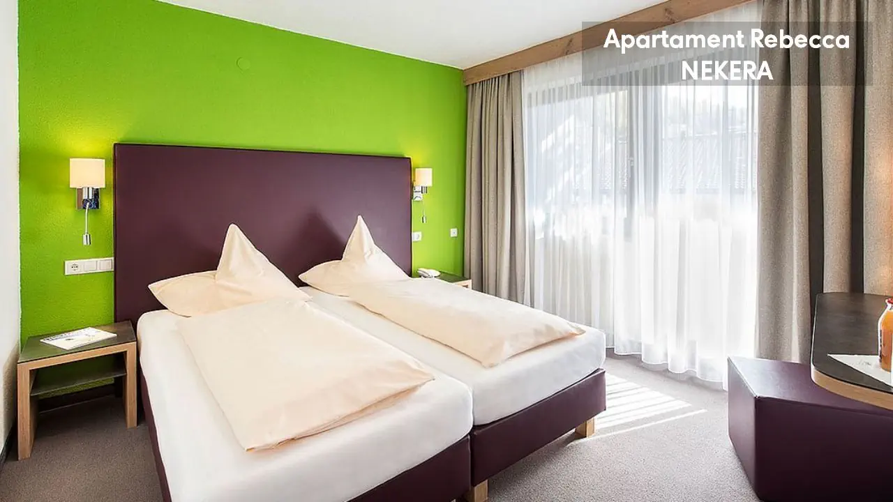 Pokój dwuosobowy Sölden: ok. 25 m2, mogący zakwaterować do dwóch osób, jedno łóżko podwójne, TV, Wi-Fi, radio, sejf, prywatna łazienka (prysznic, toaleta, umywalka, suszarka do włosów, lustro), współdzielony balkon. Pokój dwuosobowy Erhart: ok. 30 m2, mogący zakwaterować do dwóch osób, jedno łóżko podwójne, część wypoczynkowa z fotelami; poza tym wyposażony jak pokój dwuosobowy Sölden. Apartament Rebecca: ok. 40 m2, mogący zakwaterować dwie osoby dorosłe i dziecko, sypialnia z łóżkiem podwójnym i pokój dzienny z sofą; poza tym wyposażony jak pokój dwuosobowy Sölden.
