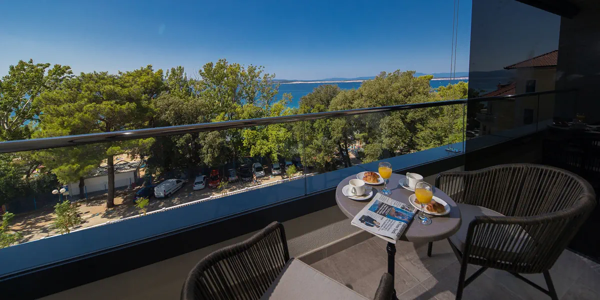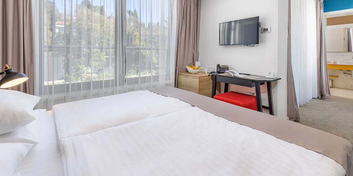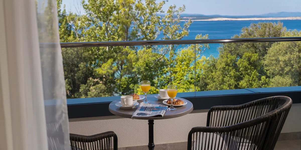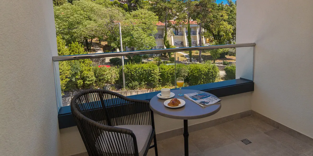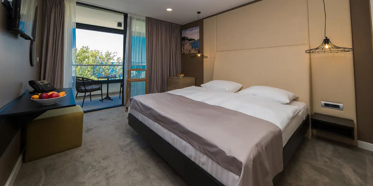 Klimatyzowany pokój (26 m2) z TV, wifi, sejfem, mini barem, łazienką i balkonem z częściowym widokiem na morze