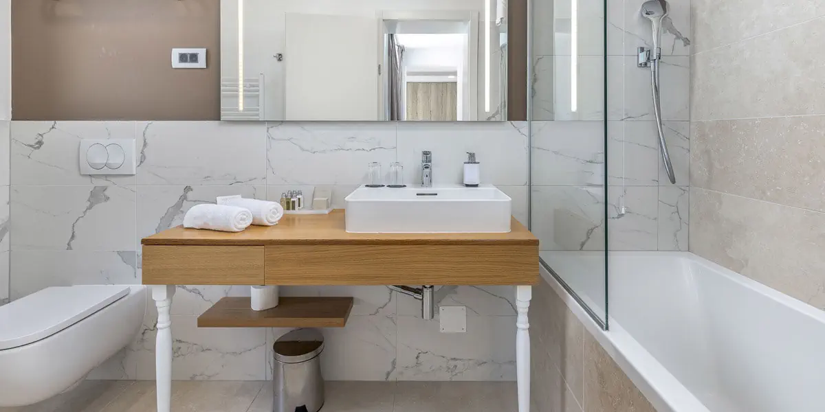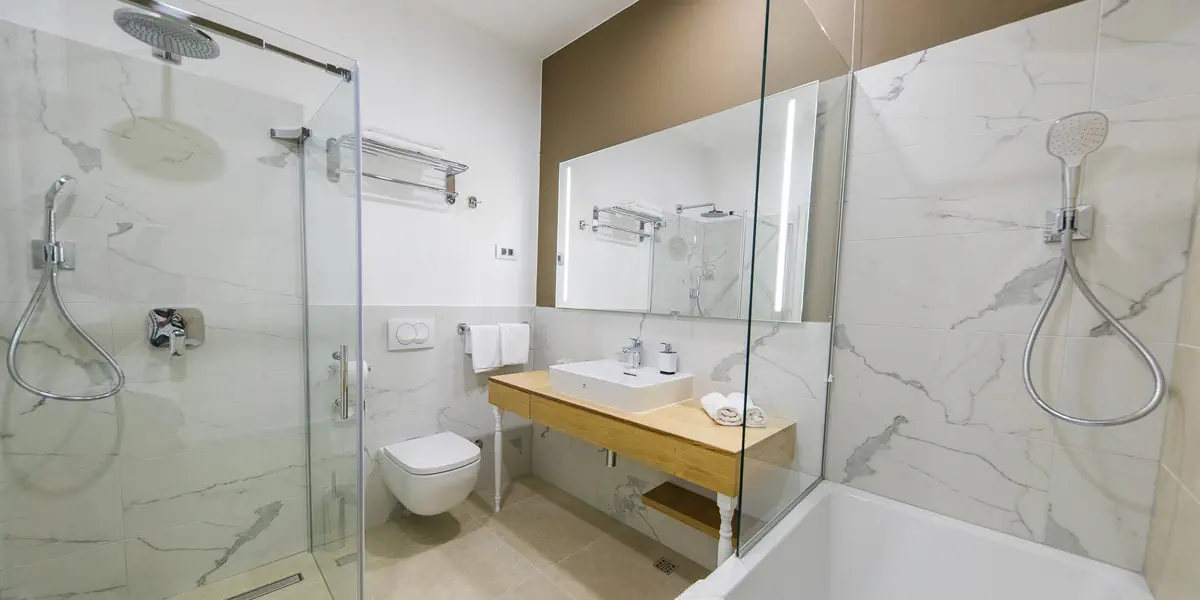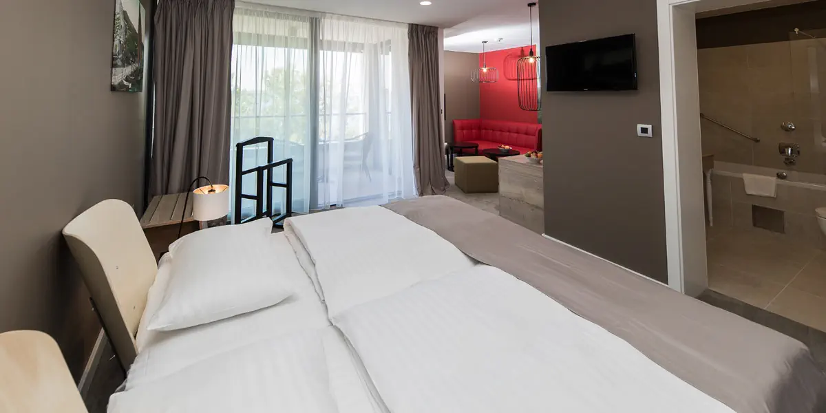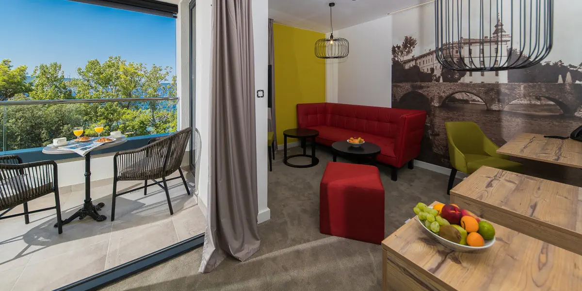 Przestronny apartament (39 m2) z wygodną strefą wypoczynkową, mini barem, łazienką i balkonem z częściowym widokiem na morze