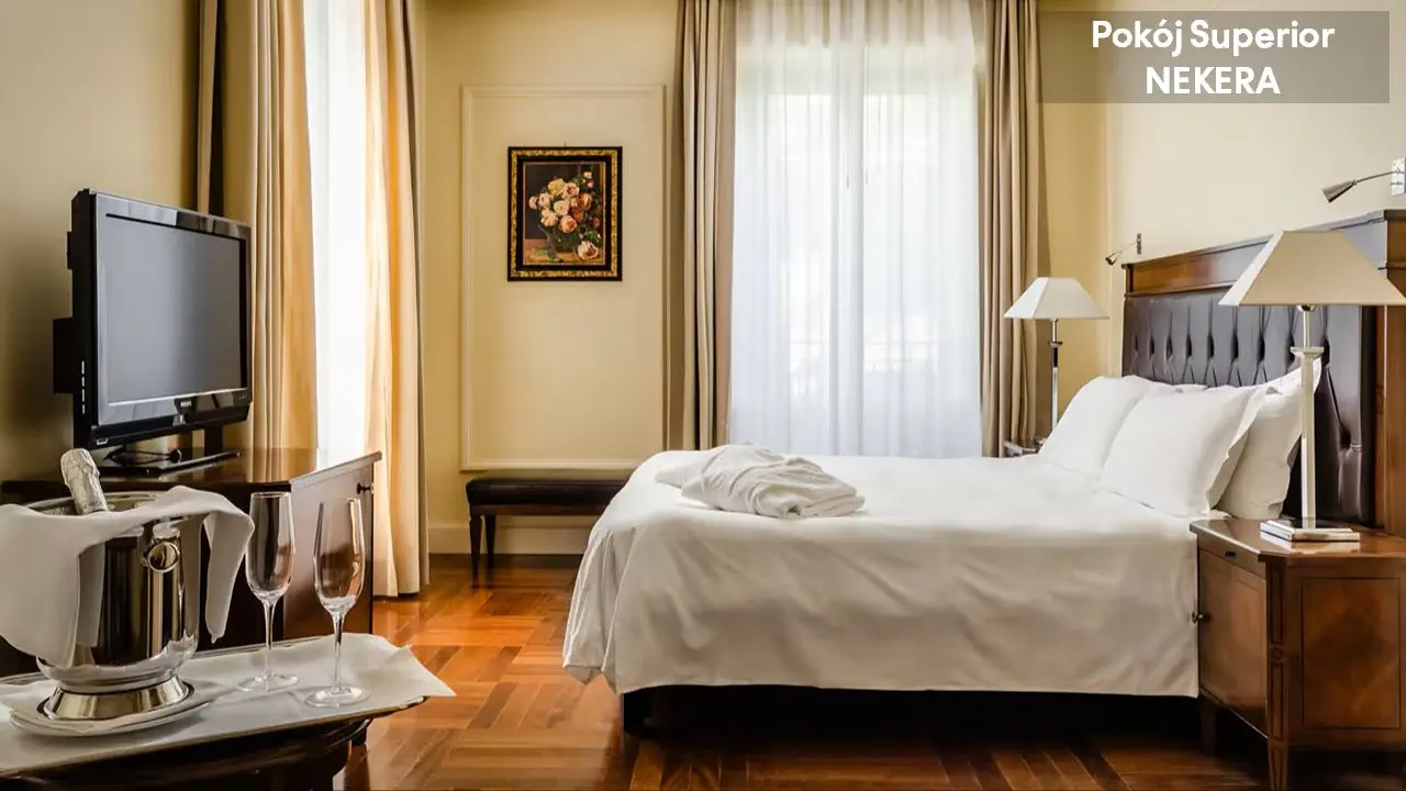 Pokój Dwuosobowy, ok. 20 m², dla max 2 osób dorosłych, łóżko podwójne lub 2 łóżka pojedyncze, klimatyzacja, sejf, TV-Sat., telefon, minibar (płatny, prywatna łazienka (wanna lub prysznic, umywalka, lustro, toaleta, mini kosmetyki, suszarka do włosów). Pokój Superior ok. 24 m², dla max 2 osób dorosłych, łóżko podwójne lub 2 łóżka pojedyncze, klimatyzacja, sejf, TV-Sat., telefon, minibar (płatny, prywatna łazienka (wanna lub prysznic, umywalka, lustro, toaleta, mini kosmetyki, suszarka do włosów), balkon lub taras.