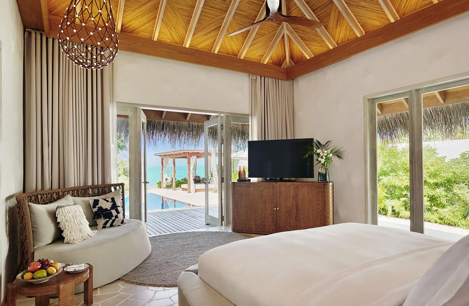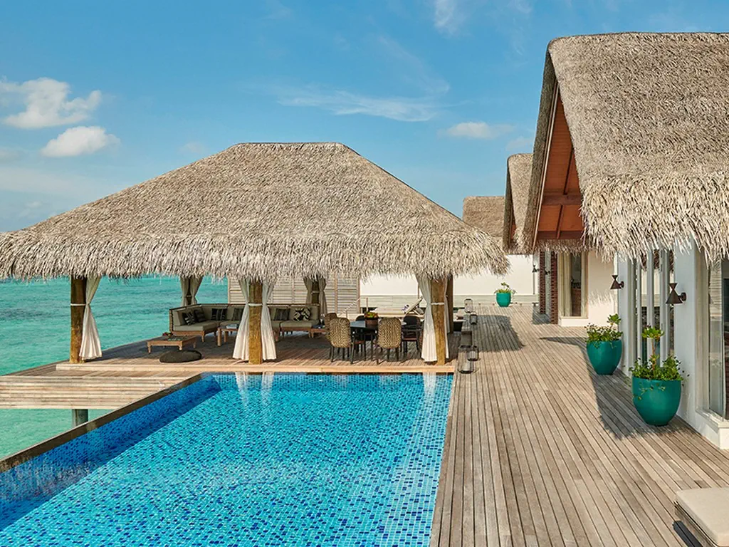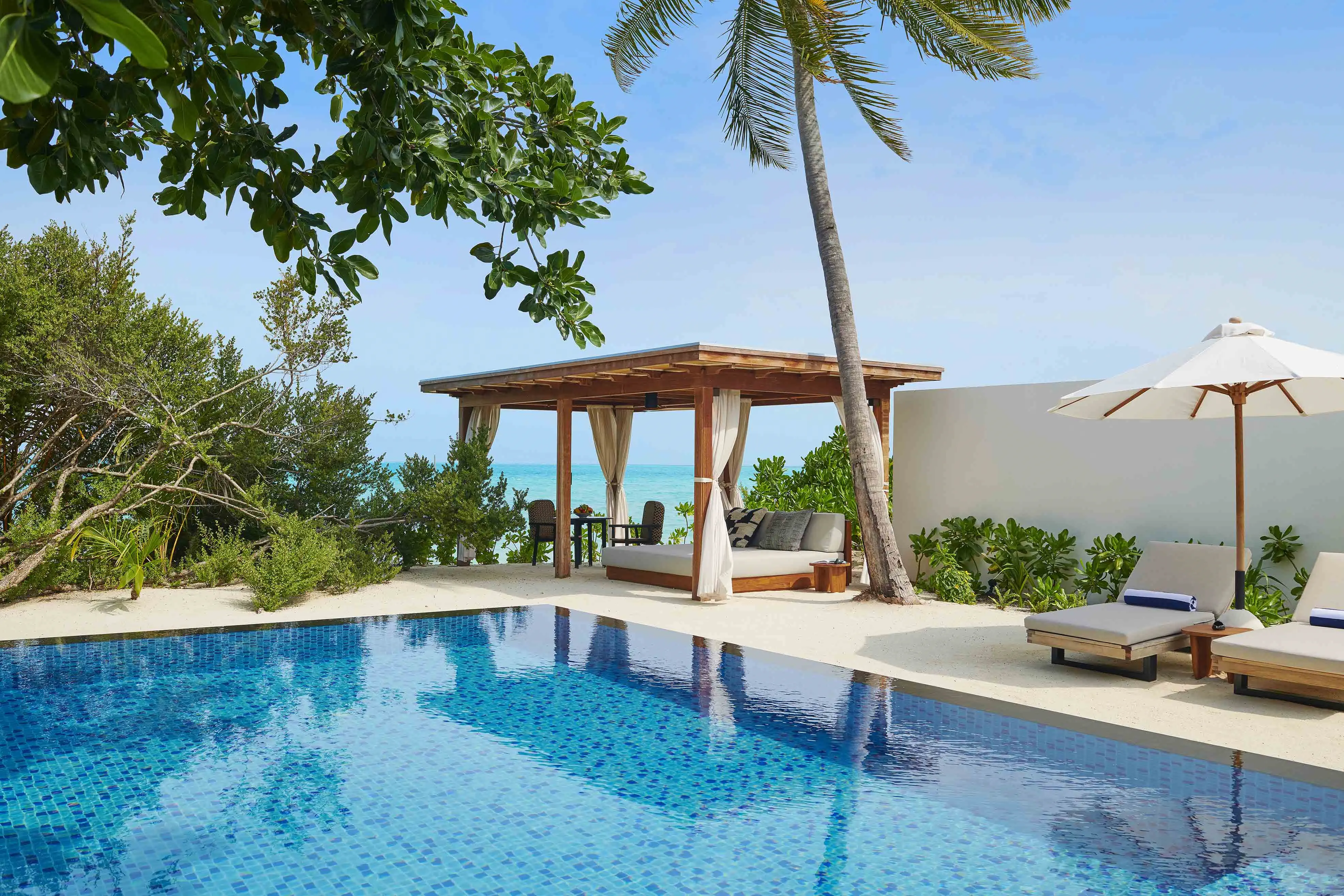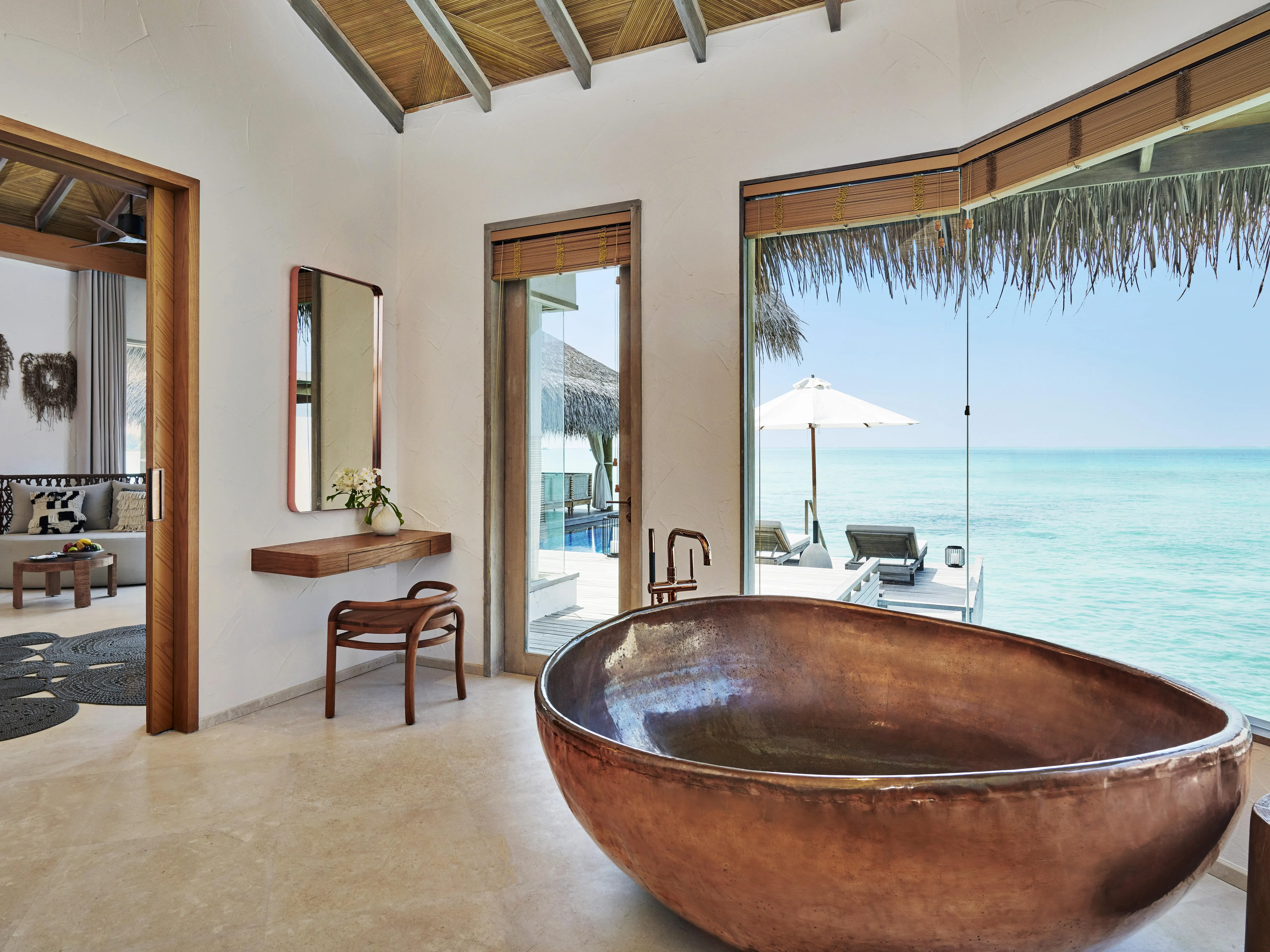 Dla max. 4 osób, Przestrzeń zewnętrzna: Taras, Kanały telewizji: Angielski, Telefon w pokoju, wanna, prysznic, wanna i prysznic , Powierzchnia pokoju: ok. 525 m2, Dostawka: łóżko standardowe, Rodzaj podłogi: drewno, Sprzątanie codziennie, Salon, część jadalniana, miejsce do pracy, 1 sypialnia, Maksymalna liczba osób dorosłych: 3, Maksymalna liczba dzieci: 2, Concierge (bezpłatnie), Frontalny widok na plażę,Widok na lagunę,Widok na morze, Bezpośredni dostęp do plaży, Prywatny basen, Liczba łazienek: 1, Liczba toalet: 1, Zestaw do parzenia kawy i herbaty, Klimatyzacja: Wybierz