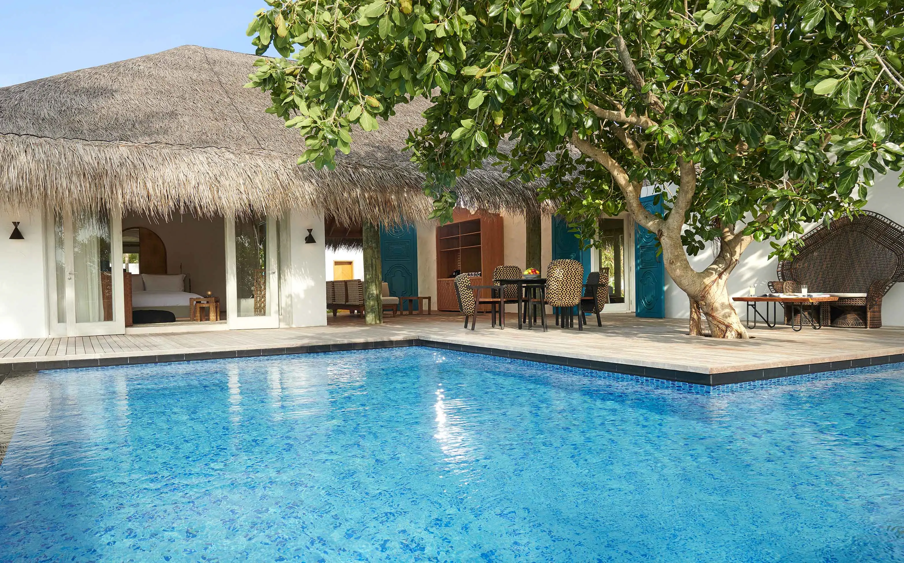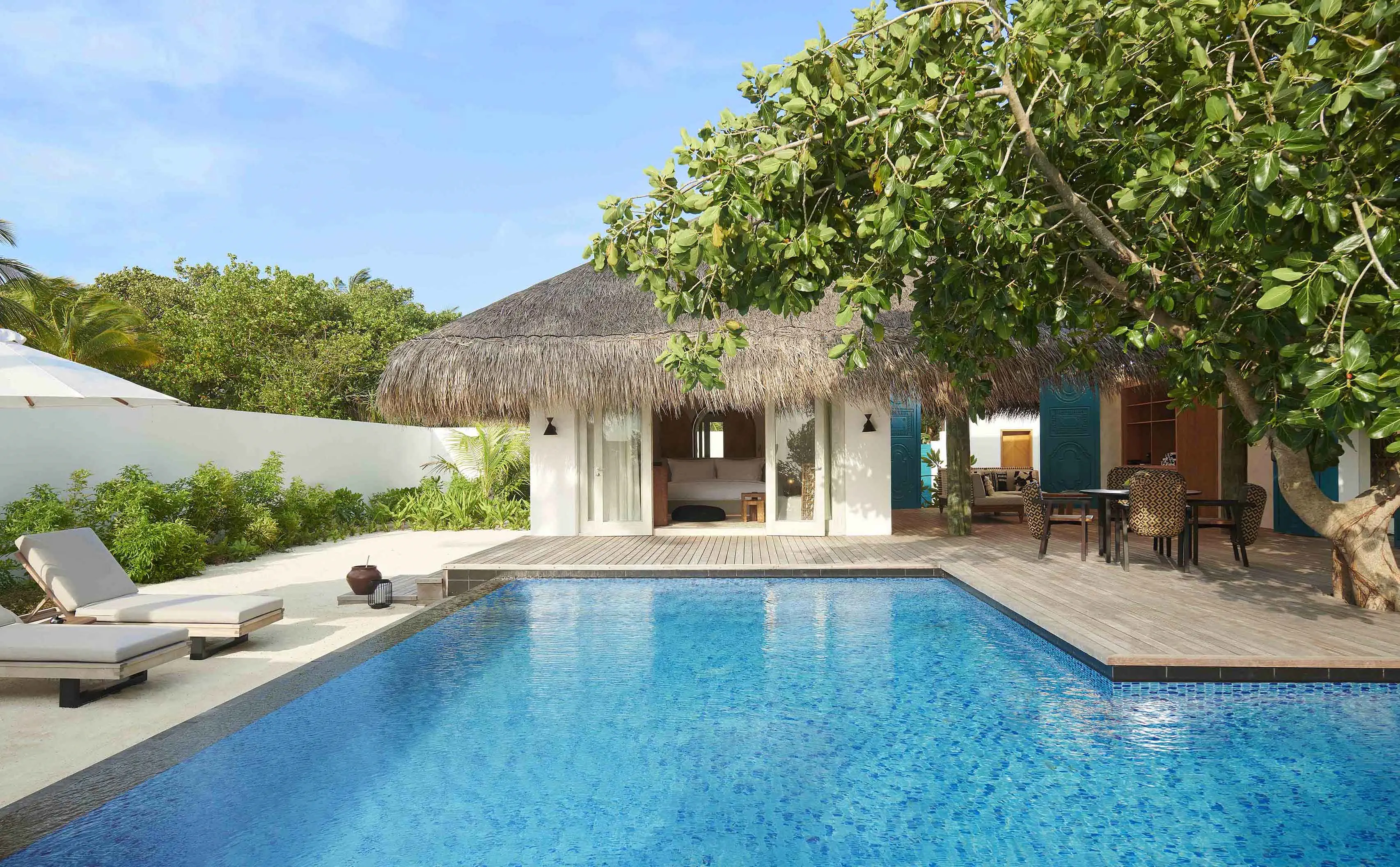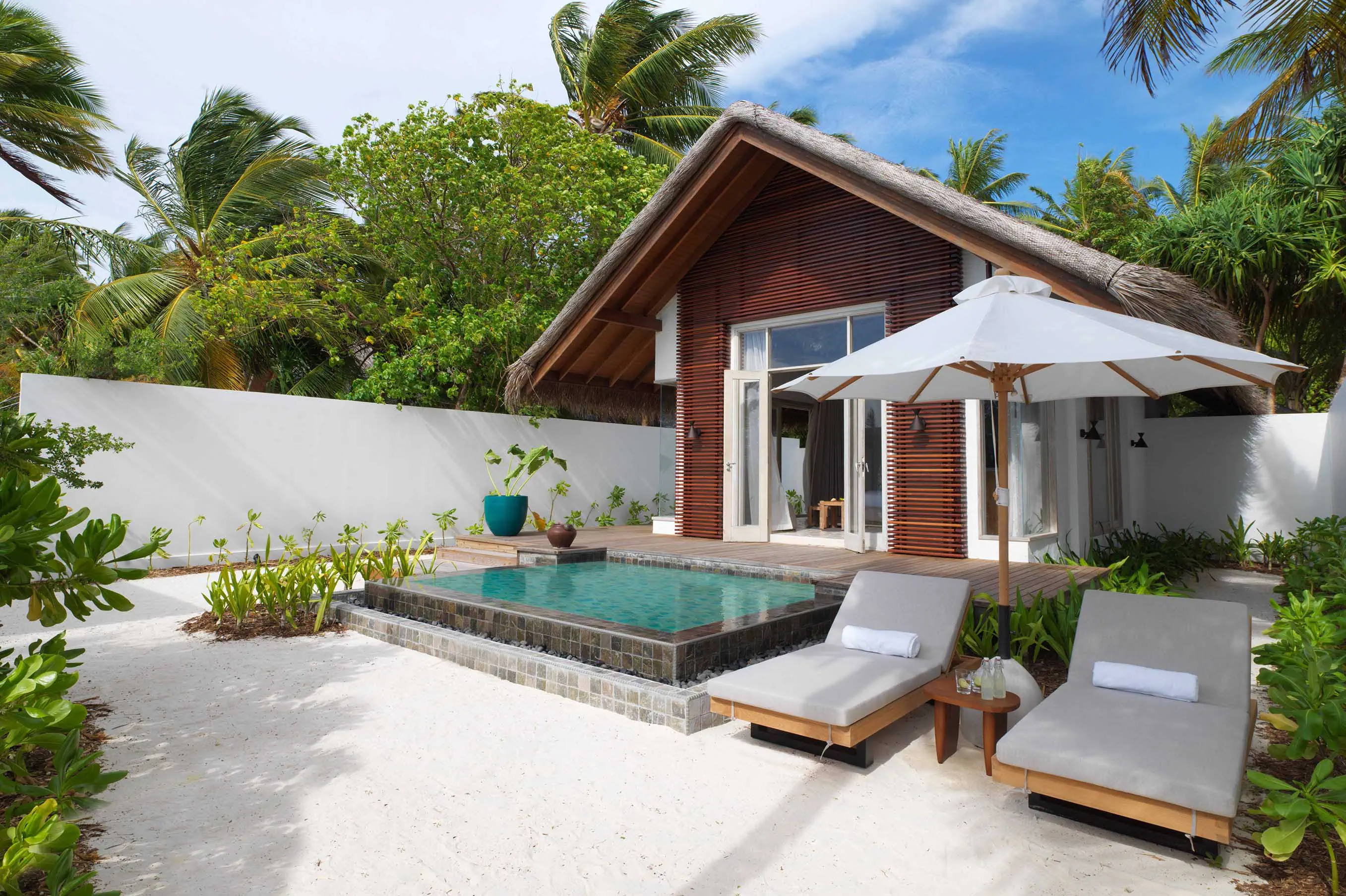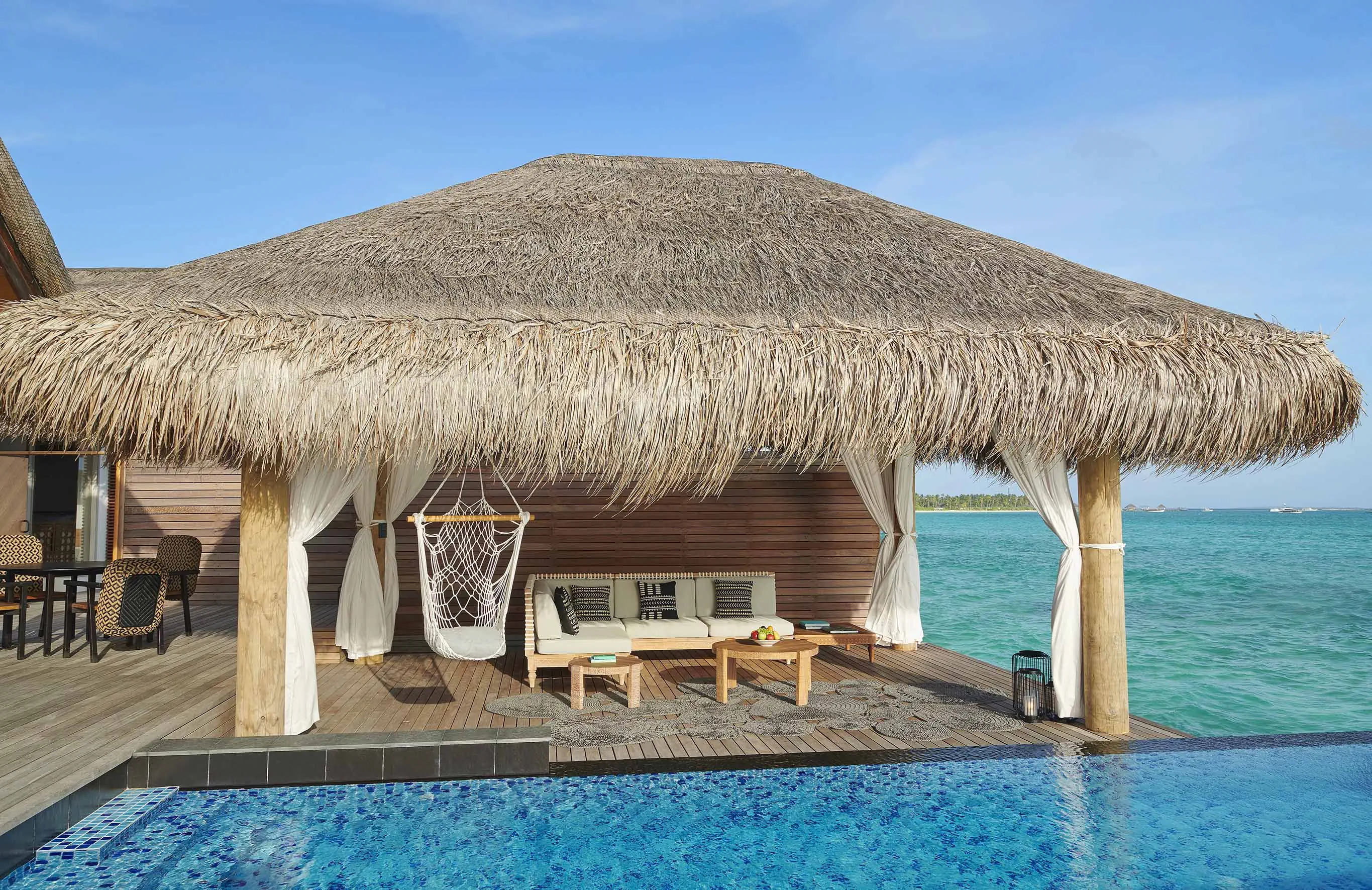 Dla max. 4 osób, Przestrzeń zewnętrzna: Taras, Kanały telewizji: Angielski, Telefon w pokoju, wanna, prysznic, wanna i prysznic , Powierzchnia pokoju: ok. 525 m2, Dostawka: łóżko standardowe, Rodzaj podłogi: drewno, Sprzątanie codziennie, Salon, część jadalniana, miejsce do pracy, 1 sypialnia, Maksymalna liczba osób dorosłych: 3, Maksymalna liczba dzieci: 2, Concierge (bezpłatnie), Frontalny widok na plażę,Widok na lagunę,Widok na morze, Bezpośredni dostęp do plaży, Prywatny basen, Liczba łazienek: 1, Liczba toalet: 1, Zestaw do parzenia kawy i herbaty, Klimatyzacja: Wybierz