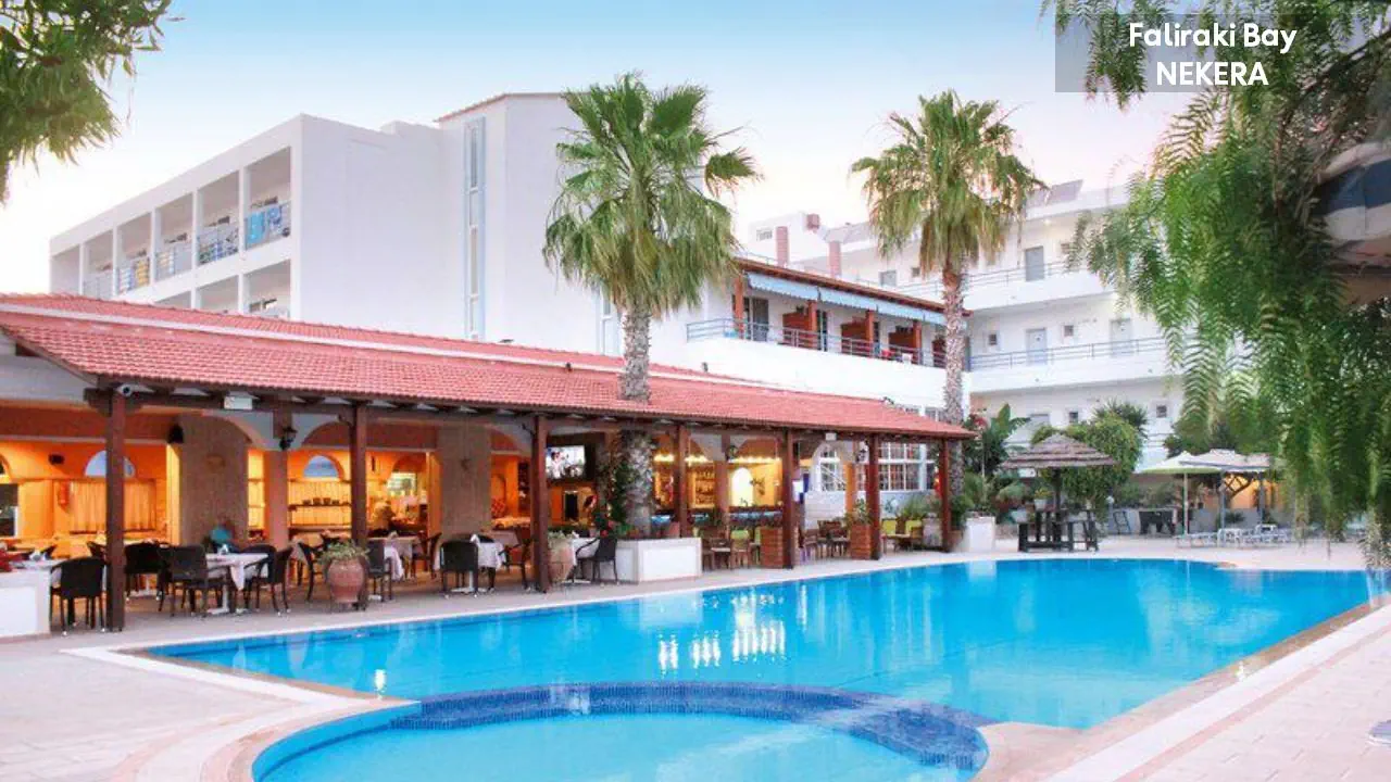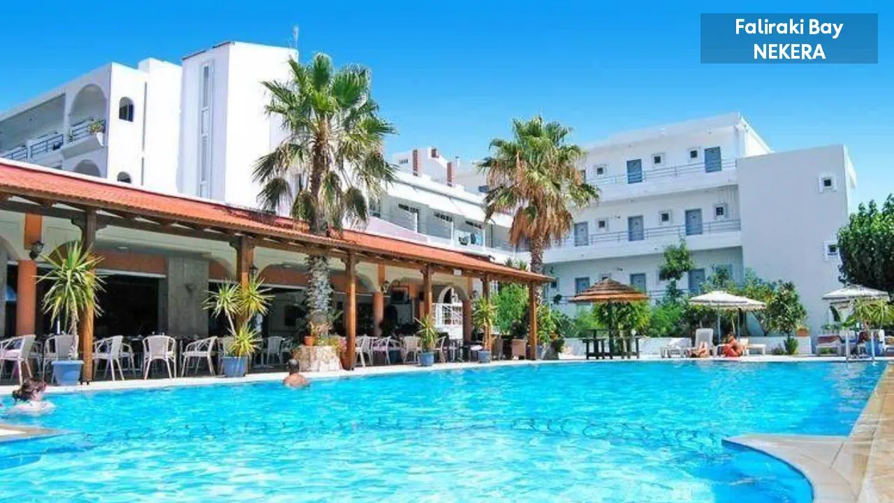 piaszczysto-żwirowa plaża w Faliraki oddalona o ok. 150 m. od hotelu. Serwis plażowy za opłatą.