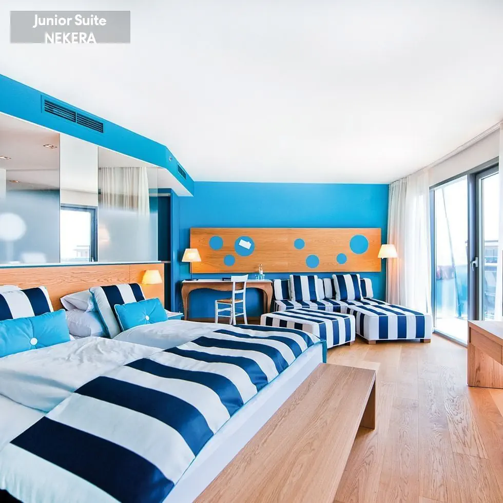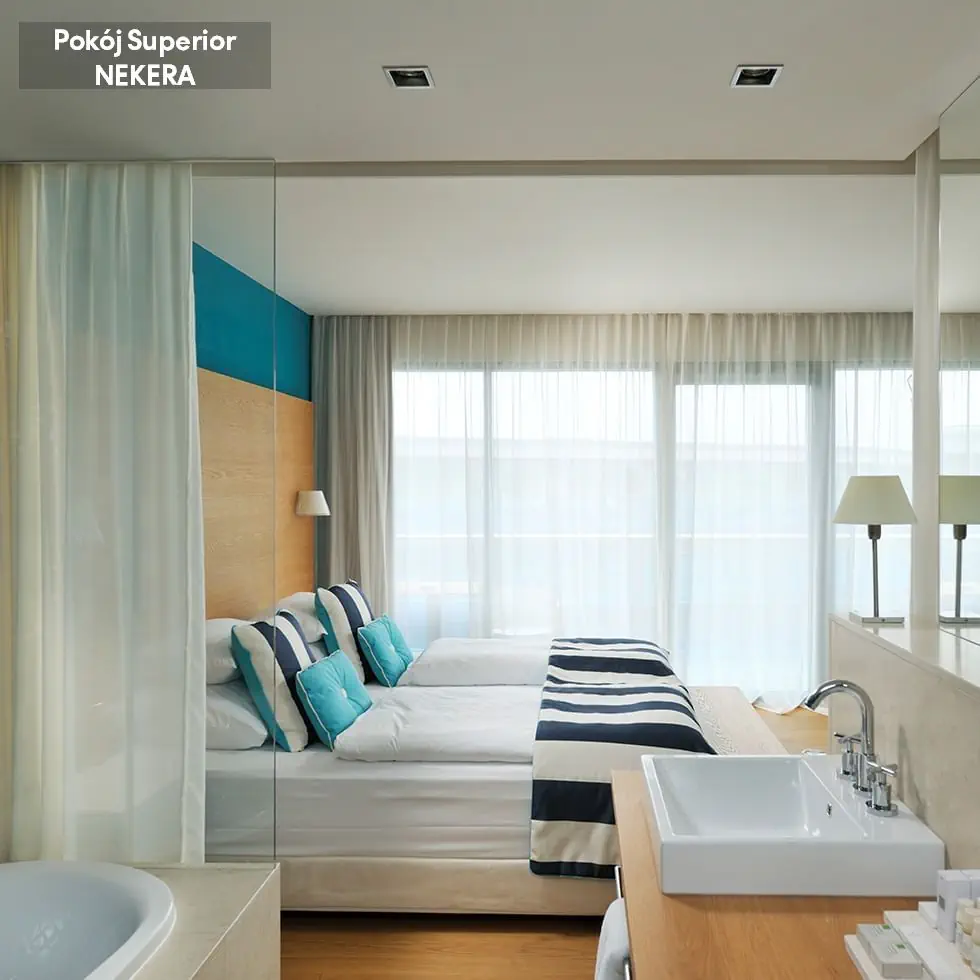 komfortowe pokoje dwuosobowe Superior (DBL SUPERIOR): ok. 32 m2, klimatyzacja/ogrzewanie (sterowane indywidualnie), kącik wypoczynkowy, TV-sat., telefon, sejf, minibar, balkon od strony parku, wanna lub prysznic, WC, suszarka, zestaw plażowy (szlafrok, ręcznik, kapcie). Pokoje dwuosobowe Superior od strony morza (DBL SUPERIOR SV). Pokoje dwuosobowe Deluxe od strony morza (DBL DELUXE SV): ok. 32m2, wyposażone jak pokoje Superior. Junior Suite od strony parku (JS PARK VIEW): przestronniejsze, ok. 40 m2, wyposażone jak pokoje Superior. Dla 2 osób dorosłych i 1 dziecka poniżej 12 lat.