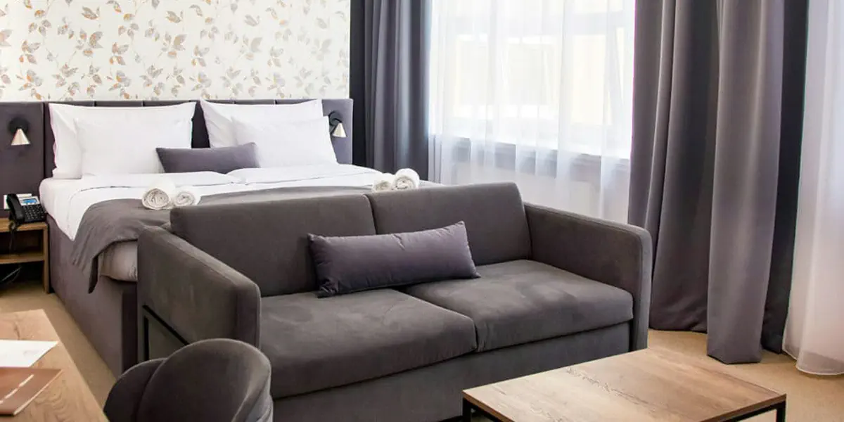 Nowocześnie urządzony, przestronny i jasny pokój typu deluxe z wygodnym łóżkiem małżeńskim i rozkładaną sofą dla dwóch osób. Idealny dla pary lub rodziny z dzieckiem.