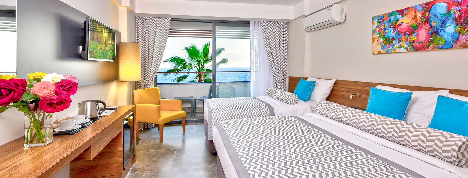 Położenie: Nowoczesny hotel położony nad samym morzem z bezpośrednim dostępem do słynnej plaży Kleopatry. Oddalony zaledwie ok. 3 km od centrum Alanyi z pięknym portem, licznymi barami, restauracjami, bazarem i sklepami. Najbliższy przystanek lokalnej komunikacji znajduje tuż obok hotelu. Ok. 100 m od hotelu znajduje się promenada, którą można dojść do centrum Alanyi. Plaża: Hotel położony jest tuż przy słynnej plaży Kleopatry. Na plaży leżaki i parasole dostępne bezpłatnie. Ręczniki kąpielowe dostępne za opłatą 2 EUR/ręcznik/dzień, depozyt 5 EUR dostepne od 09:00-11:00. Plaża jest piaszczysta z drobnym żwirkiem, a jej rozmiar może zależeć od pływów morza. Do dyspozycji gości: Recepcja, winda, przestronne lobby, restauracja z przepięknym widokiem na morze oraz zamek w Alanyi, klimatyczny bar przy basenie ze stolikami na tarasie położonymi pod pięknymi, dającymi cień drzewami kauczukowymi. Goście hotelu mogą korzystać z niewielkiego basenu, otoczonego tarasem słonecznym z bezpłatnymi leżakami i parasolami. Wyżywienie: All Inclusive: śniadania (07:30-10:00), pozne sniadanie (10:00-10:30), lunch (12:30-14:00) i obiadokolacje (19:30-21:00) w formie bogatego bufetu w restauracji głównej. Ponadto: przekąski w ciągu dnia (15:00-17:00), lody, kawa i herbata (17:00-18:00). Lokalne napoje bezalkoholowe i alkohole (10:30-23:00). Płatne dodatkowo: napoje importowane, kawa po turecku oraz świeżo wyciskane soki. Program sportowy i animacyjny: Hotel prowadzi animacje w wersji soft: dwa razy w tygodniu pokazy tureckiego folkloru i tańca brzucha. Ponadto: tenis stołowy i rzutki. Płatne dodatkowo: sporty wodne na plaży w okolicy hotelu. Internet: Bezpłatny Internet Wi-Fi na terenie całego hotelu. Kategoria lokalna: **** Strona www: