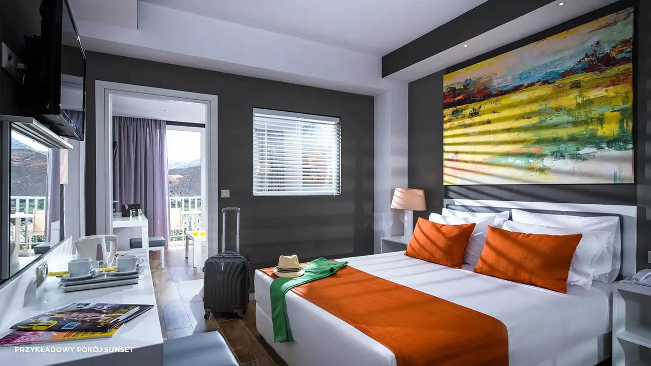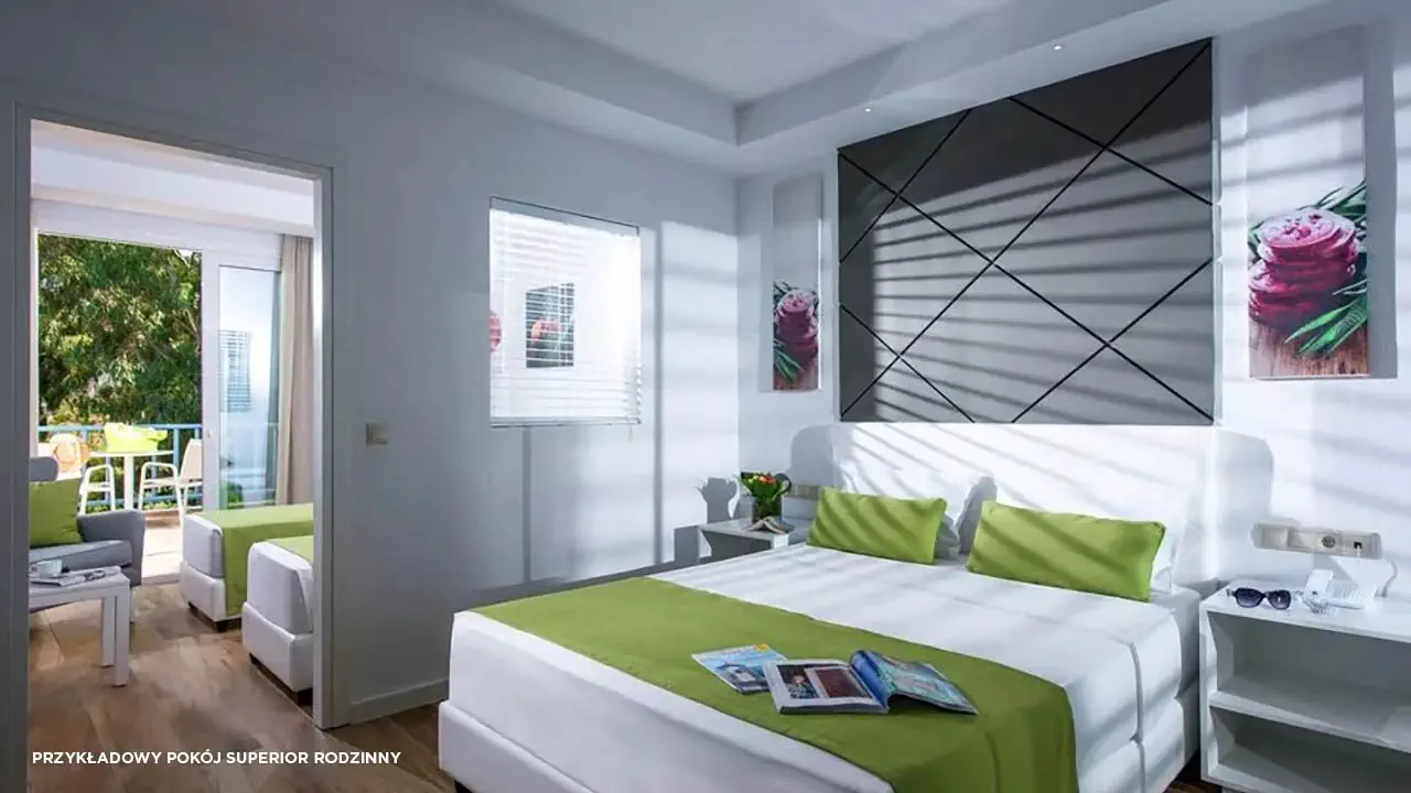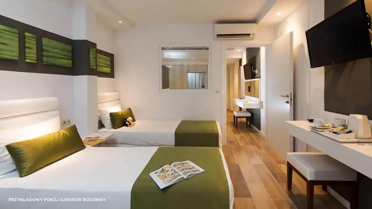 Standard• 2-3 os. (ok. 21-25 m2)• dostawka dla 3. os. wyłącznie dla dziecka do 13 lat• klimatyzacja indywidualnie sterowana• Wi-Fi (bezpłatne)• sejf (bezpłatny)• TV-SAT, telefon• mini lodówka• zestaw do parzenia kawy i herbaty• balkon lub taras• łazienka - wanna/prysznic, suszarka• widok na morze za dopłatąPokój sea front• 2-3 os. (ok. 28 m2)• dostawka dla 3. osoby• widok na morze• mini bar (bezpłatny, uzupełniany codziennie)• szlafrok i kapcie• wyposażony jak pokój standardRodzinny superior• 2-4 os. (ok. 32 m2)• dostawka dla 3. i 4. osoby• 2 pomieszczenia (oddzielone drzwiami)• wyposażony jak pokój standardPokój rodzinny sea front• 2-4 os. (ok. 38 m2)• dostawka dla 3. i 4. os. (dostawka dla 4 os. wyłącznie dla dziecka do 13 lat)• 2 pomieszczenia (oddzielone przesuwnymi drzwiami)• mini bar (bezpłatny, uzupełniany codziennie)• szlafrok i kapcie• widok na morze• wyposażony jak pokój standardSunset Suite• 2-4 os. (ok. 34 m2)• dostawka dla 3. i 4. osoby (dostawka dla 3 i 4. os tylko dla dzieci do 13 lat)• 2 pomieszczenia (oddzielone drzwiami)• pokój tematyczny• balkon lub taras• wyposażony jak pokój standardSun room• 2-3 os. (ok. 25 m2)• dostawka dla 3. osoby• boczny/bezpośredni widok na morze• pokój tematyczny• balkon• wyposażony jak pokój standard