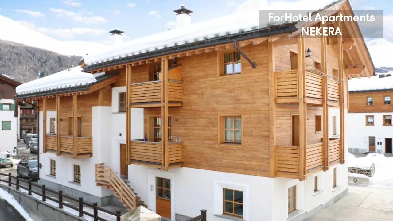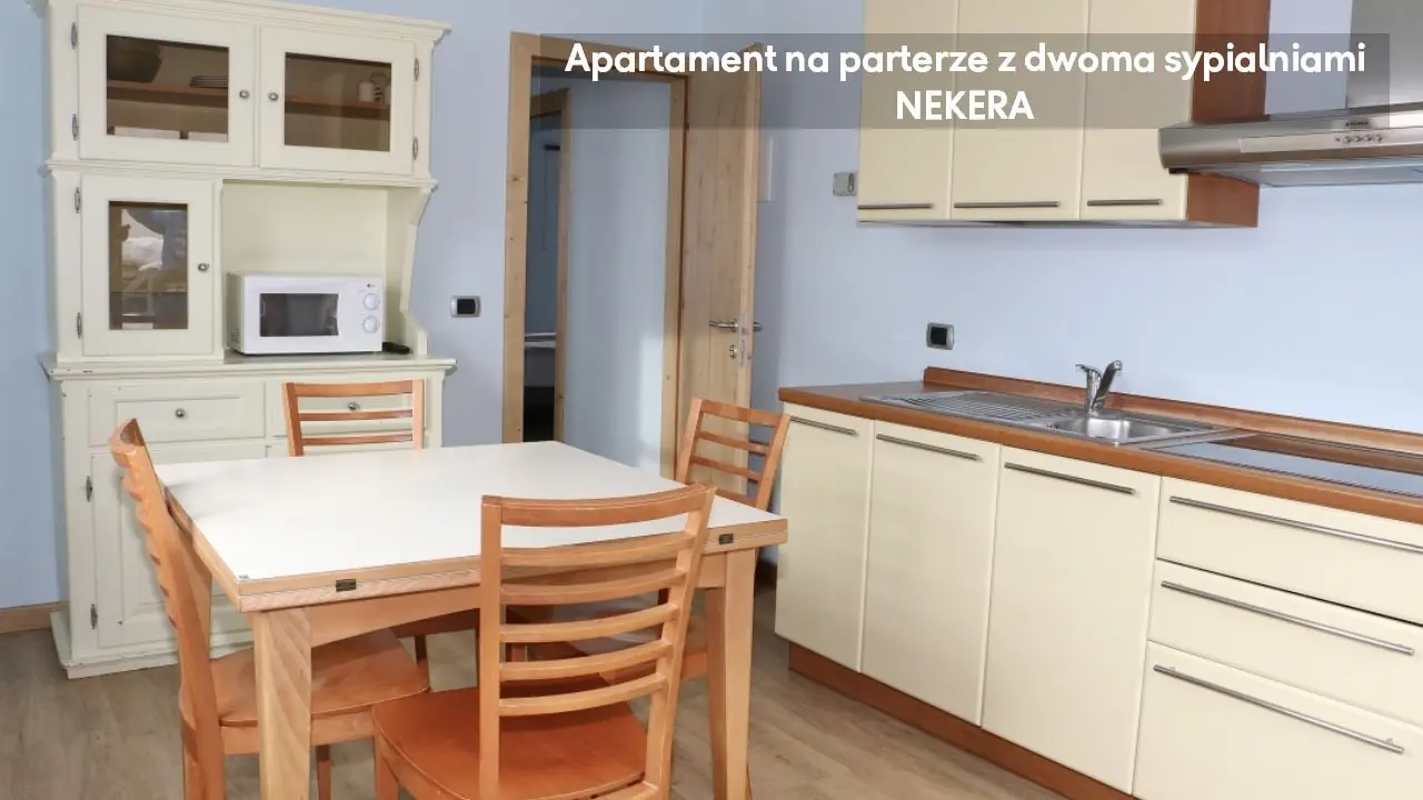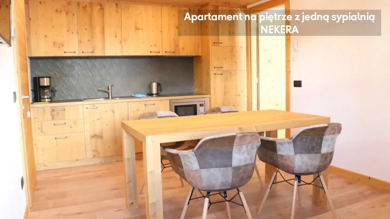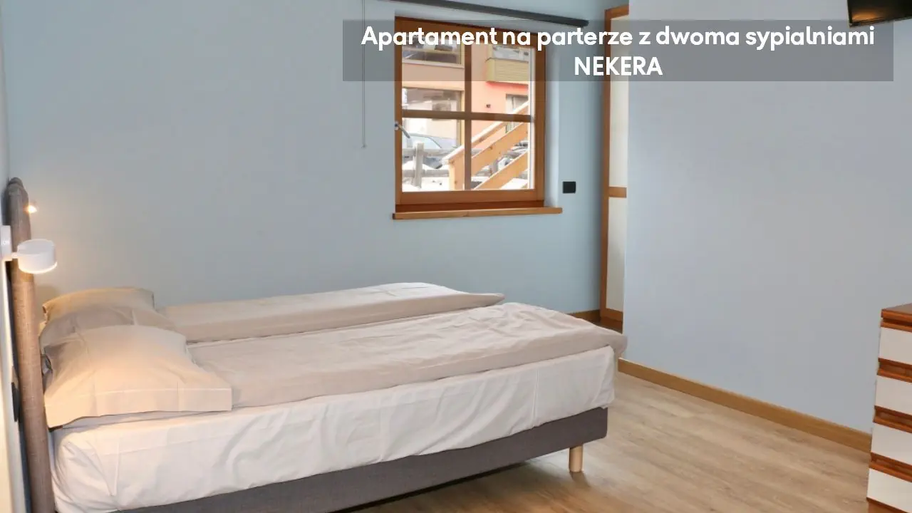 Apartament na piętrze z jedną sypialnią: ok. 32 m2, położony na pierwszym piętrze, mogący zakwaterować do czterech osób, sypialnia z łóżkiem podwójnym lub dwoma łóżkami pojedynczymi i pokój dzienny z sofą i aneksem kuchennym (kuchenka, zmywarka, czajnik, ekspres do kawy), stół z krzesłami, TV, prywatna łazienka (prysznic, bidet, toaleta, umywalka, suszarka do włosów, ręczniki), balkon z widokiem na stok narciarski. Apartament na parterze z jedną sypialnia: ok. 38 m2, położony na parterze, bez balkonu; poza tym wyposażony jak apartament na piętrze z jedną sypialnią. Apartament na parterze z dwoma sypialniami: ok. 43 m2, mogący zakwaterować do czterech osób, dwie sypialnia z łóżkami podwójnymi i część dzienna z aneksem kuchennym i stołem; pokój bez balkonu; poza tym wyposażony jak apartament na piętrze z jedną sypialnią.